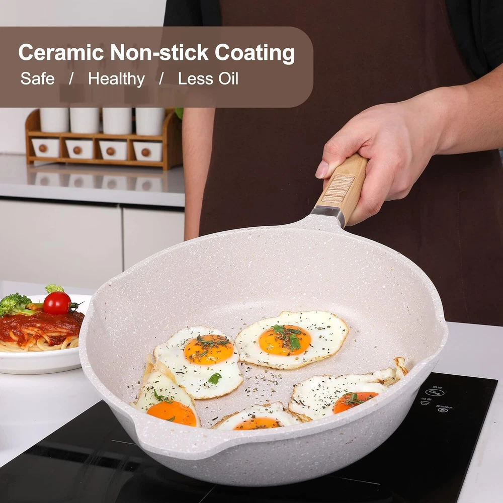 Unique & Convenient Design: The lid can be used in the frying pan or the soup pot, when you cook, you can watch the whole cooking process and master the progress of the whole cooking. The heat-resistant and anti-slip Ergonomic knob and handle are nice to grip, easy to maneuver, safe and anti-scald. Superior Quality: Excellent thermal conduction is one of the benefits of Aluminum bakeware- provides for even heat distribution through the baking process. Oven is safe for up to 450°. Great for amateur and advanced bakers alike! Have the Bakery in your kitchen! (Note: Bakelite of pans is not suitable for ovens) No Bending or Popping Bakeware Set: Incredibly durable bakeware; high quality and ultra durable carbon steel is superior to others; resists warping, popping, and bending, even in high temperatures, while helping to maintain even heat distribution for picture perfect results every time, rust and scratch resistant and designed to last a ; do not use on broil or over an open flame. Safety Non-Stick Granite Coating: The nonstick pans and pots set are made with a stone-derived nonstick coating inside out to deliver unprecedented nonstick performance - everything just slides right off with less oil & cleans up easily. The natural mineral nonstick coating is ultra-durable while remaining 100% free of PFOA, PTFA, lead, and cadmium. Healthy Nonstick Pans and Pots Set: The 33 piece kitchen pots and pans include a 9.5” frying pan, an 11" frying pan, a 5QT stockpot with lid, an 8QT stockpot, a 3QT saucepan with lid, 11 Kitchen utensils set, a storage bucket, a boundform pan, a round pan, a cookie sheet, a roaster pan+cooking pack, loaf pan, muffin pan and six sponges. The stylish cookware sets meet all your kitchen and family needs. On Dec 15, 2024 at 18:42:58 PST, seller added the following information: