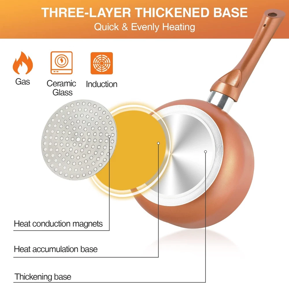 11 Piece Cookware Set - Includes 2 piece skillet set: 8" Frying pan & 9.5" Frying pan, 3 QT saute pot with lid, 2 piece saucepan set: 2 QT saucepan with lid &1.5 QT saucepan with lid, and 3 kitchen utensils, meeting your various demands of everyday cooking. Portable gift box packing for your gift choice. All pots/pans already assembled---it's a terrible experience for user to assemble by himself Heating Technology - The pots and pans set is suitable for a wide range of heating sources. Induction bottom cooks food evenly, compatible with gas or electric griddle and modular stoves or halogen cooktop. Low to medium heat is recommended. Note: Remember not to leave scoop in pan and heat without water Ceramic Non-stick Coating - All the copper pots and pans set are Ceramic coating both inside and outside providing superior non-stick performance. 100% free of PTFE/ PFOA/ lead/ cadmium. Non-stick Pans and Pots helps you cook food with less oil, and super easy to clean. - Enjoy healthy and happy life with our kitchenware set! Beautiful & Elegant Kitchen Pot and Pan Set - This pan set is aesthetically made for cooking presentable meals. Bright Copper color add vitality to your kitchen. Confidently invite friends and family for parties, Thanksgiving and Christmas Ergonomic Design - pot set features comfortable handles and tempered glass lids. - Handles were designed for comfort and safety, featuring non-slip, heat-resistant and easy-to-grip. Vented tempered glass lids can handle over 350°F. See-through clear lid provides convenience for observing food cooking