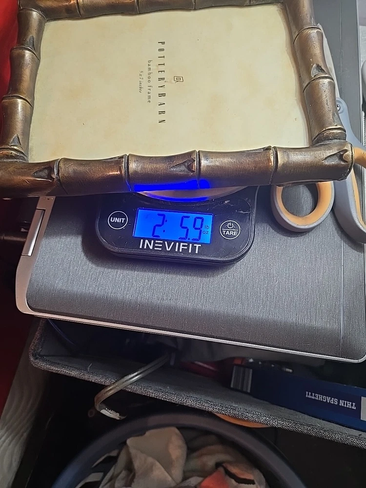 The Pottery Barn Bamboo Picture Frame is a rectangular brown frame designed to hold a 5 x 7 inch photo. Made of bamboo with clear glass, it features a rear-loading for easy photo insertion and can stand freely. This heavy frame weighs over 2.5 pounds and has dimensions of 6.5 inches in length, 8.5 inches in height, and a depth of .25. Perfect for all occasions, this frame is a stylish and durable option for displaying your cherished memories.