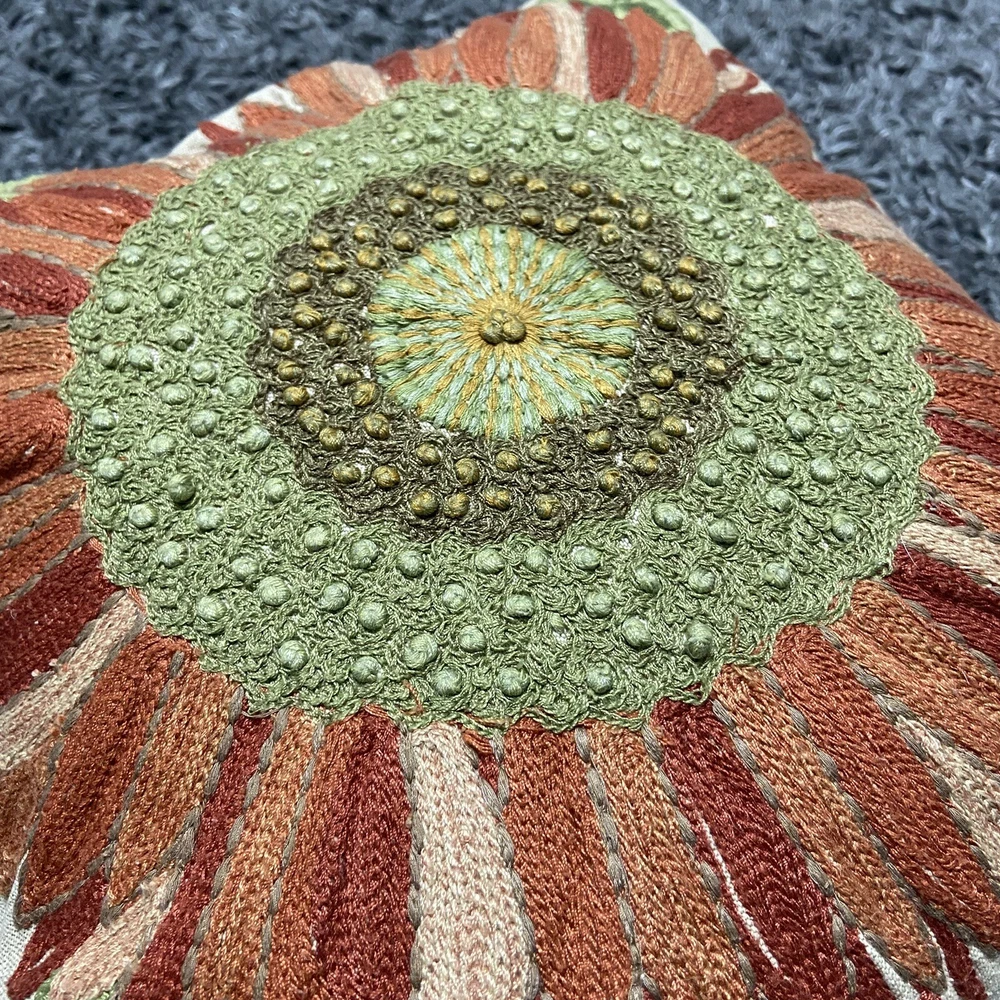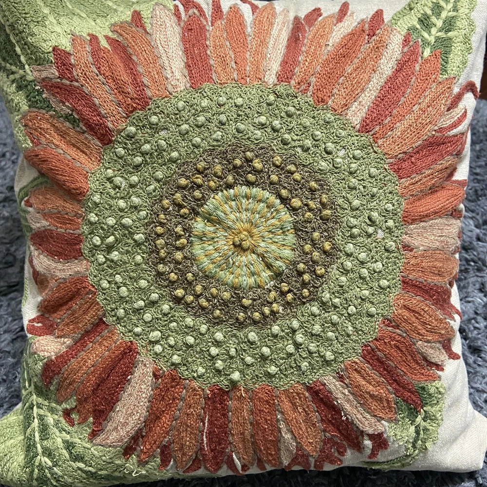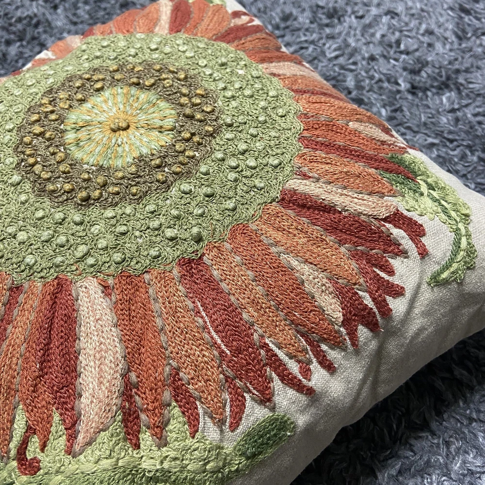Add a touch of nature to your home decor with this beautiful Pottery Barn Crewel Embroidered Sunflower 18"x18” Decorative Pillow Cover. The cover features a vibrant multicolor sunflower pattern with intricate embroidery that gives it a unique and decorative style. Made of 100% cotton, this pillow cover is perfect for anyone who loves flowers and nature. The square-shaped cover has a button closure type and fits an 18 x 18 inch pillow insert. It is perfect for use in any room of the house, including the living room, bedroom, or even outdoor spaces. This Pottery Barn Sunflower Pillow Cover is a great addition to any home decor and is perfect for those who want to add a touch of elegance to their living space.
