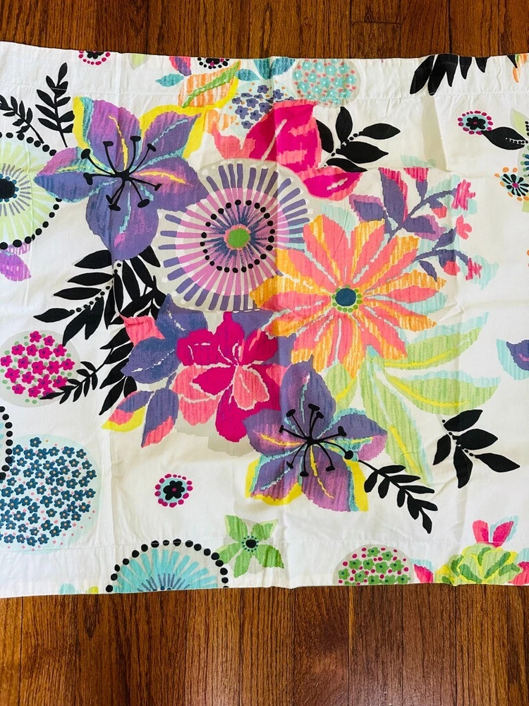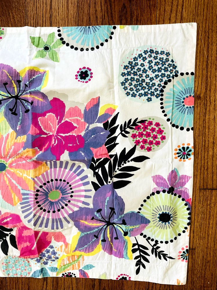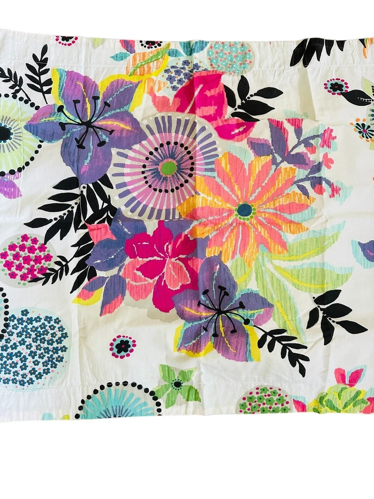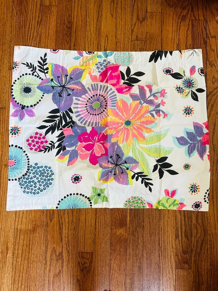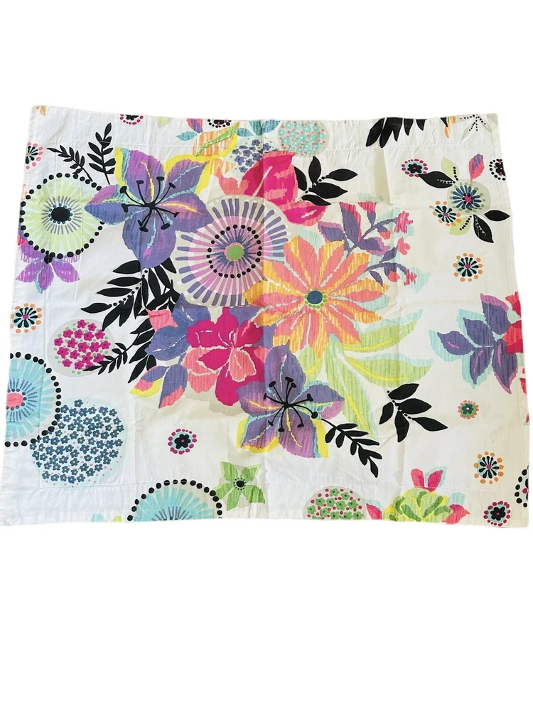 Pottery PB Teen Flower Power Bright Floral Cotton Pillow Sham 24" x 28" - 100% Cotton Envelope style sham reverses to aqua/green/blue solid color Faded stain on front side near sham corner, please see photo