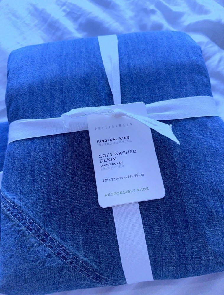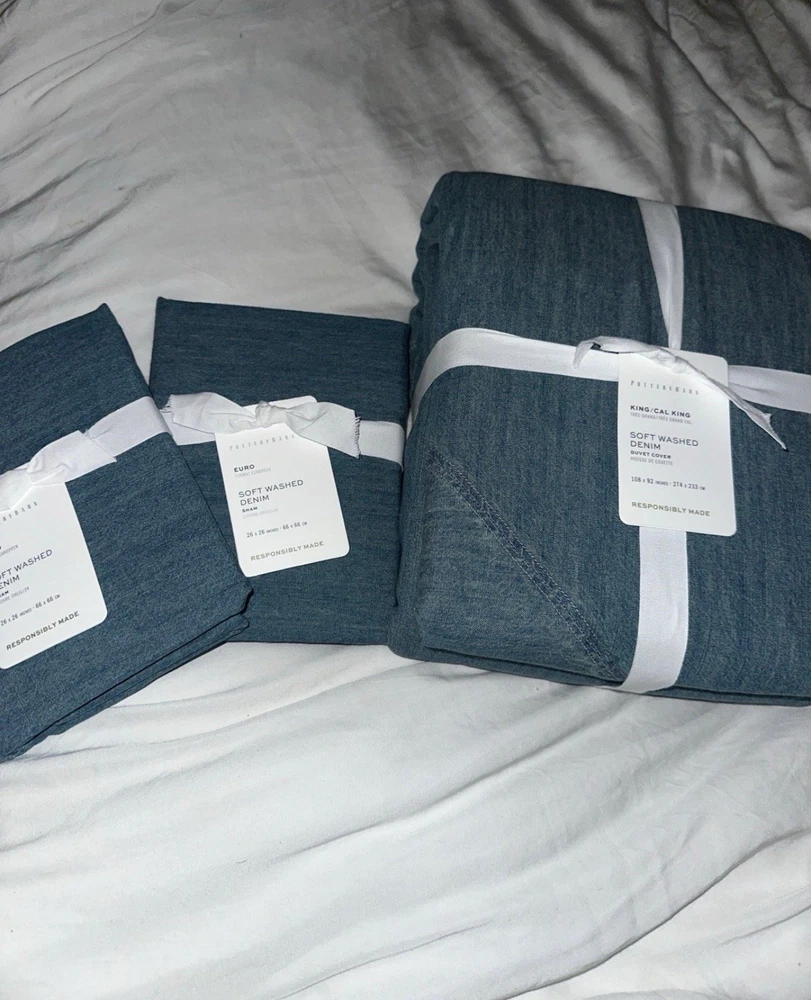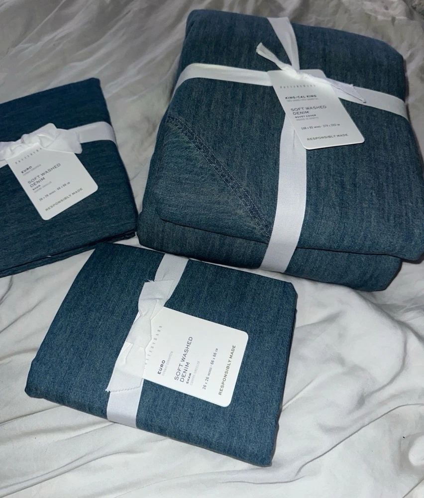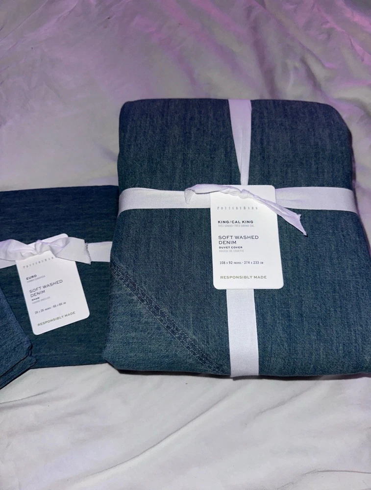 This is a king / California king size duvet 2 euro shams Brand new There are so many reasons to love denim. And just like your favorite jeans, its appeal goes far beyond a casual, relaxed look. The neutral blue hue blends seamlessly with various color palettes and patterns, providing a versatile base that's made for layering, making it one of our go-to favorites. PRODUCT DETAILS collapse CONSTRUCTION Made of 100% cotton. Duvet features a button closure with inner ties that keep insert in place; sham features an overlap closure.