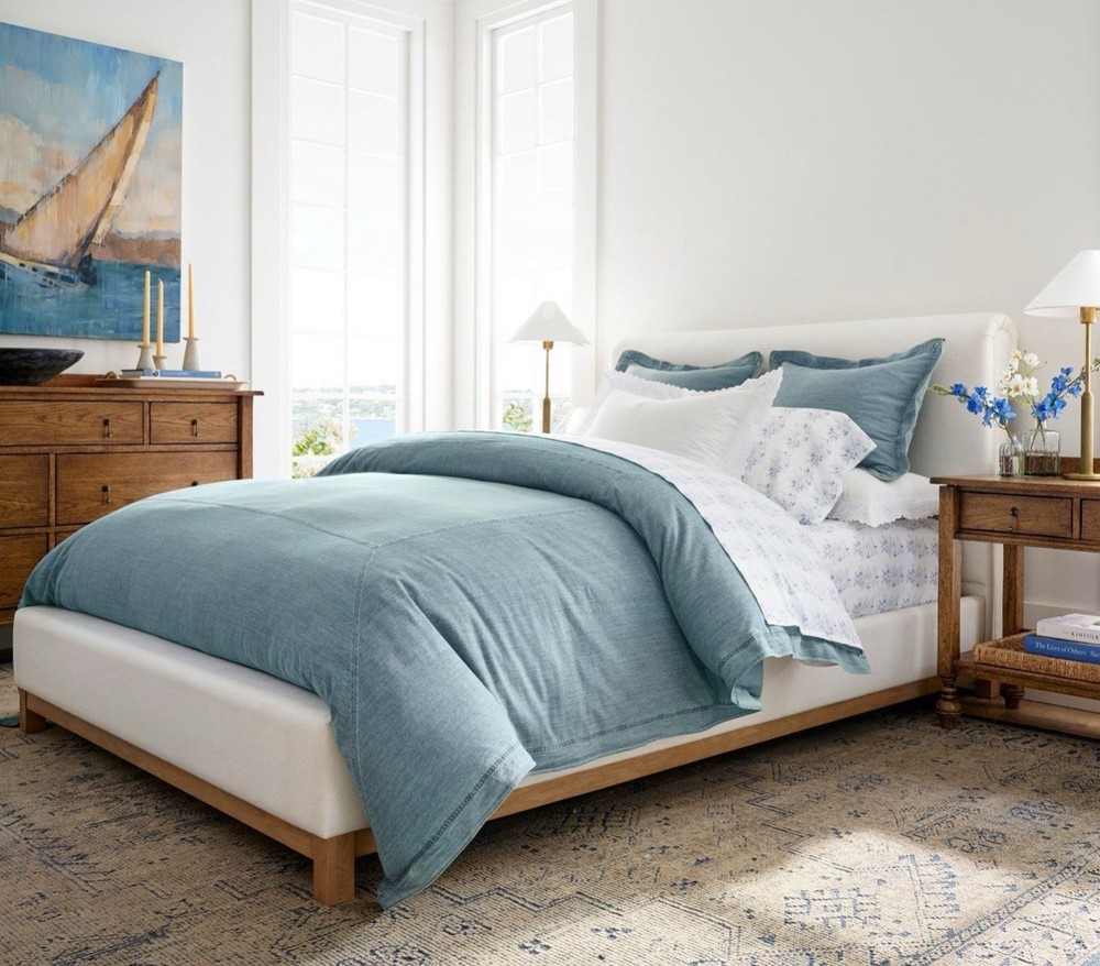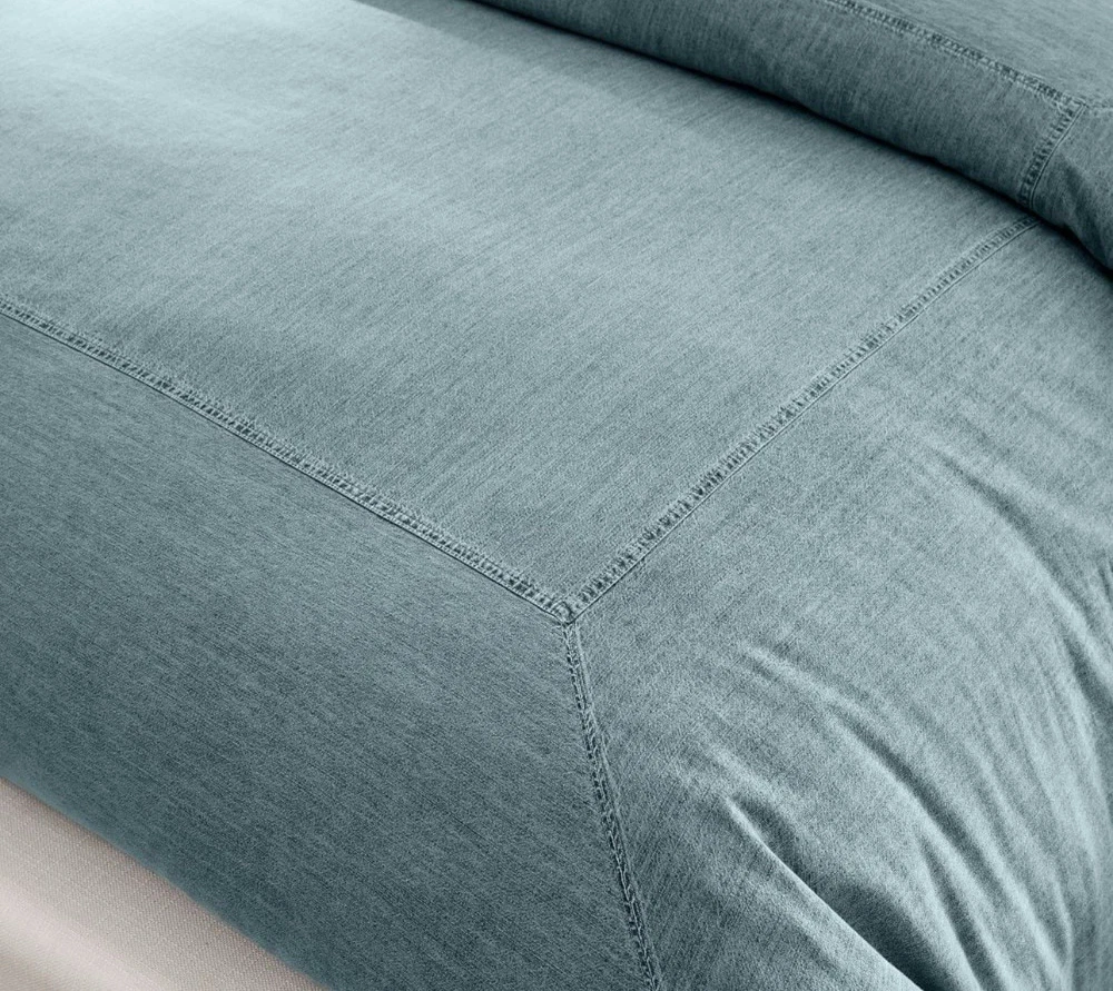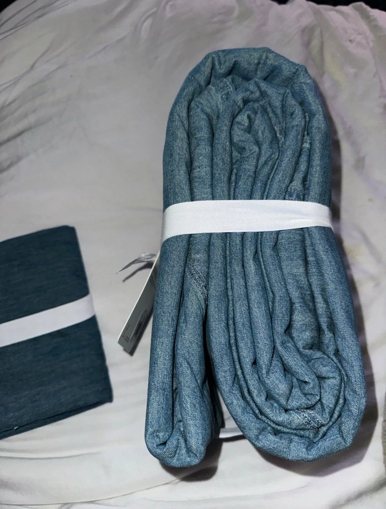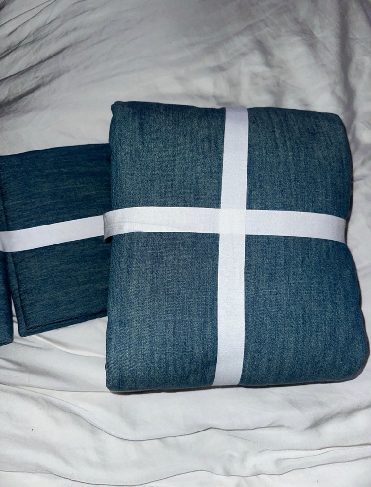 This is a king / California king size duvet 2 euro shams Brand new There are so many reasons to love denim. And just like your favorite jeans, its appeal goes far beyond a casual, relaxed look. The neutral blue hue blends seamlessly with various color palettes and patterns, providing a versatile base that's made for layering, making it one of our go-to favorites. PRODUCT DETAILS collapse CONSTRUCTION Made of 100% cotton. Duvet features a button closure with inner ties that keep insert in place; sham features an overlap closure.
