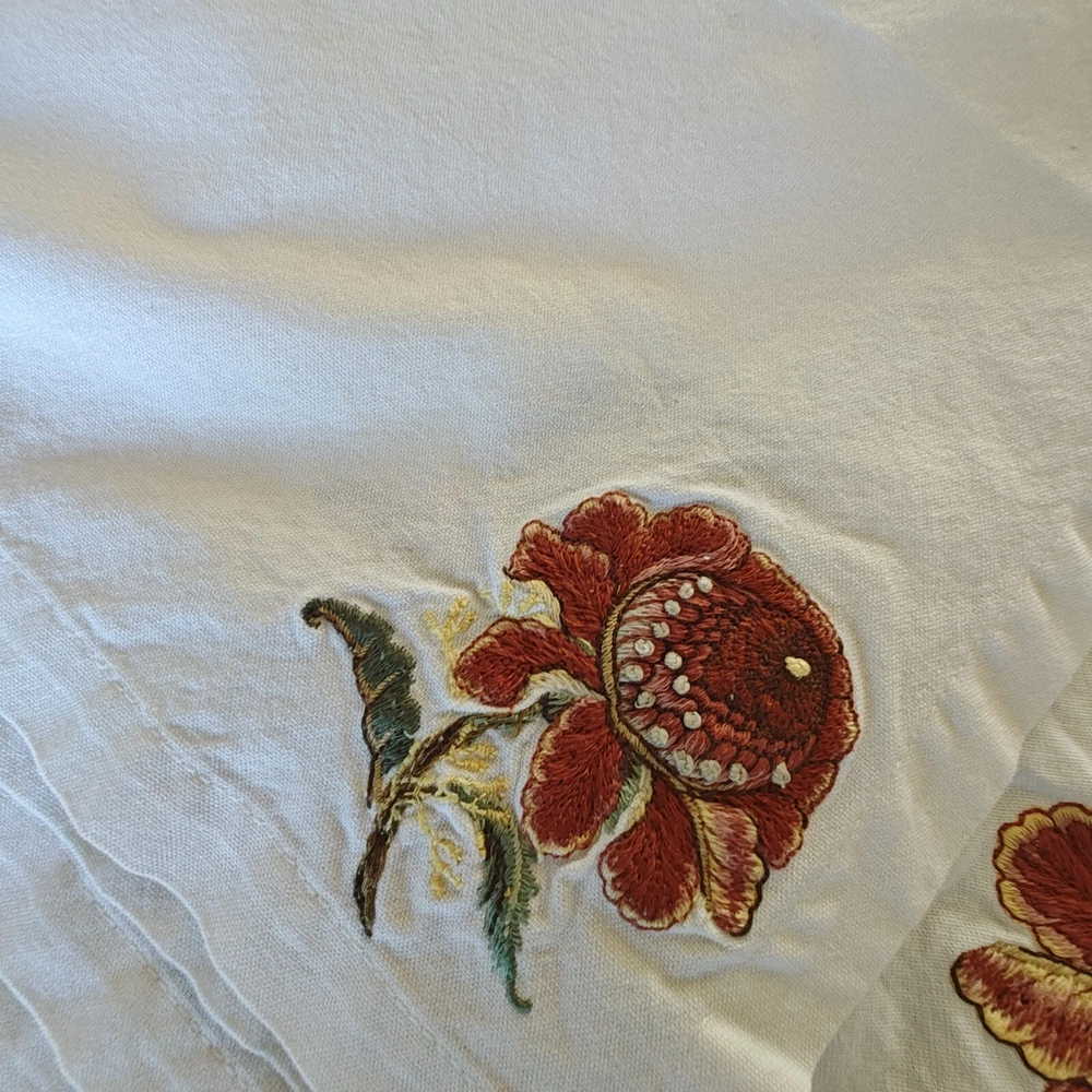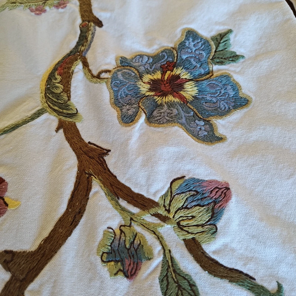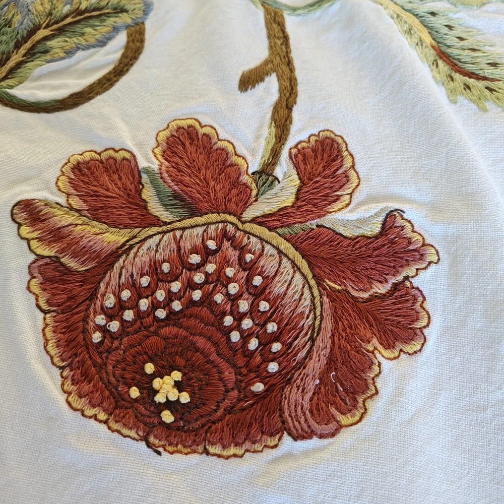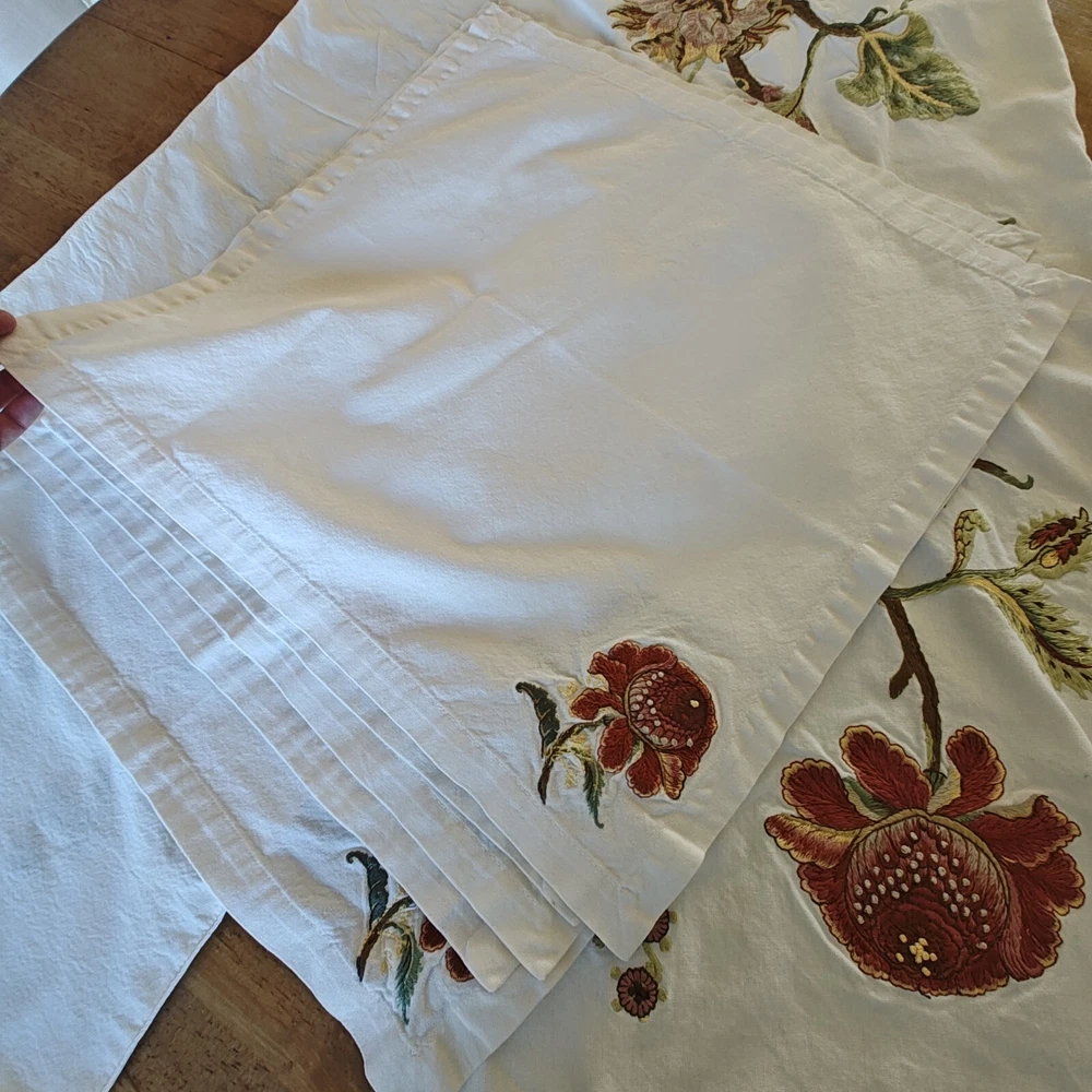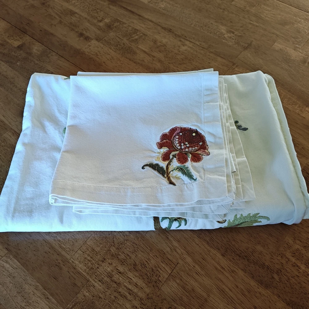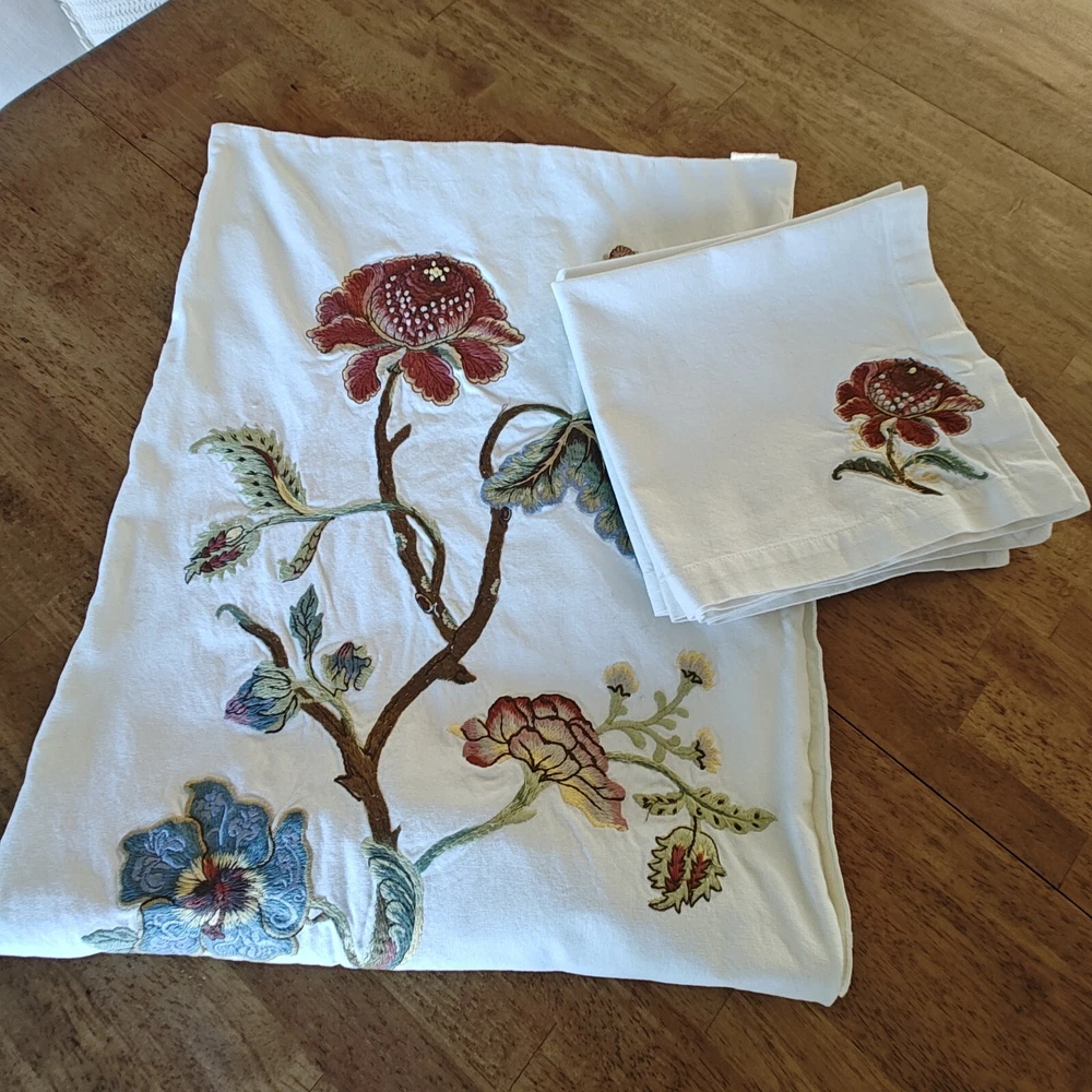 Pottery Barn Table Runner Crewel Embroidered Floral Vine 18"x 90" W/ 6 Napkins See in the photos there is one grey mark on the runner. Otherwise, clean and in gently used condition! The napkins are in great condition with some signs of use but overall very clean. Thanks for looking!