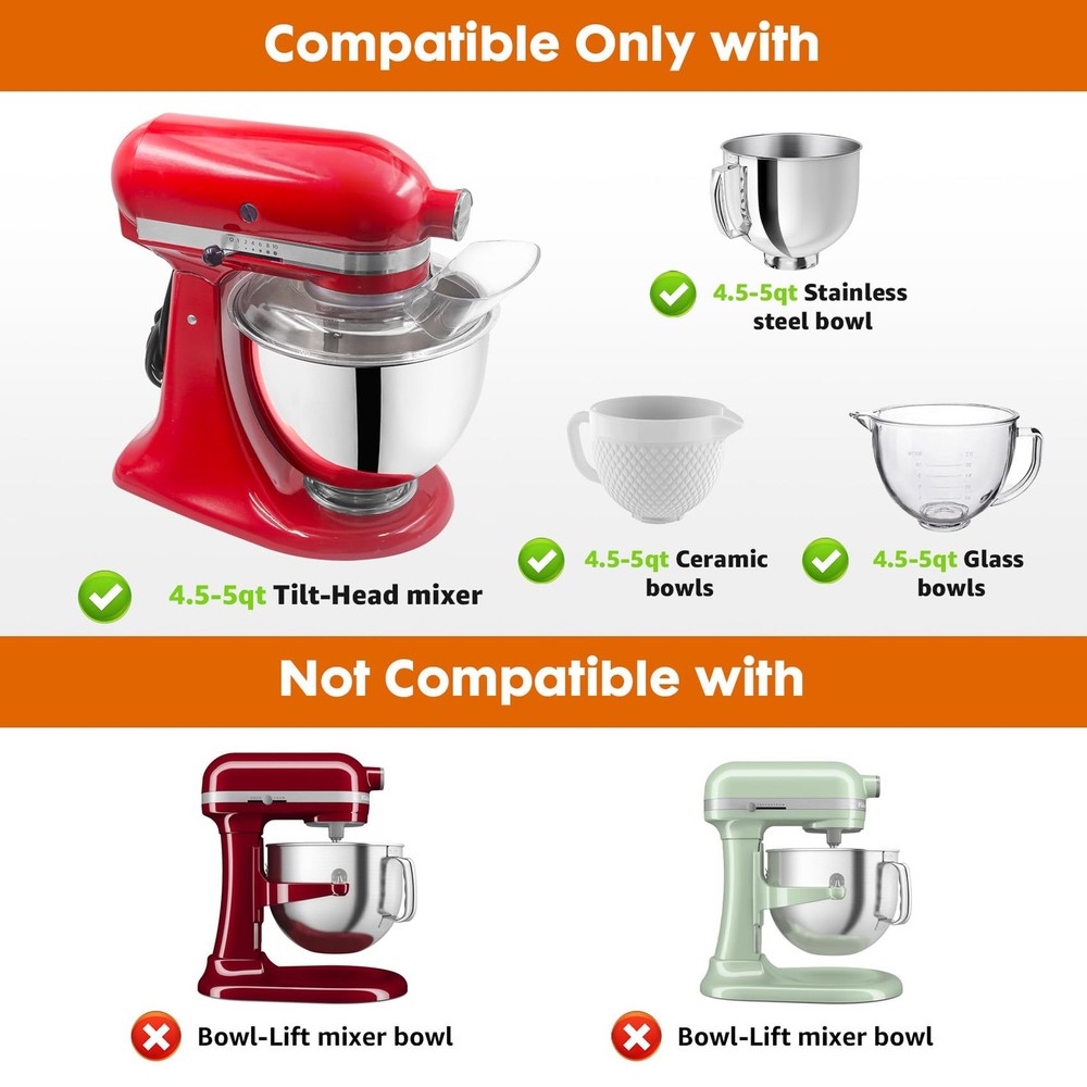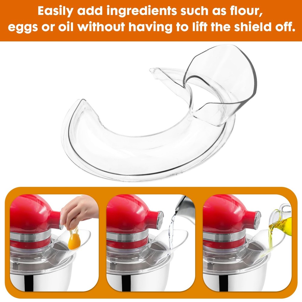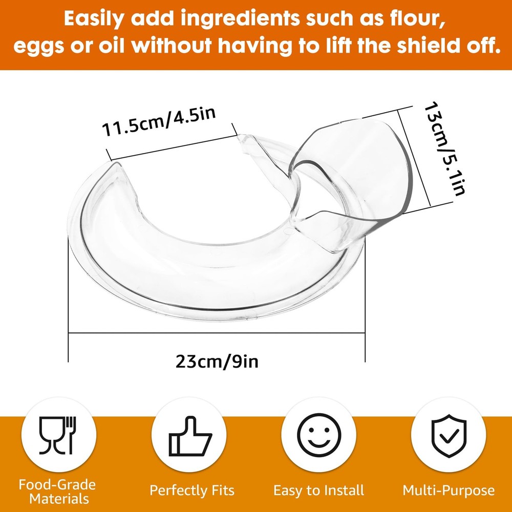 Feature This is a pooling shield hood for kitchen aid stand mixer bowls Our splash guard for kitchen mixer (Note: Only fit for 4.5-5 Quart Bowls). The pooling shield keeps whatever is being mixed contained inside the bowl. However, you can still add additional ingredients without lifting the shield thanks to its space opening. Material: Food Grade Plastic Size: 26 * 21.5 * 6.5 CM Color: Clear Compatibility: Kitchen Aid 4.5 and 5 Quart Bowls Convenient and Easy To Install The convenient for kitchen aid mixer pouring shield makes it easier than ever to add dry or wet ingredients, including flour, eggs, and hot liquids. Premium food grade materials The pouring shield for kitchen aid 4.5-5 quart is made of transparent food grade plastic, sturdy and durable, not easily broken or deformed, and can be used for a long time, saving you time and money. Packaging: 1 x Pouring Shield 【Unique design】- The pouring shield of kitchen utensils is designed to guide flour, egg liquid, or oil to mix more easily without the need to remove the shield and prevent baking ingredients from flying over the counter. Clear design allows you to see inside while adding ingredients. 【Large angled pour chute】- Our kitchen aid accessories and attachments - pouring shield for kitchen aid 4.5-5 quart features a large angled ingredient slide, helping you easily add ingredients to the kitchen aid stainless steel mixing bowl without wasting your raw materials. 【Food grade materials】- Made of high-quality food grade plastic, the Kitchen Aid Tilt-Head Stand pouring cover with a stand mixer and kitchenware accessory is safe and free of harmful substances. Suitable for 4.5-5QT stainless steel bowls, ceramic bowls, glass bowls and bread bowls. 【 Easy to use 】- The pouring cover size of our Kitchen Aid accessory for stand mixers is very suitable, and you can install or remove it at any time when the machine stops. 【Dishwasher safety】- The splash guard of the kitchen stand mixer is made of heat-resistant materials, making it easy to clean in the dishwasher, saving you a lot of time.