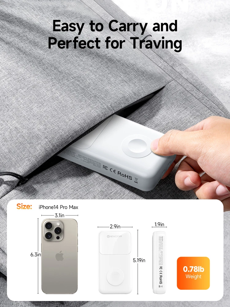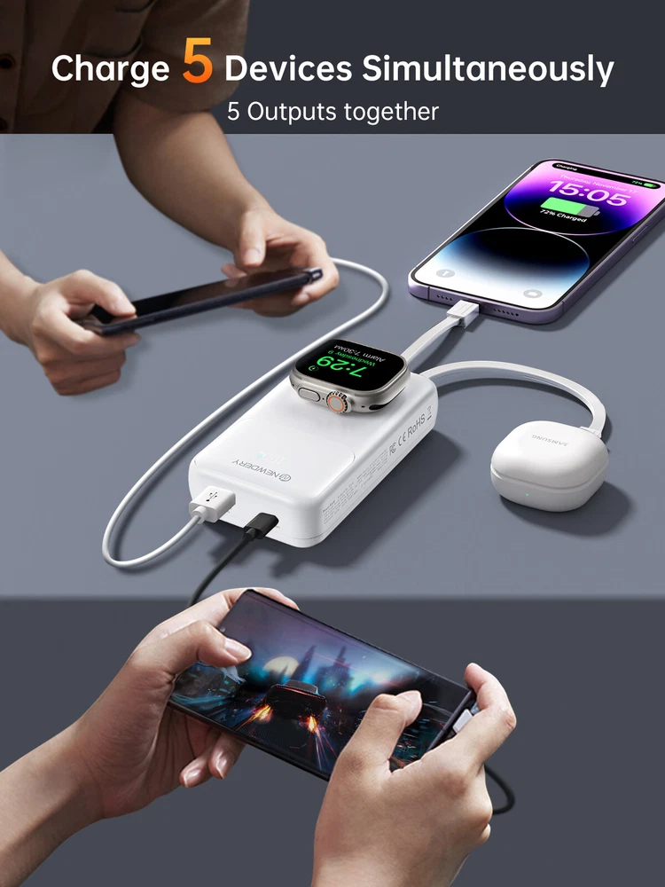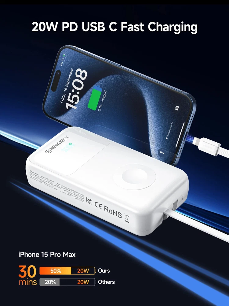 【Powerful 20000mAh Battery Pack】The power bank own 20000mAh capacity battery, provides enough juice to charge your devices multiple times,The portable phone charger can charge for iPhone 15 Pro Max to 3 times, for iPhone 15 Pro to 4 times, S24 to 3 times, iWatch S9 40 times and for AirPods to 30 times, Stay powered up for your devices all day long, perfect for travel. 【Wireless Charger for Apple Watch】 This for apple watch charger incorporates a magnetic wireless charging module, making it easy to charge your iWatch without extra cables. Compatible with apple watch series ultra 2/ultra/9/8/7/6/5/4/3/2/1/se. 【Portable Charger with Built-in Cables】: The portable charger for iphone builts in iOS cable and Type-C cable, the package comes with a c to c cable. you can use this 3 cable direct charging for a wide range of devices, for iphone 15/14/13/12 pro max/plus/pro/mini, galaxy w24/z flip/folds/s24/s23/s22/s21/s20/ultra/plus phone,ipad,airpods and so more. All in one portable charger, no need to carry various cables. 【PD 20W Fast Charging】 The battery pack with USB C's Power Delivery (PD) technology, charge your devices up to 50% within 30min. The for iWatch charger has a 18W USB A output and 20W USB C output.You can charge 5 devices max simultanouesly. Whether you're at home or on the road, this portable charger power bank is your perfect companion, great for your travel. 【What You Get】1* power bank for iPhone , 1*USB C to USB C cable , 1* User manual, 24h professional and friendly support, if you have any question about 20000mAh power bank, we will provide a satisfactory solution. 【Friendly Reminder】When wirelessly charging your watch, kindly press the button once and wait 5-10 seconds for the wireless charging to activate. Important Note 1. Wide Compatibilit y: The portable phone charger is designed for iPhone 15 pro max/15 pro/15 plus/15/14/13/12/11 series, compatible with apple watch series ultra 2/ultra/9/8/7/6/5/4/3/2/1/se/se 2nd, airpods pro 2/pro/3/2/1,ipad pro/air,iPad, for Galaxy S24 Ultra/S24 Plus/S24/Z Flip/Z Fold/S23 Ultra/S23 Plus/S23/S22/S21/S20/note 20/note 10 series other smart devices. 2. Multi-devices Charging: Supports five devices to charge simultaneously via wireless and wired charging. 3. Wireless Charging iWatch: One click the button to start charging iwatch, double click the button to stop charging. 4. Wired Charging Device: When charging with using USB-C cable or IOS cable or USB A port or USB C port, no need to press the button. 5. Simultaneously Charging Devices: When wired charging and wireless charging are performed at the same time, you need to press the switch once. 6. Safe Charging: The 20000mAh power bank with high quality smart chip to prevent over-charge, over-voltage, over-current, and short circuit, multi protect safety system ensures complete protection for you and your devices. 7. Green Mark: The green mark is fast charging mode. 8. Pass-through Charging: Please press power button once to wireless charge your watch while recharge the power bank.