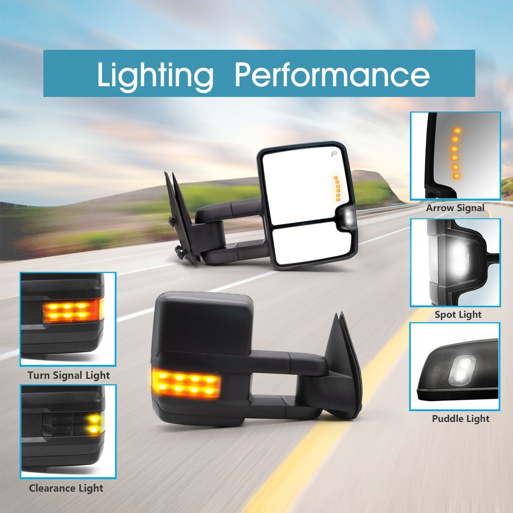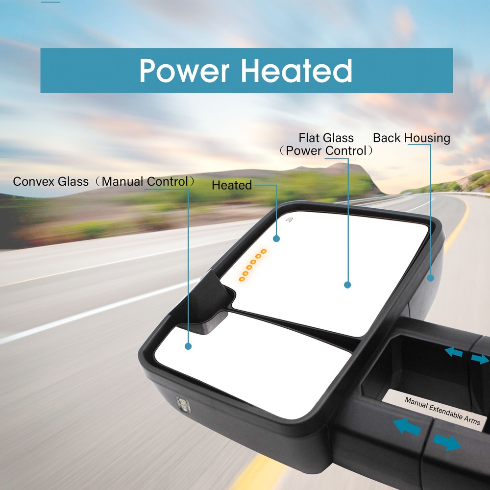 Product Description Detailed description of the product Specifications : Condition New Number Of Pieces 2 Fold Away Manual Fold Warranty 1 Year Color Black Location Passenger Right + Driver Left Side Features: Power Adjustment Mirrors Glass Heating Element to Defrost Mirrors LED Turn Signal Light (reserved,need to wire realize) Arrow Light On Glass (reserved,need to wire realize) Auxiliary Lamp (reserved,need to wire realize) Puddle Light (reserved,need to wire realize) Black Housing Manual Extendable Arms Manual Folding Arms Extend the length of the towing mirror 22" Fits: 1999 2000 2001 2002 Chevy Silverado 1500 2500 3500 2000 2001 2002 Chevy Suburban 1500 2500 2000 2001 2002 Chevy Tahoe 1999 2000 2001 2002 GMC Sierra 1500 2500 3500 2000 2001 2002 GMC Yukon 1500 2500 (excluding 2000 GMC Yukon V8 5.7L) 2000 2001 2002 GMC Yukon XL (excluding 2000 GMC Yukon V8 5.7L) Note : These mirrors will only work properly on vehicles with these exact options. If your vehicle does not have the options listed, these mirrors may not function properly. No installation guide. Professional installation is highly recommended. In the event the item should fail due to manufacturing defects during intended use, we will replace the part by free.(1 Year Warranty) The puddle lights buyer needs to do own wiring. If you encounter any problems, please contact us and we will provide you with solutions. Thank you! Payment Shipping Returns Contact Us PayPal is our preferred method of payment for all of our eBay sales. For customer service please contact us via eBay MessagesImmediate payment via PayPal is required for all Buy It Now items. If you need special arrangements, please contact us through eBay messages. Generally, all goods will be shipped within 24 hours after the payment on the working day (except for goods sent from China). If you want to cancel the order or change the address, please contact us within 6 hours after payment, otherwise we will not be responsible. It takes 3-5 working days for logistics and transportation to be delivered. If you are not satisfied with your purchase, you may return it, for a refund or replacement - subject to the following: Contact us through eBay messages or the returns link to receive a Returned Merchandise Authorization (RMA) number to ensure proper handling of the return and/or replacement. In order to be eligible for a full refund, less shipping expenses, your returned merchandise must be in its original new condition, as shipped, with all packaging, manuals, and paperwork intact and unaltered. Items which have been opened are returnable, however they will carry a restocking fee. If that product is returned for a refund, the shipping expenses incurred, will be deducted from the refund. If an item is refused, the carrier bills us for shipping both ways, and these expenses incurred on your behalf need to be deducted from your refund If you have a question about a part you should contact us before buying.And If you have any questions after purchase, please contact us and we will provide a satisfactory solution. Payment PayPal is our preferred method of payment for all of our eBay sales. For customer service please contact us via eBay MessagesImmediate payment via PayPal is required for all Buy It Now items. If you need special arrangements, please contact us through eBay messages. Shipping Generally, all goods will be shipped within 24 hours after the payment on the working day (except for goods sent from China). If you want to cancel the order or change the address, please contact us within 6 hours after payment, otherwise we will not be responsible. It takes 3-5 working days for logistics and transportation to be delivered. Returns If you are not satisfied with your purchase, you may return it, for a refund or replacement - subject to the following: Contact us through eBay messages or the returns link to receive a Returned Merchandise Authorization (RMA) number to ensure proper handling of the return and/or replacement. In order to be eligible for a full refund, less shipping expenses, your returned merchandise must be in its original new condition, as shipped, with all packaging, manuals, and paperwork intact and unaltered. Items which have been opened are returnable, however they will carry a restocking fee. If that product is returned for a refund, the shipping expenses incurred, will be deducted from the refund. If an item is refused, the carrier bills us for shipping both ways, and these expenses incurred on your behalf need to be deducted from your refund Contact Us If you have a question about a part you should contact us before buying.And If you have any questions after purchase, please contact us and we will provide a satisfactory solution. Related Products Pair Tow Mirrors Power Heated Turn Signal For 2015-2018 Chevrolet Silverado 2500 Tow Mirrors Power Arrow Signal Fits 2007-2013 GMC Yukon XL 2500 Left+Right Side Towing Mirrors Manual Fold For 2009-2012 Chevy Silverado 2500 3500 LH+RH Black Pair Tow Mirrors Power Heated Fits 99-02 Chevy Silverado GMC Sierra 1500 Black Pair Tow Mirrors Power Heated LED Signal Fits 2004-2006 Chevy Tahoe Suburban Heated √ √ NO √ √ Power √ √ NO √ √ Turn Signal Light √ √ NO √ √ temperature sensor NO NO NO NO NO Puddle Light √ √ NO √ √ Arrow Signal Light √ √ NO √ √ housing color Black Black Black Black Black folding Manual Manual Manual Manual Manual fit for 14-18 Chevy Silverado 1500 15-18 Chevy Silverado 2500 3500 14-18 GMC Sierra 1500 15-18 GMC Sierra 2500 3500 07-13 Chevy Avalanche 07-14 Chevy Silverado / GMC Sierra 07-14 Chevy Suburban 07-14 Chevy Tahoe / GMC Yukon 07-13 Chevy Avalanche 07-14 Chevy Silverado / GMC Sierra 07-14 Chevy Suburban 07-14 Chevy Tahoe / GMC Yukon 99-02 Chevy Silverado/GMC Sierra 00-02 Chevy Suburban/GMC Yukon XL 00-02 Chevy Tahoe 02 Chevy Avalanche 03-06 Chevy Silverado/ GMC Sierra 07 Chevy Silverado/ GMC Sierra Classic 03-06 Chevy Avalanche/ Suburban/ Tahoe 03-06 G