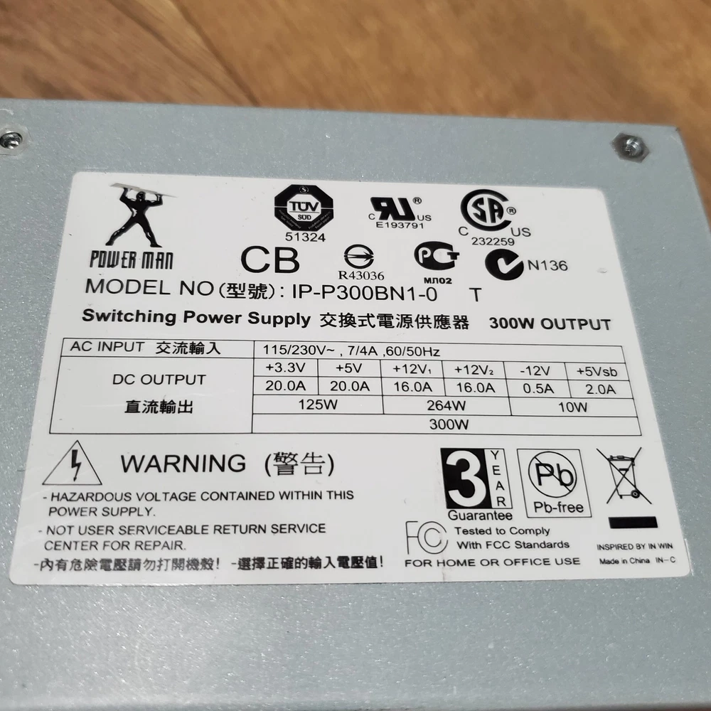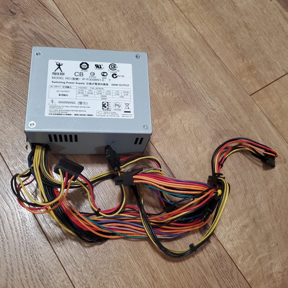 XCloud2003 Power Man IP-P300BN1-0 T 300W Switching Power Supply (20+4)pin, 4pin 12V, SATA * 4 x 4 7/8 x 2 4/8 inches, Tested, 60 DAYS WARRANTY * INFORMATION Power Man IP-P300BN1-0 T 300W Switching Power Supply (20+4)pin, 4pin 12V, SATA We pulled out from a working system. Please contact me if you have any question. Thank you CONDITION USED, TESTED, CLEAN PRICE "BUY IT NOW"