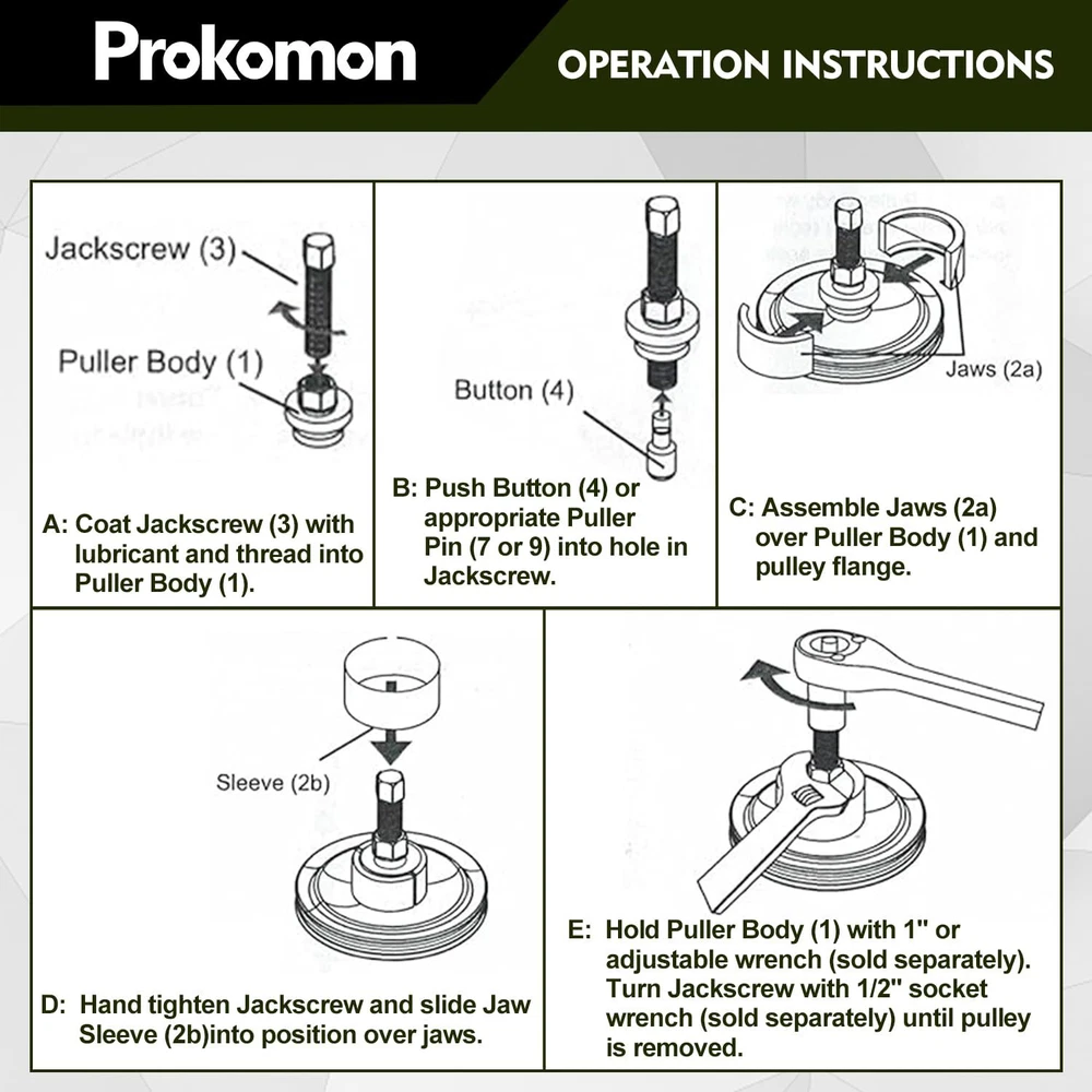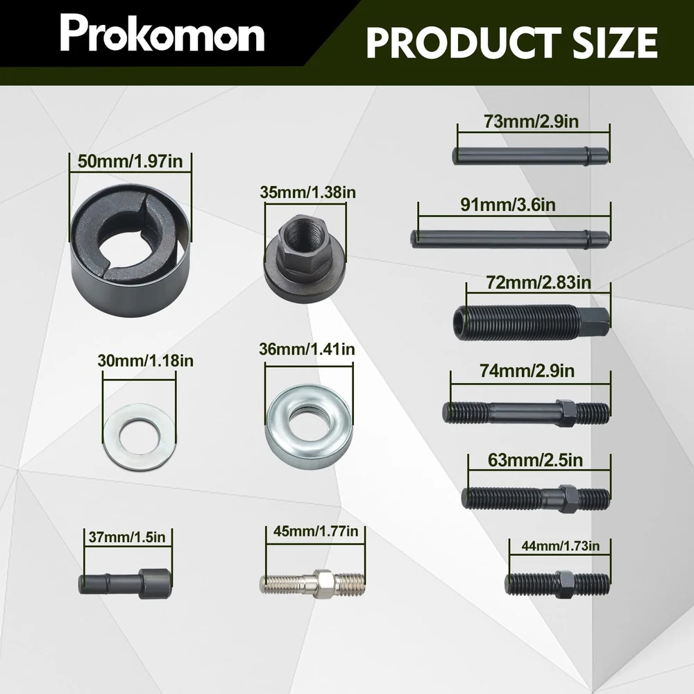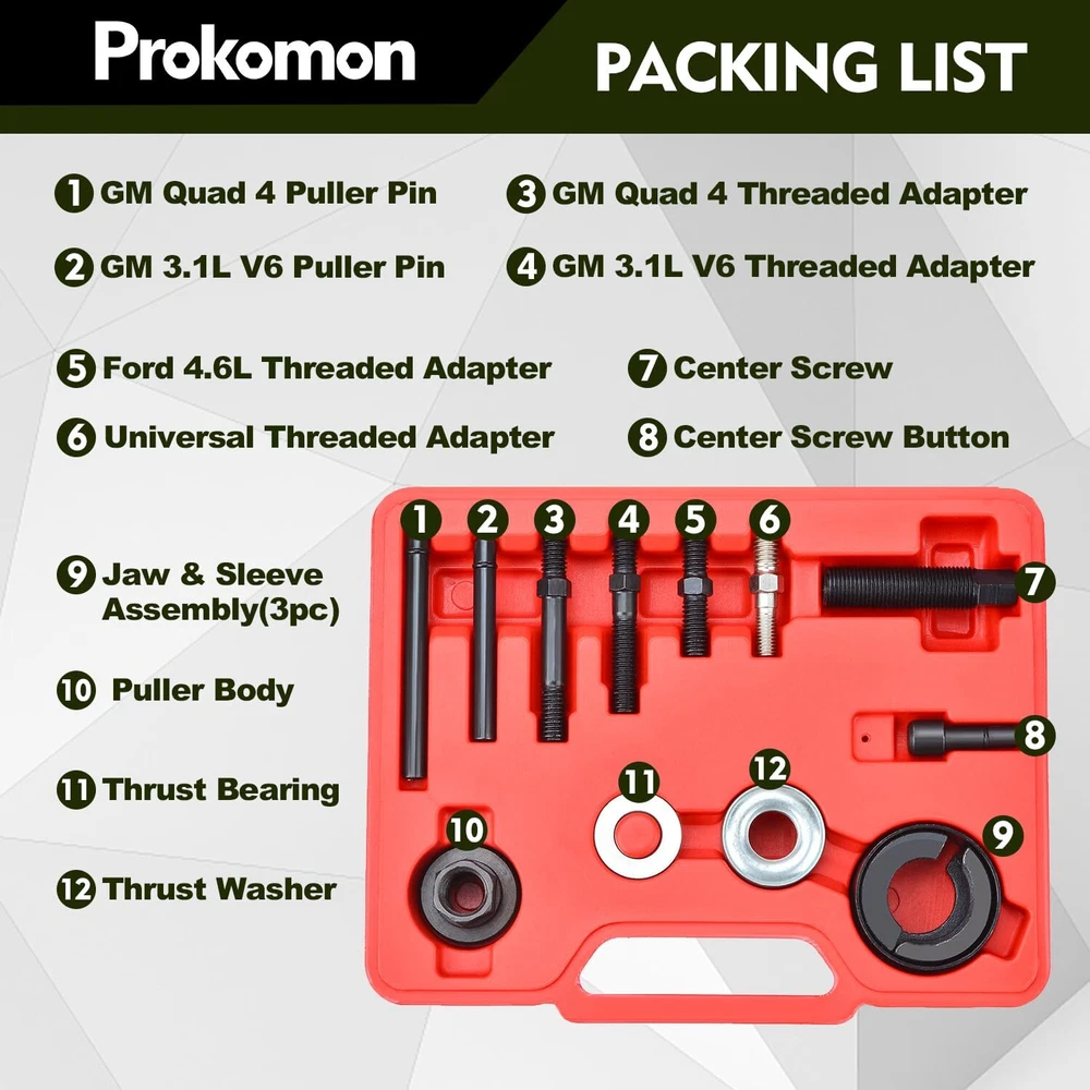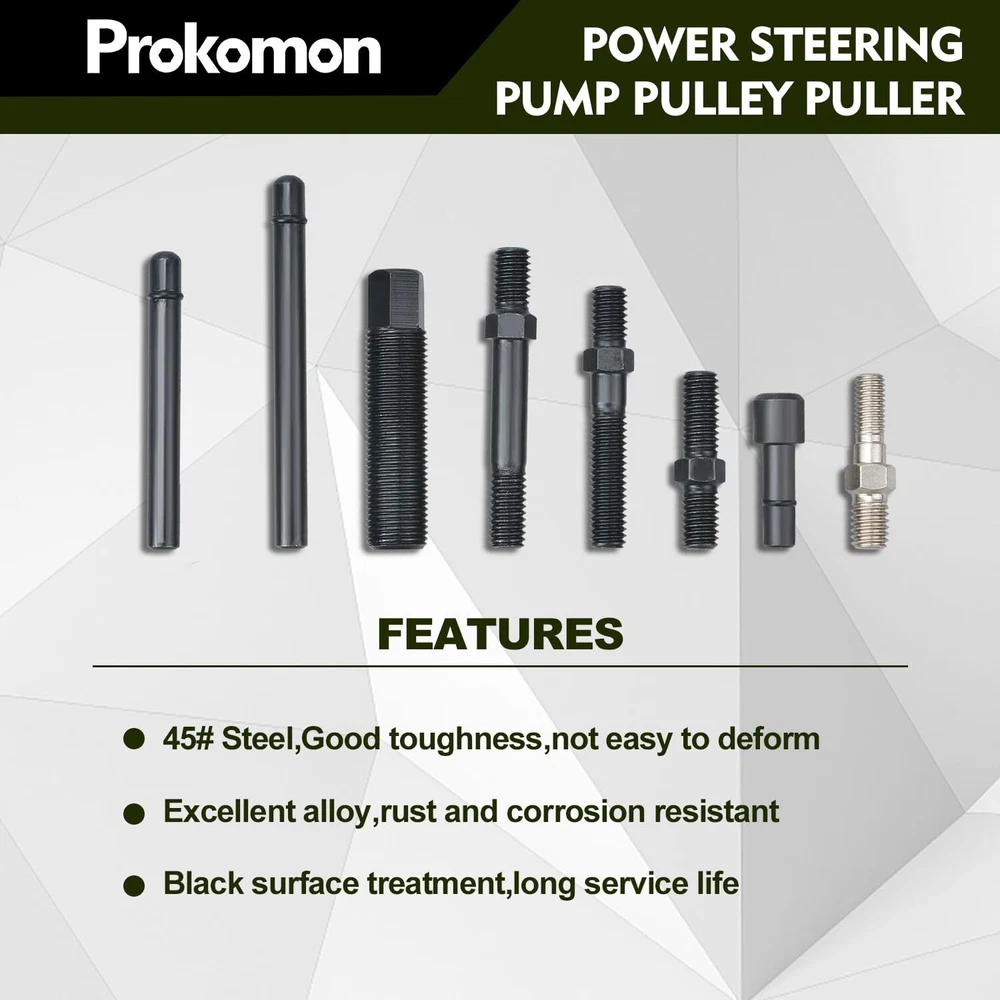 Power Steering Tool: For removal and installation of pressurized alternators; power steering pumps and other pulleys Function: This tool kit for home and professional power steering repair pulls and installs any pump pulley with a 1-1/8; 1-1/4; 1-5/16 or 1-3/8 inch hub diameter Compatibility: Fits for late GM; for Ford and Chrysler engines; Includes special adapters for GM 3.2 Quad 4 engines and Modular engines Sturdy: The pulley puller and installer tools are constructed from structural-AISI 1045 medium carbon steel for the necessary strength ; each piece is also heat treated and blackened for dependability and corrosion resistance Easy to Use: This power steering pulley removal tool is intuitive and In the following product description; there are detailed steps for product disassembly and installation