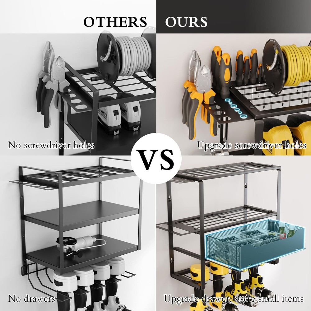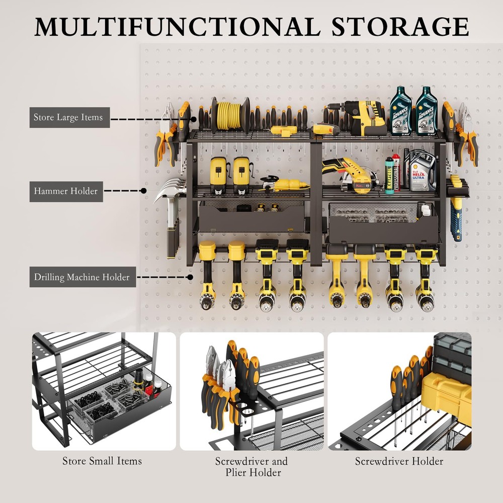 【Four Tiers High Capacity Storage】This tool shelf is designed with four tiers high capacity. The third tier are two pull-out drawers to increase the diversity of tools stored, the bottom tier can store 8 cordless drills, the top three tiers can store other heavy-duty tools or a variety of small tools, with hammer holders, pliers holders and screwdriver holders on the side. 【Strong Load-bearing Capacity】The garage tool organizer is made of thickened heavy-duty steel metal with greater load-bearing capacity and durability, it can be kept for a long period of time without deformation when storing tools, after extensive load testing, you don't have to worry about the shelf breaking or the power tool storage rack falling off the wall. 【Planned Space】This heavy duty tool organizer takes full advantage of wasted wall space to display and place your handheld tools into a compact and efficient area. This drill holder wall mount tool manager helps you keep all your frequently used project tools neatly organized and within reach. This is not only a space saver, but a greater time saver in finding your tools. 【Easy to Install】The power tool organizer has a detachable design, refer to the professional installation manual, you just need to attach the steel frame and screws, then hang it on the wall. It only takes a few minutes to assemble the heavy tool organizer on the wall in your garage, workshop or studio. 【Optimized Details】The edges of each piece of metal on this garage tool organizer are polished and rounded, so your fingers won't get scratched. Each slot slopes upward in the front to ensure your tools won't slide out.