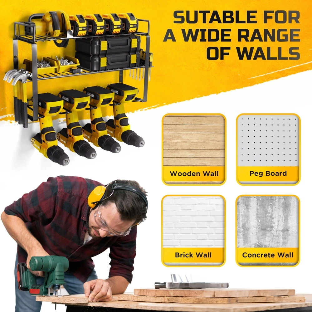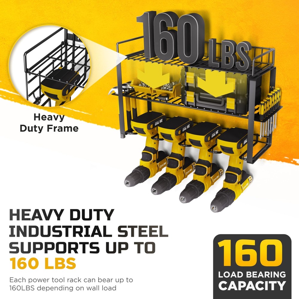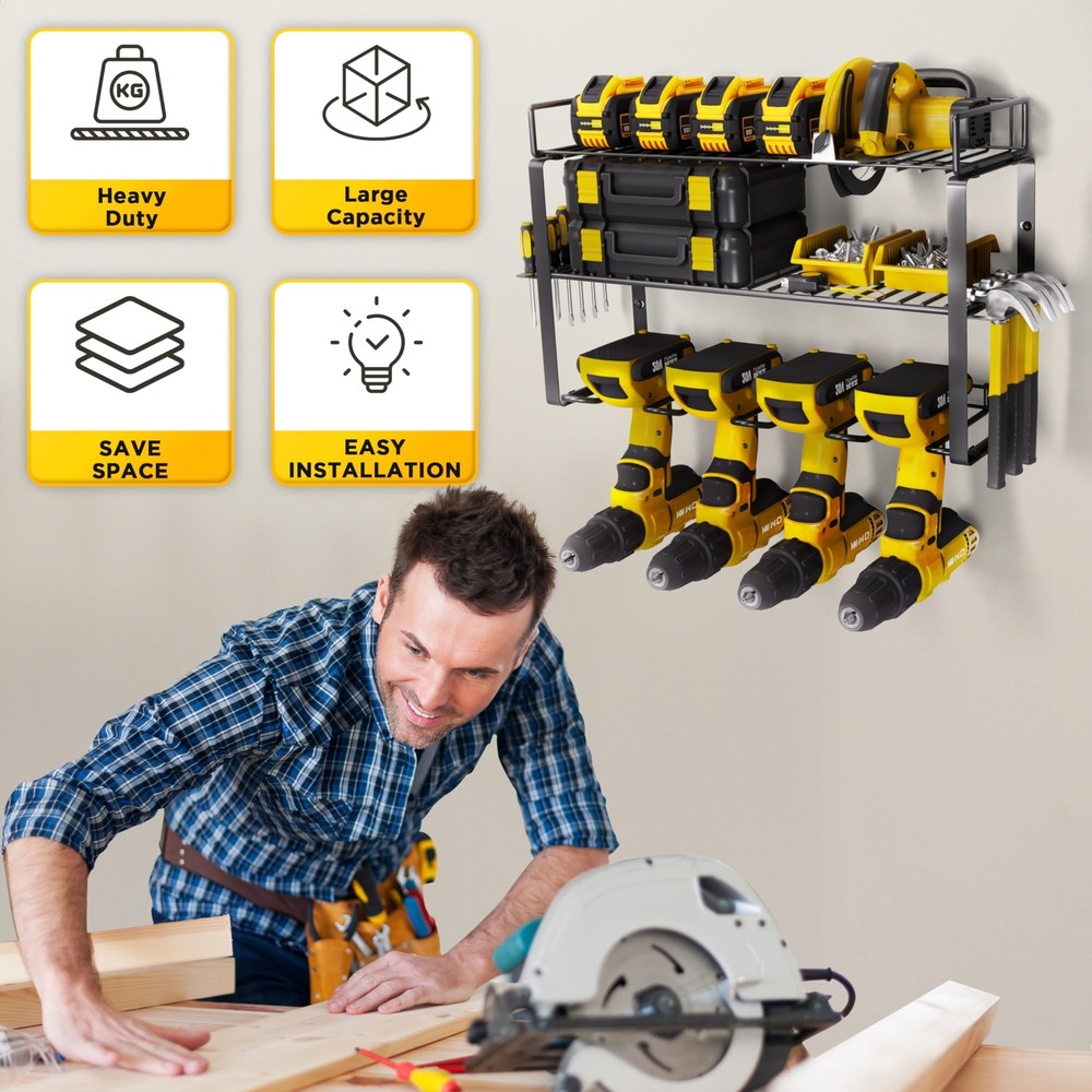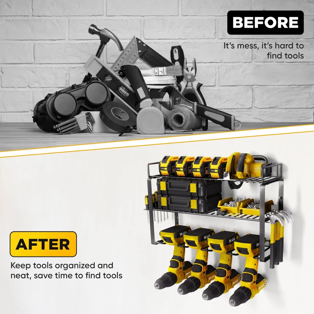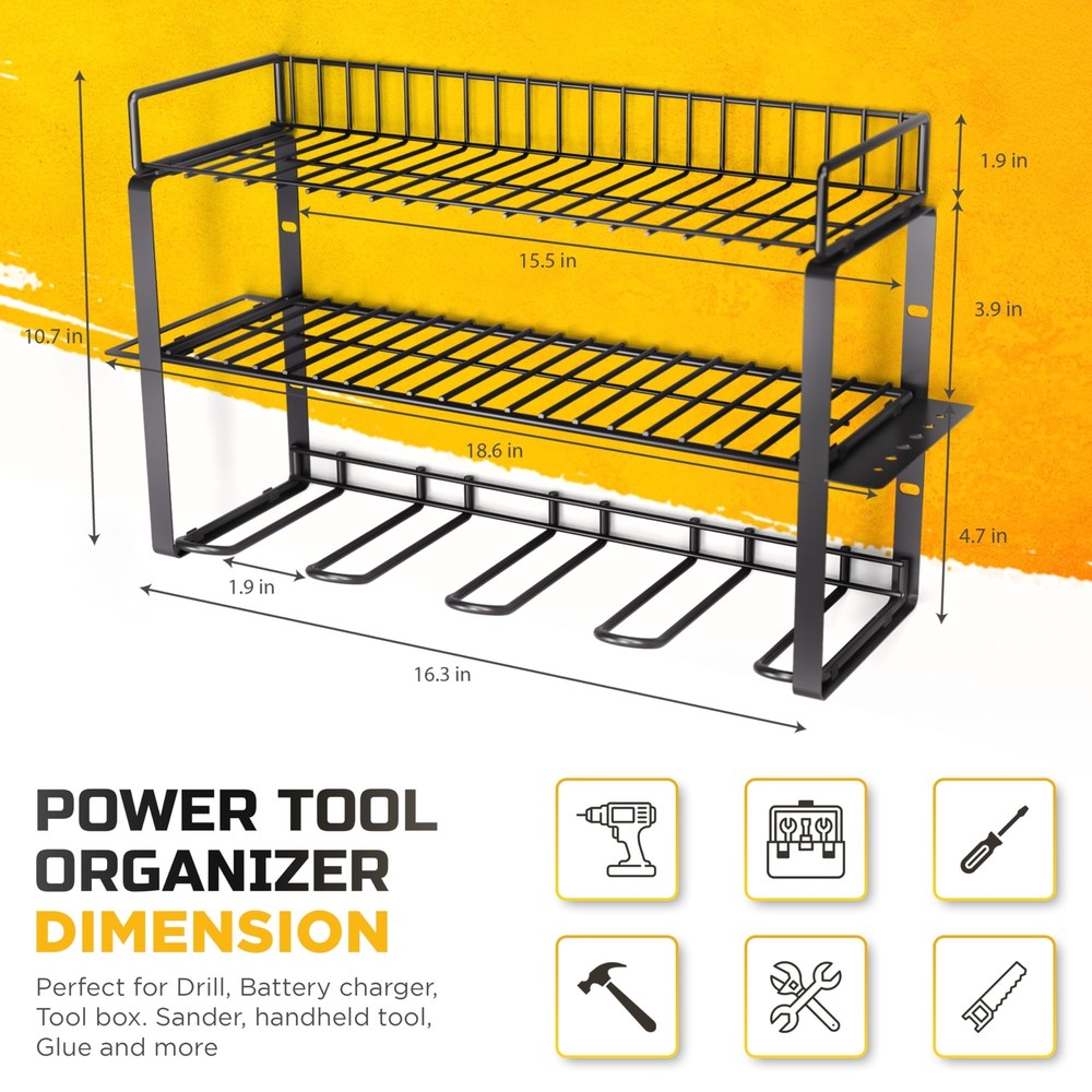 Power Tool Organizer Wall Mount- Heavy-Duty 3-Layers Tool Organizers and Storage for Garage and Workshop –Power Tool Holder, Drill Organizer & Power Tool Storage for Efficient Utility Product Details Style: 3 Layered Brand: Voltigrip MPN: TO12 UPC: 198168809501 EAN: 0198168809501 Material: Alloy Steel Color: Silver Special Feature: Dust Resistant, Portable, Weather Resistant, Collapsible, Washable Product Dimensions: 18.7"D x 8.66"W x 10.62"H Shelf Type: Tiered Shelf Material: ‎Alloy Steel Color: ‎Silver Special Feature: ‎Dust Resistant, Portable, Weather Resistant, Collapsible, Washable Product Dimensions: ‎18.7"D x 8.66"W x 10.62"H Shelf Type: ‎Tiered Shelf Number of Shelves: ‎3 Room Type: ‎Kitchen Finish Type: ‎Powder Coated Assembly Required: ‎Yes Mounting Type: ‎Wall Mount Recommended Uses For Product: ‎Tools Included Components: ‎Cover Brand: ‎Voltigrip Style: ‎3 Layered UPC: ‎198168809501 Manufacturer: ‎Voltigrip Part Number: ‎TO12 Item Weight: ‎6.93 pounds Country of Origin: ‎China Item model number: ‎TO12 Finish: ‎Powder Coated Item Package Quantity: ‎1 Special Features: ‎Dust Resistant, Portable, Weather Resistant, Collapsible, Washable Batteries Required?: ‎No Date First Available: January 23, 2024 Wall Mount Tool Organizer Voltigrip's power tool organizer transforms messy workbenches and wasted wall space into a tidy, efficient workspace. Quickly spot and access all tools on the wall-mounted holder, ideal for power tools like drills Optimal Load Capacity 3-tier tool organizer wall mount provides ample storage for your tools. Crafted from sturdy heavy-duty steel with hexagonal Expansion Bolts, it ensures durability and superior load-bearing capacity Easy Assembly Our wall tool organizer removable design ensures a swift assembly process. Just connect the steel frame with screws, hang it on the wall, and you'll have a perfect tool storage for your workroom in minutes Multi-Use Design Measuring 18.71" in width, 8.66" in height, and 10.63" in depth, the Voltgrip tool organizer is ideal for mounting on pegboards or wood/cement walls Diverse Storage Options The Voltgrip tool wall organizer comes with 4 slots, 4 hooks and a drill bit rack, providing a comprehensive solution for storing and charging your cordless tools