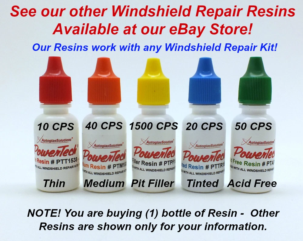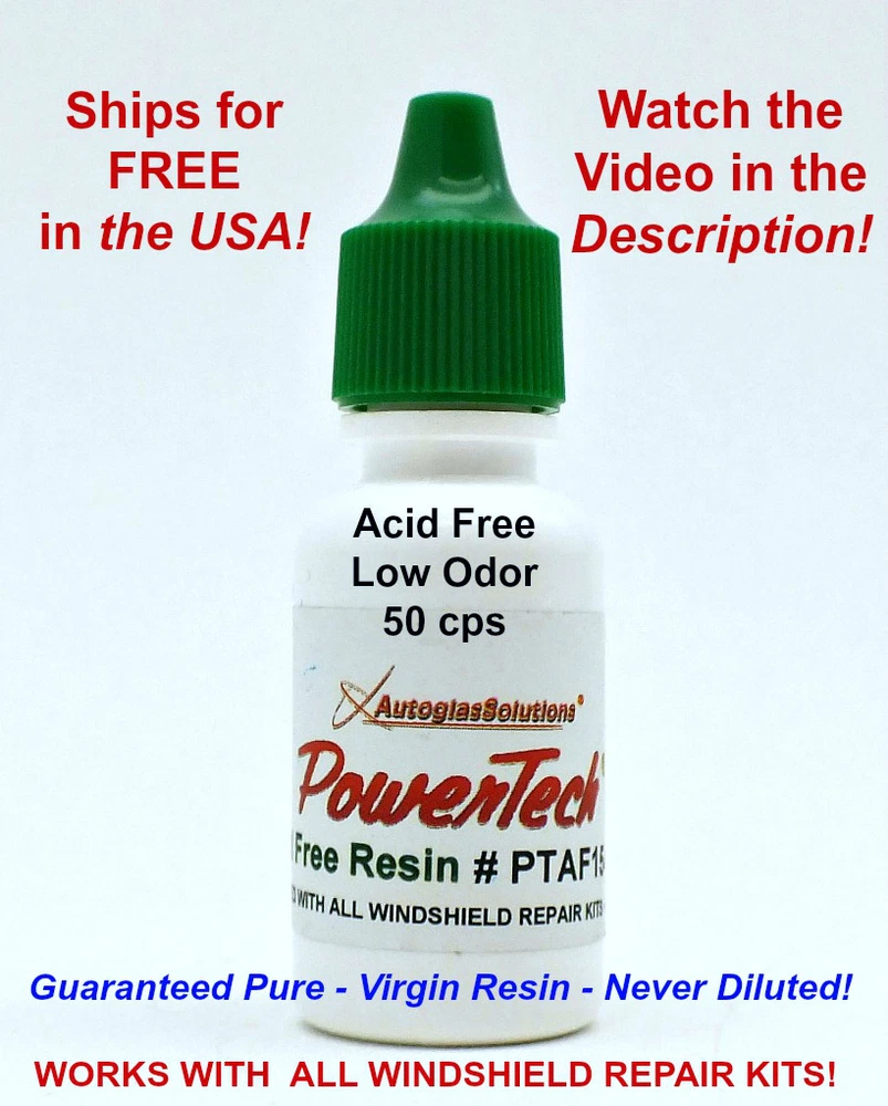 See our eBay Store which features ALL our Windshield Repair Kits, including Professional Systems as well as our Windshield Repair Products and Resins listings at this eBay link: http://stores.ebay.com/autoglassolutions/ Watch a short video on the features of our PowerTech Acid Free Low Odor UV Resin at this link: www.youtube.com/watch? v=wbEdgEmTfw8 Watch a video on the features of all our PowerTech Resins at this link: http://youtu.be/pd0YrWzzy7U ATTENTION! Per eBay policy, we ship to your eBay 'Ship To' address , NOT the PayPal address! Free Shipping in USA! Outside USA Shipping Cost: If you want to order more than 1 item, Click on the " Add to cart " button for each item. When you check out, t he items will be automatically combined to save shipping cost. Also, here may be local taxes, duties or fees that your country's Customs service may apply to the total cost. These fees are to be paid by you, the buyer. O ur PowerTech Acid Free Low Odor Chip Crack UV Cure Auto Glass Windshield Windscreen Resin at 50 cps is ideal for general repairs and cracks. If you have had the misfortune of becoming allergic to standard acid based resins, this formula is safe to use with usually no skin irritation. It is a high quality virgin resin meaning that we NEVER dilute or 'cut' our resins! What this means to you is that it 'wicks' into the break FAST and cures crystal clear! It is extremely hard, creating a powerful bond. It will not 'yellow' or shrink over time like other resins. Use on bulls eyes, star breaks, combination breaks and cracks. The viscosity of this formula makes it an ideal choice for all climates and when optimum clarity is desired. This formula can also be be used as a pit filler. Another huge benefit compared to other resins is that you only use a very small amount of resin to perform the repair! Stop fighting resin and start achieving amazing results with our premium resin! Also, our formula has an unlimited shelf life when stored in the original UV blocking bottle. One .5 oz bottle of resin will produce about 50 repairs! At $40.00 a repair, that is a $2,000 return on investment! Purchasing a quality resin is critical to growing a successful business. Need Mylar Cure Sheets ? See at this listing: 191419436263 Need Pit Filler Resin? See Pit Filler Resin eBay Listing Number: 191926539205 See our Thin Resin , listing # 191911509011 See our Thin Resin 8oz Bottle , listing # 20109087287 See our Medium Resin , listing # 191438618408 See our Non- Abrasive Pit Polish , listing # 191419436263 Please contact us with any questions you may have…. or call or TEXT (563) 299-0144 7am-8pm Central Time.