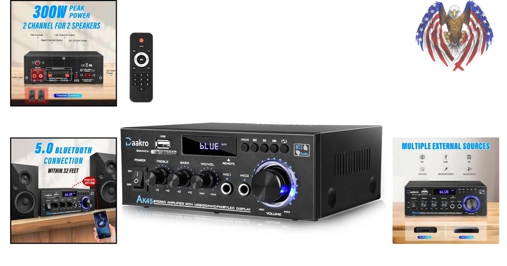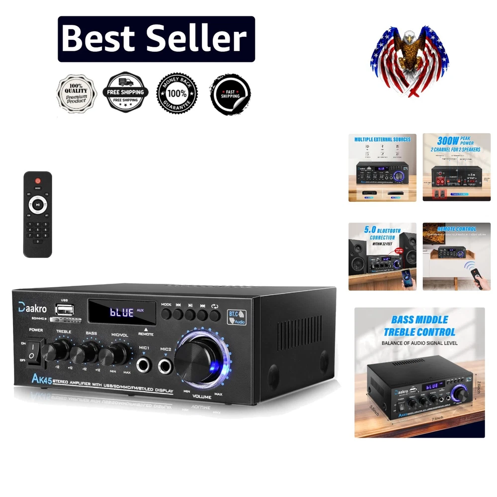 Powerful 300W Bluetooth 5.0 Stereo Amplifier for Home Theater & Wireless Audio ‹ › ‹ › ‹ › ‹ › ‹ › ‹ › ‹ › ‹ › ‹ › ‹ › Powerful 300W Bluetooth 5.0 Stereo Amplifier Experience sound like never before with the 300W Bluetooth 5.0 Stereo Amplifier, your perfect companion for a superior audio experience in your home theater and wireless audio setup. Key Features: 300W POWER: Fully upgraded design with 300W+300W peak power and 40W+40W rated power, suitable for 4-16 inch passive speakers. Advanced Bluetooth 5.0: Establish a clear and stable Bluetooth connection with no audible noise, designed for those who seek HiFi sound quality. USB 2.0/SD Card Input: Play your favorite audio files directly from flash drives or SD cards, tapping into your media library effortlessly. Bass & Treble Control: Tailor your listening experience with volume, treble, and bass control knobs, along with a remote controller for convenience. Wide Application: Compatible with mobile phones, computers, tablets, notebooks, TVs, and projectors with AV audio—perfect for any sound system. Benefits: Elevate your audio experience in small spaces like apartments, bedrooms, or offices. Compact design fits nicely in bookshelves or A/V cabinets, enhancing your decor without taking up unwanted space. Enjoy crisp and immersive sound for karaoke, movies, and your favorite music. Experience flexibility in sound control with easy-to-use knobs and remote access. Why Choose Our Amplifier? When it comes to enhancing your audio experience, there's no compromise. Our 300W Bluetooth 5.0 Stereo Amplifier combines powerful output with smart technology to bring you a seamless listening experience. From movies to music and everything in between, it caters to all your audio needs. Indulge in unparalleled sound quality and versatile connectivity—order your Powerful 300W Bluetooth 5.0 Stereo Amplifier today and redefine the way you enjoy audio at home! Shipping Free & Fast Shipping - We offer free shipping to most of the USA with a normal delivery time of 3-7 days. However, due to the current situation, additional delivery time (up to 3 weeks) may be required for some items. Alternative Carriers - We may use alternative carriers (e.g. USPS, FedEx, UPS, etc.) to ensure your package arrives safely and on time. Due to the use of multiple carriers, we are unable to provide a tracking number automatically. Handling Time - Orders are processed and shipped within 1-2 business days of receiving cleared payment. Shipping Restrictions - Shipping to Alaska, Hawaii, Puerto Rico, Guam, and other US territories may incur shipping charges or delivery restrictions. Please contact us before ordering, or your order can be refunded/cancelled. State Restrictions - There may be restrictions based on your state of purchase. For example, certain items may not be shipped to California due to state regulations. Contact for Tracking Updates - If you require tracking updates or have any concerns about the delivery of your order, please feel free to contact us, and we will be happy to assist you. Return 30-Day Hassle-Free Returns - We want you to be completely satisfied with your purchase. If you are not, you can return the item within 30 days of receiving it for a full refund or exchange. Easy Return Process - To start a return, simply contact us and we will provide you with a prepaid return shipping label and detailed instructions. Restocking Fee - There are no restocking fees for returns. However, the buyer is responsible for return shipping costs if the return is not due to a seller's error. Refund Processing Time - Refunds will be processed within 5 business days of receiving the returned item in its original condition. Payment We accept all major credit cards, PayPal, and Apple Pay for your convenience. Your payment information is secure and encrypted to ensure a safe and seamless transaction. Please complete your payment within 3 days of purchase to avoid any delays in shipping. Feedback Your feedback is extremely important to us. We strive to provide the best products and customer service possible. If you are satisfied with your purchase, please take a moment to leave us a positive review. If you have any concerns or issues with your order, please contact us before leaving negative feedback. We are committed to resolving any problems and ensuring your satisfaction. Contact Us If you have any questions or concerns, please feel free to reach out to our customer support team. You can contact us through the eBay messaging system. We are available Monday to Friday, 9:00 am to 5:00 pm EST, and we will do our best to respond to your inquiry within 24 hours. Buy it now and enjoy a pleasant shopping experience! UPC: Not Set Unit Quantity: 1.98 Audio Inputs: USB,SD Card,Bluetooth Audio Outputs: Banana Speaker Jacks,Headphone Jack,Stereo L/R RCA Supported Modes: FM Surround Sound Formats: Not Set Features: Digital,Bluetooth 5.0,Bass & Treble Control,Remote Control,Compact Design Receiver Combo Features: Not Set Compatible Product: TVs,Mobile Phones,Computers,Tablets,Notebooks,Projectors Brand: Unbranded Type: Power Amplifier Model: Bluetooth Audio Amplifier Number of Channels: 2 Number of Inputs: 2 Number of Outputs: 2 Color: Black Power: 300 W MPN: Not Set Unit Type: lb Amplifier Class: D Year Manufactured: Not Set Country/Region of Manufacture: Not Set Manufacturer Warranty: Not Set
