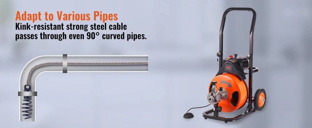 A re you tired of clogged drainage pipes, expensive plumbing services, and incomplete unclogging? Say bye to unpleasant smells and trouble maintenance! Let the electric drain cleaning machine with 50 FT x 1/2 In solid core cable solve all your blockage problems in one go without any worries! Features & Details Apply Anywhere: Versatile drain cleaner machine comes with 4 interchangeable cutters: arrow cutter, spade cutter, c-cutter, and boring bulb cutter. It can effectively tackle clogs in pipes, floor drains, sinks, toilets, and more. This sewer machine eliminates unpleasant odors, making it perfect for use in homes, properties, restaurants, factories, and schools. Attack Stubborn Clogs: Our 50FT x 1/2" sewer snake machine steel core cable is resistant to breakage, twisting, and corrosion, making it easy to navigate through complex curved pipes, leaving them free of blockages. This cable is perfectly suited for 1 inch to 4 inch pipes and prevents any frustrating entanglements or knotting during use, ensuring a smooth and efficient cleaning process. Effortless to Use: Features an automatic feed control system to power the cable in and out of drainage pipes. The CW/OFF/CCW knob and air-activated foot switch make it easy to control the cable. With this system, even one person can efficiently clear blockages with less effort. Compact & Portable: The electric drain auger is small in size and lightweight, making it easy to move around. Its 8-inch shock-absorbing wheels enable effortless use on stairs and other uneven surfaces. Additionally, the retractable handle reduces fatigue and provides a comfortable grip, while making it convenient to store when not in use. Boast Durability and Security: Our powerful drain auger cleaner, which boasts a high-quality motor with a speed of 1800RPM, is ready for anything. It features a semi-enclosed drum that allows for easy observation of the remaining cable length, as well as an upgraded steel frame with a special coating that prevents rust and extends its lifespan. Additionally, it comes with an integrated GFCI to protect operators from electric shock.