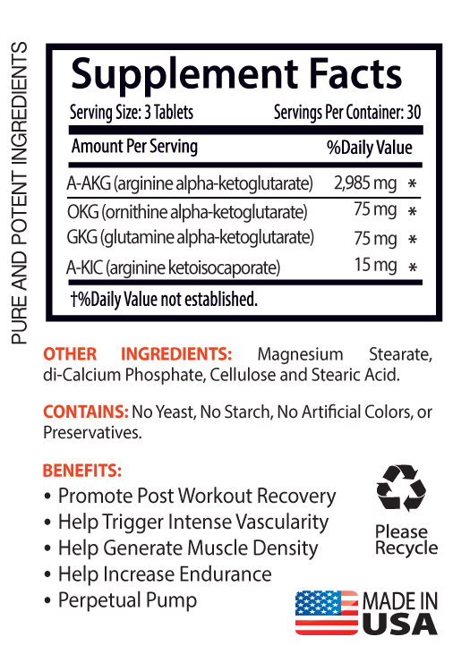 Nitric Oxide Complex 3150mg Muscle Power For Men & Women Gains In Lean Mass, Perpetual Pump. Muscle Engorgement Extreme Strength. Endurance & Recovery, Greater Vasodilation. Boost Post Workout Recovery. Higher Cognitive Functioning. Trigger Intense Vascularity. Help Generate Muscle Density. Increase Endurance, Reduced Fatigue. Enhanced Oxygen and Nutrient Transport. Improved Glucose Utilization. Increased Strength, Improved Stamina. 3 Bottles, 270 Tablets Made In USA What Are the Benefits of Nitric Oxide Supplements? Nitric oxide is a naturally occurring physiologic compound and is also available as a performance-boosting supplement for athletes. The amino acid l-arginine is the answer. The main importance of l-arginine is considered to be its role as a precursor (building material) for the synthesis of NO Supplemental sources of l-arginine are thought to augment nitric oxide production, with the result being a measurable increase in blood flow Nitric oxide supplements are typically used to increase cardiovascular endurance and reduce recovery time from injury, but they can also improve cardiovascular wellness and bone and joint health, as well as increase the ability to perform learning and memory tasks. Nitric Oxide for Cardiovascular Health: Nitric oxide is primarily recognized for its role as a vasodilator on the cardiovascular system the compound acts to systemically relax the walls of blood vessels, thereby increasing blood flow and preventing the development of high blood pressure. The idea is that the beneficial results of this vasodilatation for athletes include increased oxygen transport, delivery of nutrients to skeletal muscle, muscle fiber repair, and improved endurance. The compound also slows the development of cardiovascular disease by preventing the formation of plaque on the inner walls of blood vessels. Finally, nitric oxide is important in maintaining effective pumping action of the heart; if there is not enough nitric oxide present, the heart may not pump efficiently enough to deliver blood to all parts of the body. Sex, Nitric Oxide, and Your Heart: Nitric oxide is a very simple but important molecule. It is not the same as nitrous oxide, or “laughing gas.” The nitric oxide story is no laughing matter; it will determine how long you live. And it's an intregal part of sex and heart health. Nitric oxide is made by the blood vessels’ lining, or endothelium. The endothelium is exquisitely sensitive to the physical and chemical conditions inside our blood vessels. When the endothelium senses heart-healthy conditions, such as physical activity and low cholesterol, it releases more nitric oxide. And that’s a very good thing. Nitric oxide expands the blood vessels, increasing blood flow and decreasing plaque growth and blood clotting. Nitric Oxide Increased Cerebral Blood Flow & Higher Cognitive Output: Nitric oxide has received increased attention recently for its role as a neurotransmitter in the brain. Neurotransmitters are chemicals that relay signals between nerve cells in the brain and muscles in our body. Nitric Oxide, or NO. Known within strength training and muscle building circles as an effective way to promote the coveted muscle ‘pump’ (engorgement of blood within working muscles). NO also serves to enhance nutrient and oxygen delivery to muscle tissue, regulates insulin secretion, increases muscle velocity and elevates power output. NO has, since it was first used in 1996, increasingly become a staple part of many a hard training athlete’s supplement regimen.It’s been theorized that an increase in nitric oxide levels in the brain leads to increased cerebral blood flow and higher cognitive output. A study in the Indian Journal of Medical Research concluded that N.O. directly impacts the computational abilities of the brain as well as affects learning and memory formation. Higher levels of nitric oxide lead to greater cognitive abilities and quicker reaction times when performing mental activities. AAKG Promoted Muscle Building: AAKG may also be suitable as a night time supplement, taken on an empty stomach before bed, alone, or in conjunction with other GH releasers. Arginine alpha ketoglutarate is just a sodium of the amino acid arginine and alpha-ketoglutaric acid. It’s promoted like a muscle building product. The elements are intermediates within the metabolism of nitric oxides, but no trustworthy medical proof exhibits any advantages of getting alpha ketoglutarate like a supplement.At the moment, there’s no study printed in peer reviewed publications to aid the declaration that the escalation in nitric-oxide amounts encourages higher muscle protein functionality or enhances muscle power. There’s additionally no proof that the arginine-alpha-ketoglutarate in “nitric oxide” products have any impact on nitric-oxide amounts in muscles.” Arginine alpha-ketoglutarate is made up of arginine and alpha-ketoglutarate. GKG (Glutamine Alpha-Ketoglutarate) Supported A Higher Level Of Protein Synthesis: According to a study published in the September 1995 edition of Metabolism, researchers found supplementing with GKG supported a higher level of protein synthesis in hip replacement patients. Based upon this biological reaction, researchers feel the regular consumption of GKG stimulates protein synthesis. AKG (alpha-ketoglutarate) is the nitrogen-free portion of the amino acids known as glutamine and glutamic acid. It is formed in the Krebs cycle, the energy-producing process that occurs in most body cells. AKG is used by cells during growth. OKG (ornithine alpha ketoglutarate) Boost Muscle Growth: Ornithine alpha-ketoglutarate, or OKG, is a nutritional or dietary supplement which significantly boosts muscle development as well as enhancing the rapid growth of tissues. This amino acid is produced in the body in sufficient amounts through the enzyme metabolism and it is generated artificially from the amino acids ornithine and glutamine, both comp