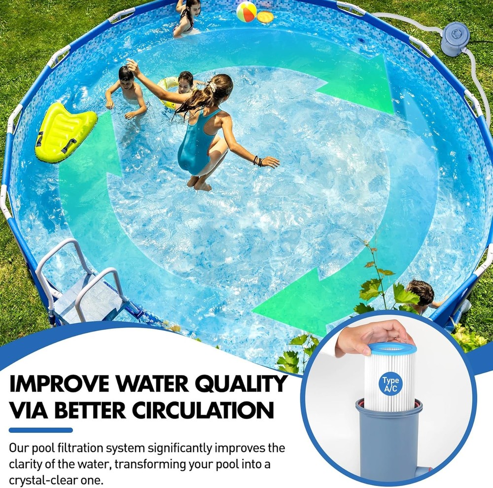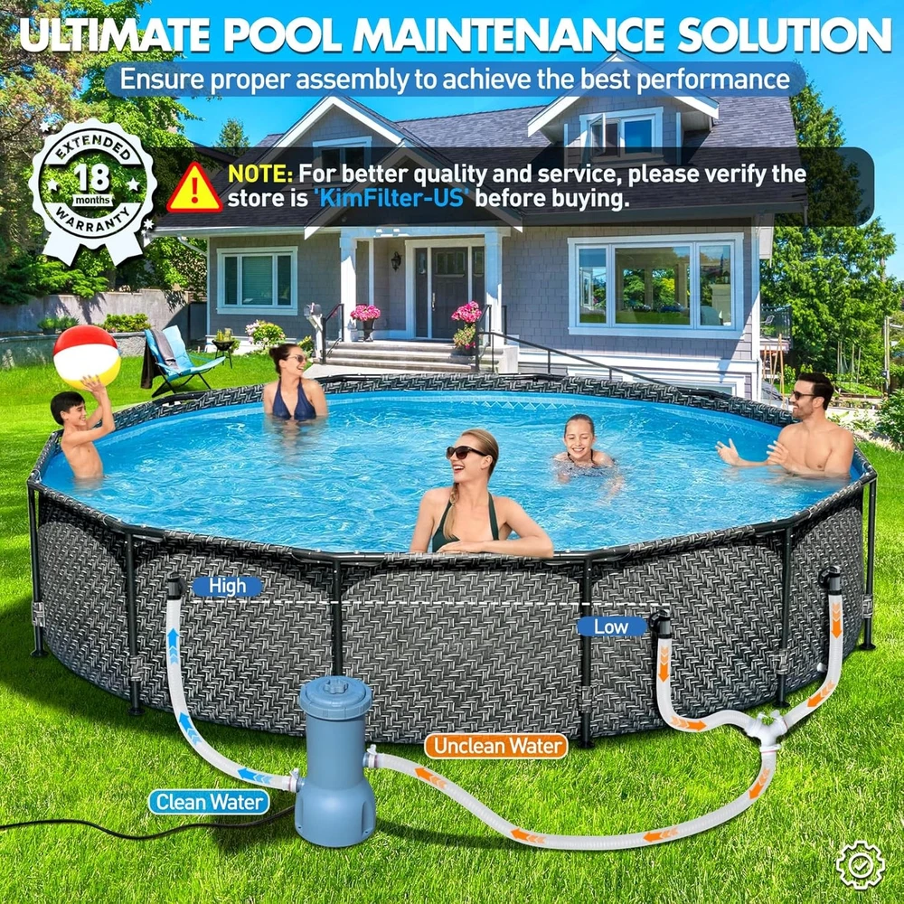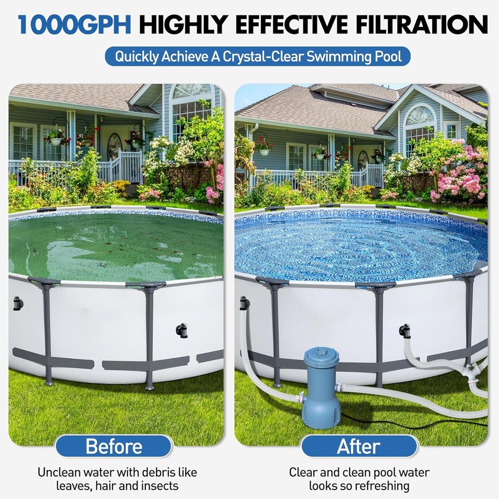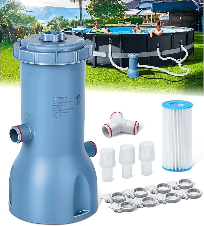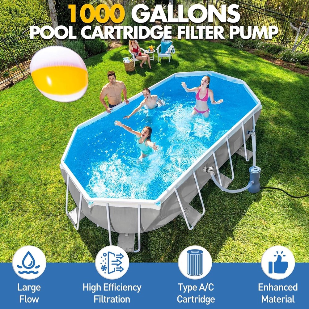 Pro Series 1000 GPH Above Ground Pool Filter Pump, Powerful Pool Cartridge Filter Pump, Water Circulation and Filtration System -Improved Water Clean & Clarity, Pools Pumps Above Ground-Gray Item Description About this item Improved Water Clarity - This above-ground pool filter pump delivers a 1,000 GPH filtration capacity and uses hydroaeration technology, which significantly enhances water circulation and filtration. This technology increases the concentration of negative ions in the water while actively maintaining pH levels between 7 and 7.4—a range ideal for clean, chemically balanced, and healthy pool water. Clearer Water - KimFilter 1000-gallon above-ground pool pump features an efficient Type A/C cartridge design for superior filtration. It effectively removes visible debris—including leaves, sand, and fine impurities—while filtering out tiny suspended particles to enhance water clarity. This ensures your pool stays crystal clear, free from contaminants, and ready for endless family fun. Dive into pristine water you can trust! ETL Safety Certification - Your safety is the driving force behind every innovation at KimFilter. Our pool filter pump is ETL-certified and rigorously tested to meet ASTM/UL safety standards, ensuring unmatched protection. Its built-in Ground Fault Circuit Interrupter (GFCI) detects ground faults or current leaks and cuts power within milliseconds. Whether children are playing nearby or adults are relaxing by the water, rest assured that every swim is backed by top-tier safety measures. Premier Pool Care - Our pool cartridge filter pump features simple assembly and operation, which is designed for everyone—from seasoned pool owners to first-time users. Start enjoying more swim time and less maintenance hassle. With powerful filtration and low-maintenance operation, it’s the ideal solution for a crystal-clear pool. Transform your pool today and give your family a healthier, more secure swimming experience! Customer First - KimFilter above-ground pool filter pumps system are designed, manufactured, and rigorously tested to meet industry-leading standards. Crafted with high-quality polypropylene materials, they deliver long-lasting durability and powerful filtration—keeping your pool water crystal clear for boundless family enjoyment. Your satisfaction drives us: Have questions or suggestions? Our team is here to help Show less *Yes, it is compatible with Intex/Bestway and most other brands of swimming pools *Rated flow rate: 1000 GPH, maximum flow rate: 1200 GPH *Usually, trapped air in the pump stops proper operation. The solution is to connect the hoses correctly and open the air release valve at the top. When the pump is filled with water, close it. Then, turn on the power, and the pump will work properly. Payment We accept payment only through PAYPAL Shipping We ship products worldwide through standard express courier service, it will reach within 7 to 10 days to abroad buyers, we ship the product after recieved clear payment and give full information about shipment to the buyer Return We accept product return within 7 to 21 days from delivery date but product should be in original position and not in damaged condition,the return shipping charges will be buyer responsibility