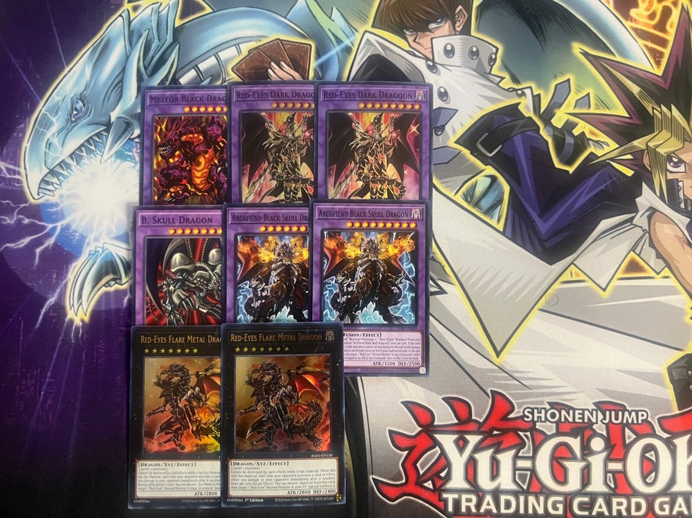 Hello! You are purchasing the deck list below, the cards will be English, real, and near mint to light play condition at worst. All decks are built with the lowest rarities for cards in mind to keep the price of the deck low and affordable for all duelists! Some cards may be in speed duel printing if this is the cheapest available copy of the card, but do not worry these are real cards and legal for tournament use! Purchase with confidence and safety! As an added bonus one pack of card sleeves will be included with your deck! Thanks again and good luck dueling! Now here's the decklist; Monsters: 1| Red-Eyes Alternative Black Dragon 1| Dark Magician 1| Summoned Skull 1| Red-Eyes Darkness Dragon 1| Meteor Dragon 1| Meteor Dragon Red-Eyes Impact 1| Red-Eyes Archfiend of Lightning 1| Red-Eyes Black Meteor Dragon 1| Red-Eyes Darkness Metal Dragon 1| Red-Eyes Black Flare Dragon 1| Red-Eyes Baby Dragon 1| Armageddon Knight 2| The Black Stone of Legend 2| Red-Eyes Soul 2| Carboneddon 2| Keeper of the Shrine 2| Red-Eyes Wyvern 3| Dark Armed Dragon 3| Red-Eyes Retro Dragon 3| Red-Eyes B. Dragon 3| Black Metal Dragon 3| Red-Eyes B. Chick (Black Dragon's Chick) Spells; 1| Dragon's Mirror 1| Harpie's Feather Duster 1| Foolish Burial 1| Raigeki 1| Monster Reborn 1| Called By The Grave 1| Inferno Fire Blast 2| Cards of the Red Stone 2| Dragon Shrine 3| Return of the Dragon Lords 3| Allure of Darkness 3| Red-Eyes Insight 3| Red-Eyes Fusion Traps: 1| Return of the Red-Eyes 2| Red-Eyes Burn 3| Red-Eyes Spirit Extra Deck: 1| Meteor Black Dragon 1| B. Skull Dragon 2| Red-Eyes Dark Dragoon 2| Red-Eyes Flare Metal Dragon 2| Archfiend Black Skull Dragon