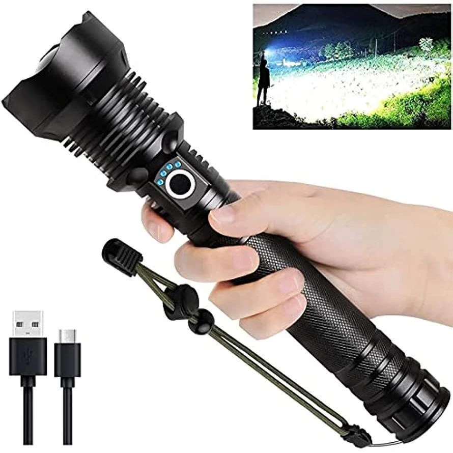 Product Description: Brightness: 4000 lumens Waterproof rating: IPX5 Beam distance: 1093 yards Power Capacity: 10000mAh Material: Aviation aluminium LED lamp life: 100,000 hours Usage time: 6 to 12 hours (approx.) Lighting Modes; High, Medium, Strobe Features: SUPER BRIGHT WIDE BEAM: The 4,000 lumen torch can effortlessly light up two football fields, providing a reliable and convenient lighting tool. PORTABLE AND RELIABLE: The torch fits easily into a car or survival kit. The strobe and SOS functions are your saviour when making roadside repairs or signalling for help. BATTERY INDICATOR: Powered by rechargeable batteries that can be recharged via USB cable (included), the torch can last up to 6 hours in low-light mode, and the torch has a four-cell indicator to remind you to recharge it in time. When the number of indicators decreases, it means the power level is down. IPX5 WATERPROOF: Waterproof rating up to IPX4, the body of the torch is made of high quality splash-proof aluminium alloy waterproof and non-slip to ensure that it can be used even in rainy days, suitable for outdoor use. Three modes:There are three lighting modes: high, low and strobe, you can choose the right lighting mode according to your needs. 10000 mAh REECHARGEABLE BATTERY: Equipped with 10000 mAh ΒATTERY and upgraded P70 LED chip, it can provide you with up to 12 hours of medium brightness illumination. Beam distance up to 3280 ft. IMPACT RESISTANT: Constructed of aircraft grade aluminium for pressure and impact resistance. 2 LIGHTING MODES - NARROW BEAM AND WIDE BEAM: Wide beam (flood) and narrow beam (spot) lighting modes are designed to make the flashlight suitable for more lighting situations. Package Includes: 1 x Powerful LED Flashlight 1 x 10000 mAh rechargeable battery 1 x USB cable 1 x Flashlight Lanyard 1 x English Manual