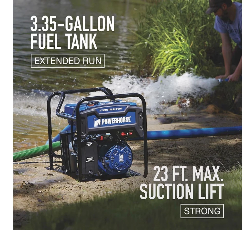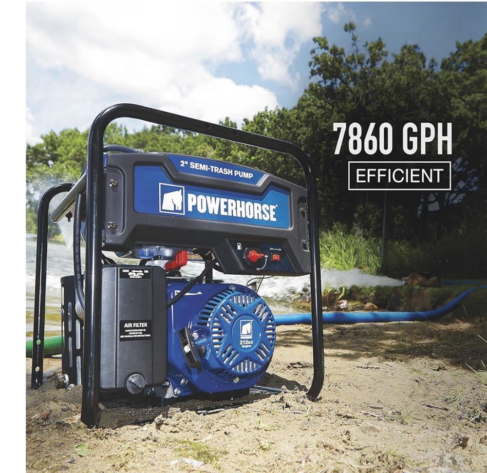 The Powerhorse Extended Run Semi-Trash Water Pump is a high-quality water pump designed for industrial and commercial use. With a powerful 212cc OHV engine and a maximum flow rate of 7860 GPH, this pump is capable of handling large volumes of water with ease. The 2-inch ports provide efficient inlet and outlet connections, making it ideal for a wide range of applications. Built by the reputable brand Powerhorse, this water pump model (750123) ensures reliability and durability in demanding pumping situations.