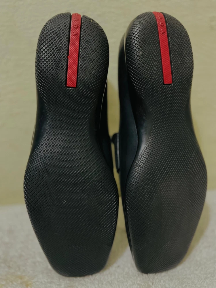 The Prada loafer shoes are a stylish and comfortable pair of men's dress shoes in size 8 UK/9 US. Featuring a solid black color and made from leather, these Oxford-style shoes are perfect for formal occasions or everyday wear. The Prada brand ensures high quality and a fashion-forward design, making them a versatile and sophisticated addition to any wardrobe.