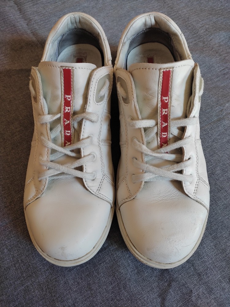 WELCOM Prada Low Top Sneakers White Leather Women Size 36.5 I try to be as honest as possible in my descriptions and will give full details of any faults that I find on the item With Pre-loved items, customers must accept that items will not be like new and may have some small marks, Colour fading or some pulls that may have happened with wear. We want customers to be aware of this when purchasing. Size 36.5 Please refer to pictures, FOR condition. We will gladly answer your questions prior making a purchase Please SEE the PICTURES AND size before buying shipping and handling 1. We ship to your eBay address Please make sure your eBay address is correct before you pay; 2. We ship within 2 business days after full payment is received and cleared. I do ship world wide by registered mail withe traking number Shipping time takes up to : =EXPEDITED 4/8 BUSINESS DAYS 65 $ ) recommend it) =Standard 11/25 BUSINESS DAYS 45 $ =ECONOMIC 25/35 BUSINESS DAYS 35 $ . + NOT RESPONSIBLE FOR CUSTOMS DUTIES ; taxes ;fees or delays.