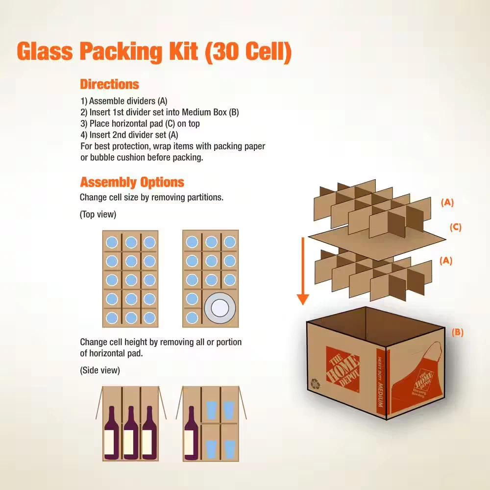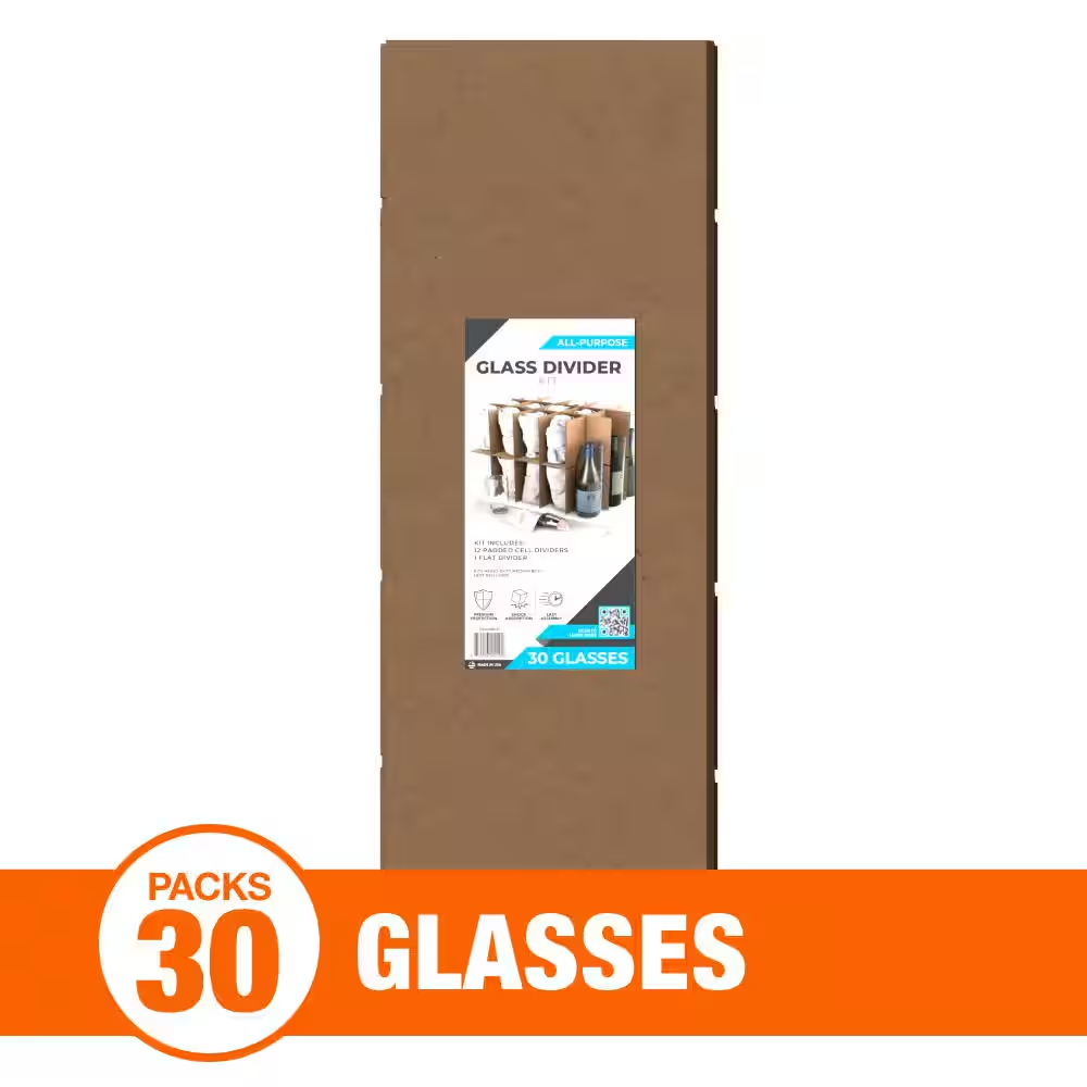Pratt Retail Specialties Glass Divider Kit for Kitchen – Holds Up to 40 Glasses The Glass Divider Kit has up to 40-separate cells designed to keep valuables and breakables safe during a move. The optional center divider allows for a variety of cups, wine glasses, flutes, and more to fit comfortably inside. Additionally, the 5 in. top partition is great for shorter glasses or small valuables while the 10 in.bottom partition is ideal for wine glasses, flutes, and other tall items. Glass divider kit is recommended for best fit inside the 20 in. x 16 in. x 15 in. or larger Home Depot heavy-duty medium box Glass divider set is 100% recycled Set can also be used to protect plates, cups, bottles, vases and other ceramic or glass valuables All packing paper and foam pouches sold separately