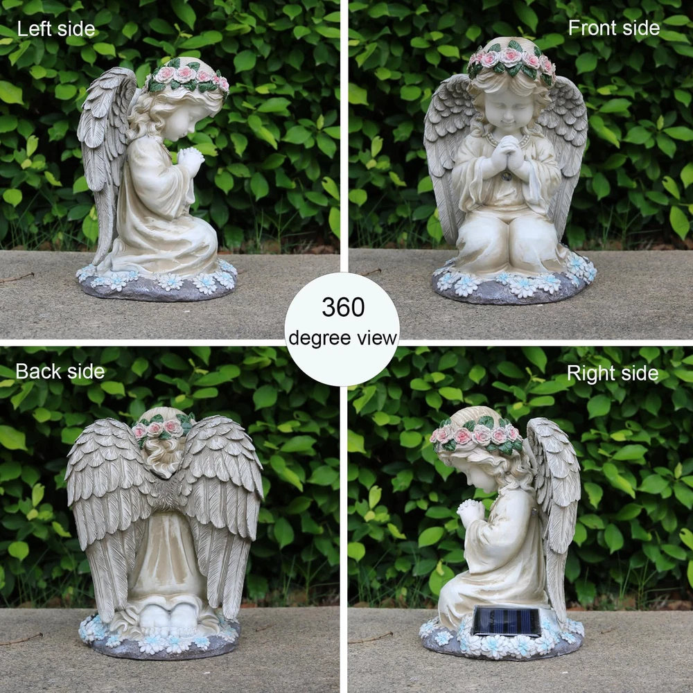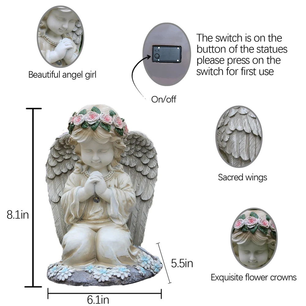 【 Beautiful Angel Garden Statues】This angel garden decoration is a unique design,that a kneeing angel with wings is praying ,The crafted design and workmanship make her very beautiful.And it makes a very peaceful and fairy feeling.Imagine how harmonious it would be to have such a lovely angel in your home. 【Durable and Waterproof】The solar angle sculpture is made of high quality resin, which is durable and weather resistant. The whole product is IP44 waterproof, So you can place it outside in any weather conditions. 【Peffect Size】The statues is in perfect size,measured 8.07in*6.10in*5.5in,and can be used in a variety of scenes for decoration, whether it is placed indoors or outdoors on the lawn, patio, balcony and other places, it will become a focal point of your home! 【Easy To Use】This garden decoration is very easy to use, just press the switch when you use it for the first time, Then place it somewhere that can get the sunshine,the will automatically charge during the day and light up at night.When comes night the warm yellow light emanates from the angel's chest and wings, making her look very warm. 【A Great Garden Gift】This Angel Praying garden Statue is a perfect gift choice for Mom,Grandma,Wife,Daughter,Sister,Aunt,Girlfriend when Birthday Mother's Day, Father's Day,Thanksgiving Day,Valentine's Day,Christmas and ohter occasions.