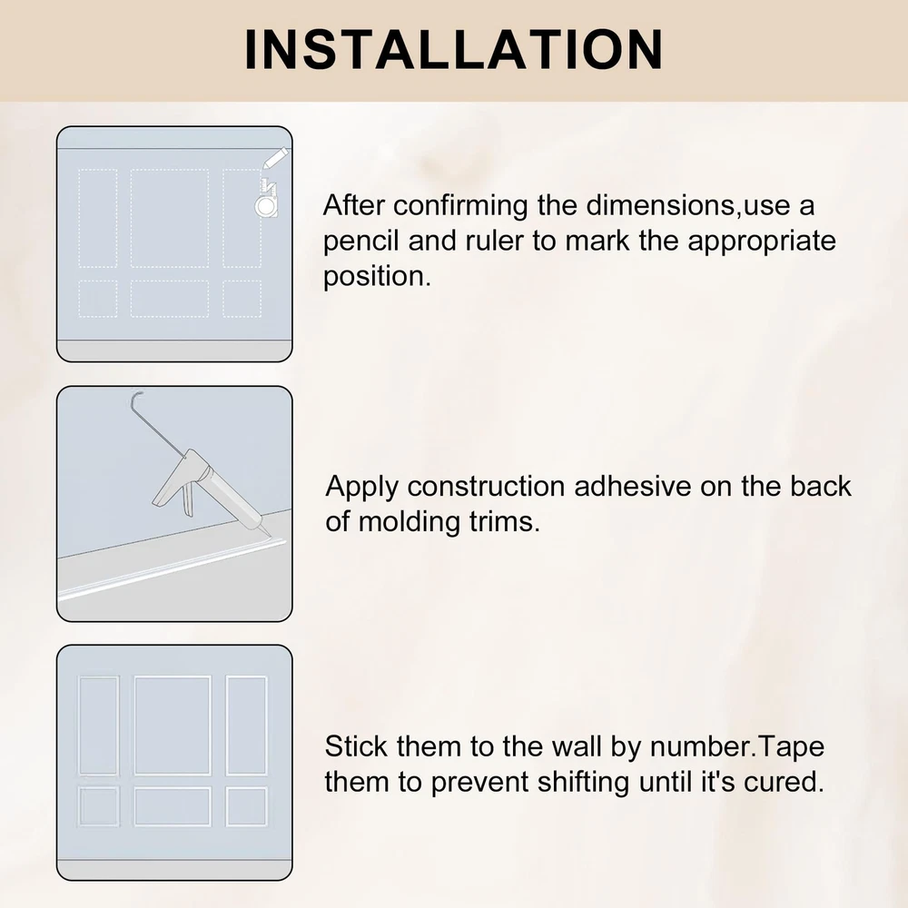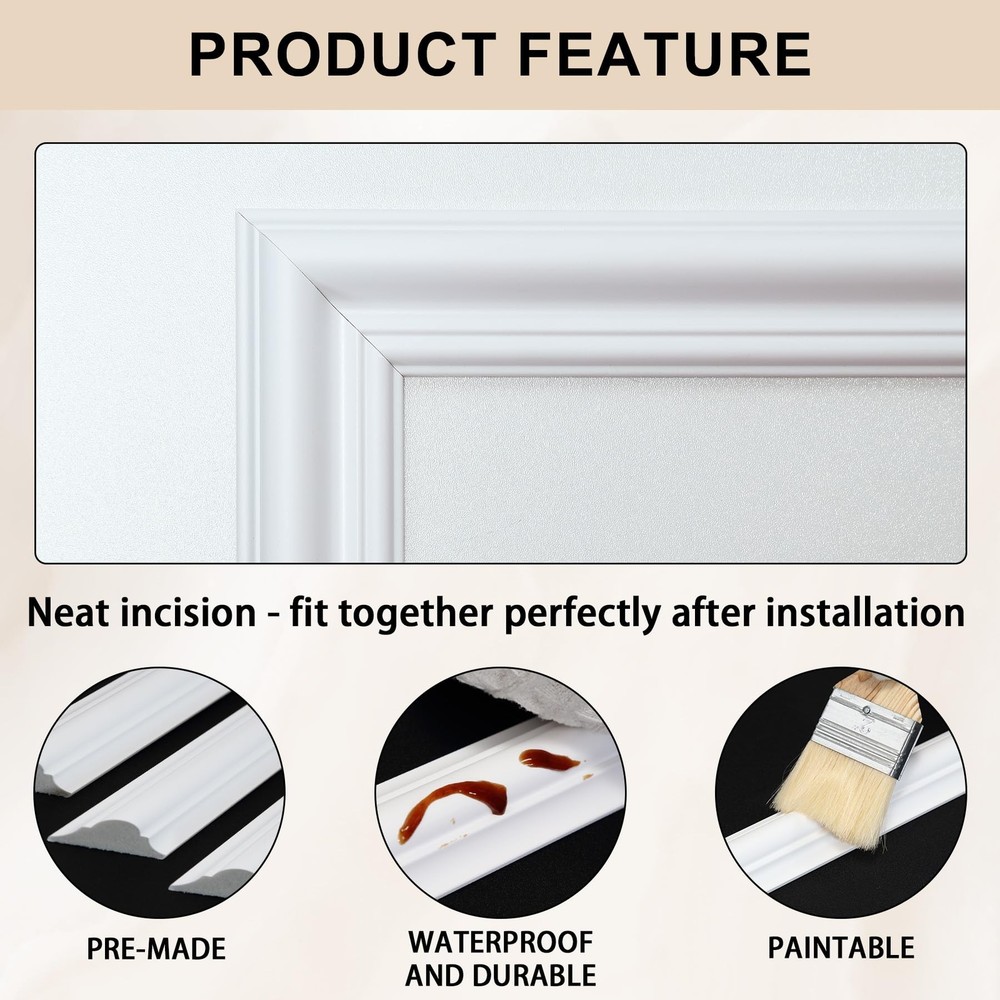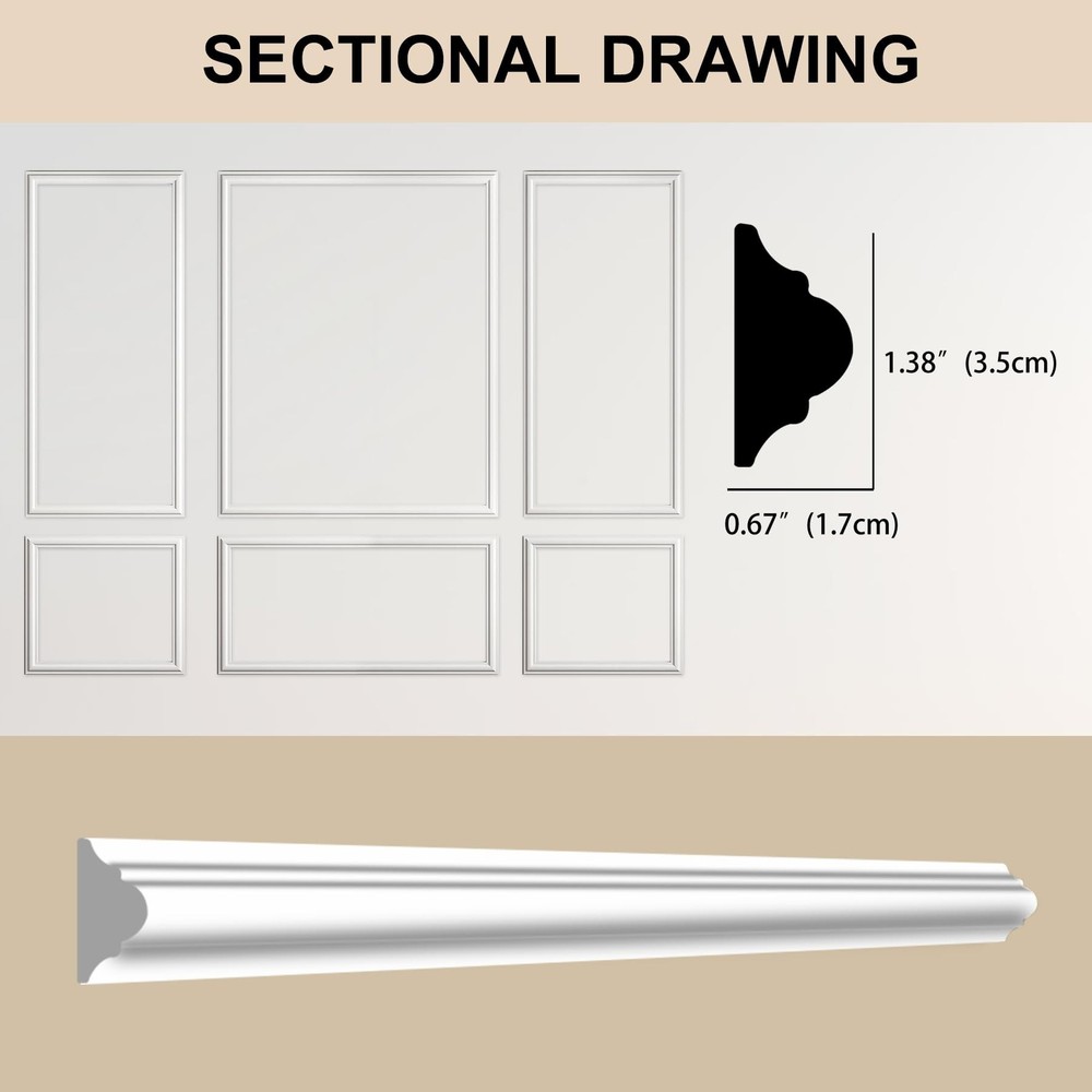 Pre-Cut Accent Wall Molding Trim Kit, 6 Frames Premade Wainscoting Panels for Interior Decoration, Ready to Assemble Chair Rail Moulding Product Details Size Name: 6-Frame, Section width: 1.4“ Color: White Brand: Hungbak MPN: PS-4 UPC: Does not apply EAN: Does not apply Manufacturer: Hungbak Part Number: PS-4 Item Weight: 7.19 pounds Package Dimensions: 52.3 x 6.5 x 4 inches Country of Origin: China Size: 6-Frame, Section width: 1.4“ Color: White Finish: Finished Material: Polymer Batteries Included?: No Batteries Required?: No Date First Available: November 6, 2024 Kit Contents: You'll receive pre-cut wall molding kits, with the 3-frame combo including 18 pieces or the 6-frame combo featuring 24 pieces Durable Material: Our molding kits are crafted from high-quality polystyrene, offering superior strength and durability. This material is superior to traditional wood, makes the panels resistant to scratches, cracks, and moisture, ensuring long-lasting beauty Effortless Assembly: Our DIY molding kits simplify your decor project, with pre-cut pieces that are easy to install, regardless of your skill level. No cutting or aligning is required, just apply structural glue Versatile Design: Add depth and sophistication to any room with our prefabricated wall molding kit. Customize the look by adjusting spacing and mixing sizes to create a personalized interior design Universal Use: Our trim enhances the elegance of various rooms, from bedrooms to hallways. It simplifies the decoration process, enabling you to achieve a stylish and refined home ambiance