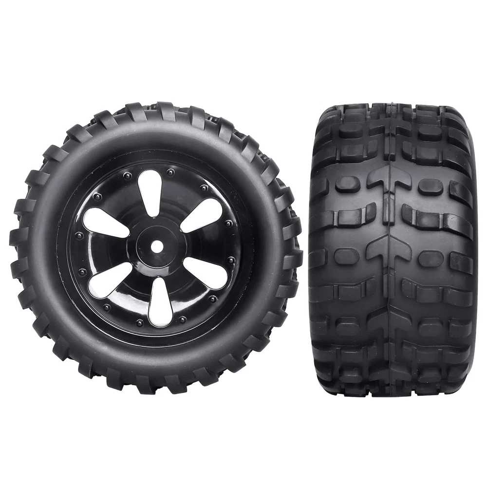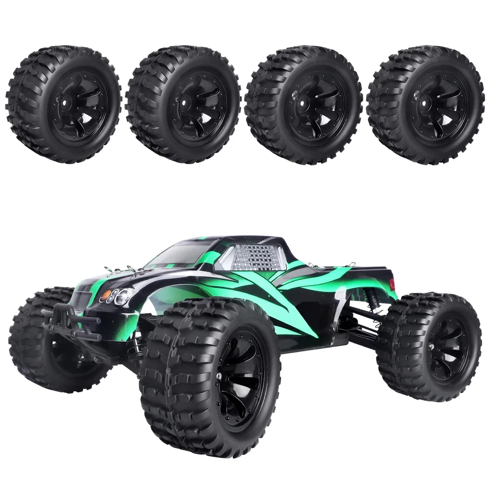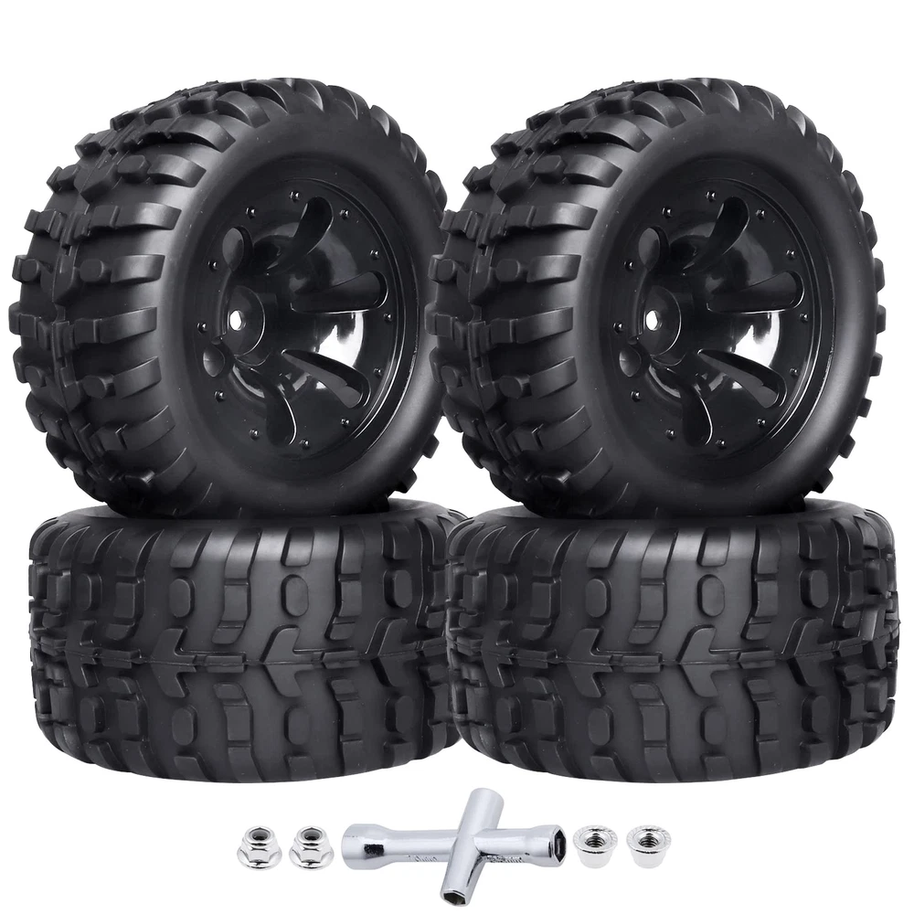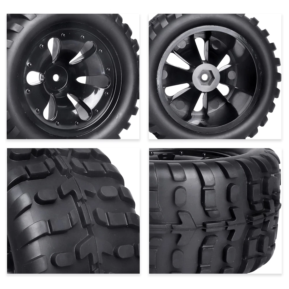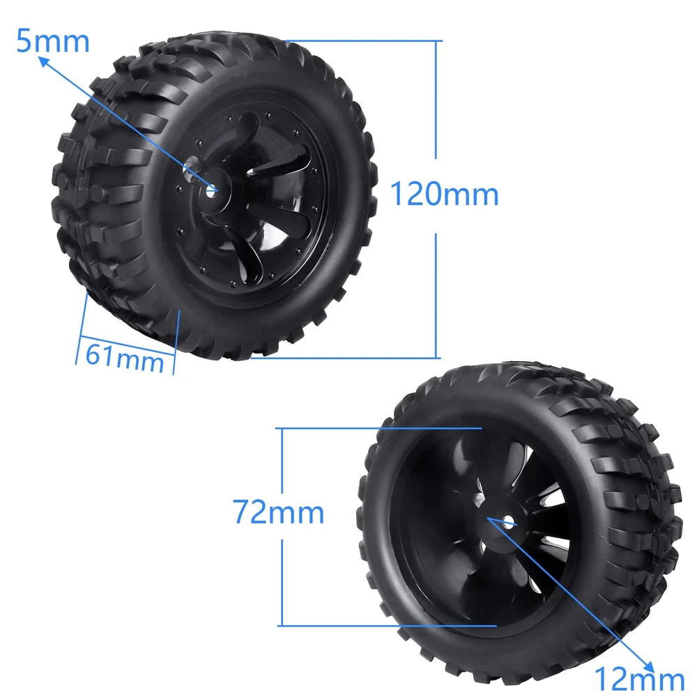 Note:The color of the item may vary slightly due to photography and your own computer /Please allow some little manual measurement error. Note:Check your specific model's manual for compatibility. ✔Pre-glued assembled.Compatible with Traxxas Rustler 4x4 VXL, Traxxas Stampede 4x4 / 2WD | Redcat Volcano EPX Pro, Redcat Volcano S30, Redcat Blackout XTE Pro and other Mostly Brands RC Monster Truck with 12mm Hex Hubs Size: Outer diameter(Height):4.72" (120mm) | Width: 2.40" (61mm) | Inner Diameter: 2.83" (72mm) | Wheel Hubs size: 12mm Hex | Axle Hole:5mm ✔All Terrain,deep tread pattern offers superior off-road performance on loose (dry and loamy), hard packed (dry), pavement or grass track conditions, ideal for monster truck ✔Package include: tires and wheels set (4), 4mm locknuts (4), cross wheel wrench tool (1)