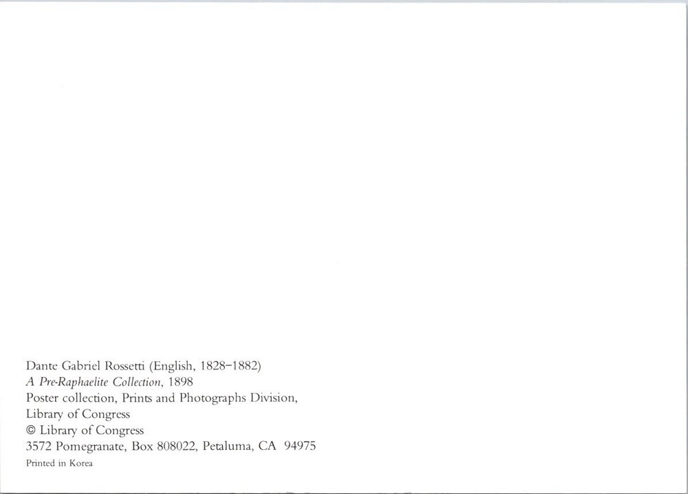 This beautifully stylized postcard reproduces an 1898 poster advertising the Goupil Gallery’s Pre-Raphaelite collection, including works by Rossetti, Burne-Jones, Holman Hunt, and more. A gem for lovers of Victorian art, symbolism, and design history. Printed by Pomegranate.