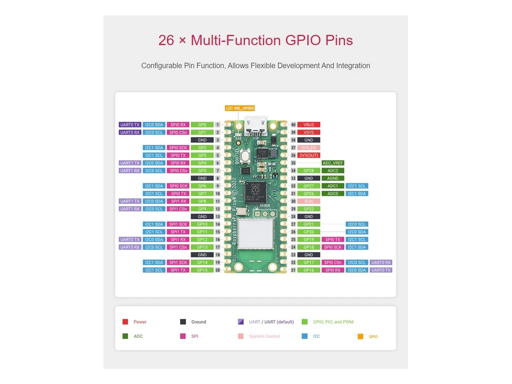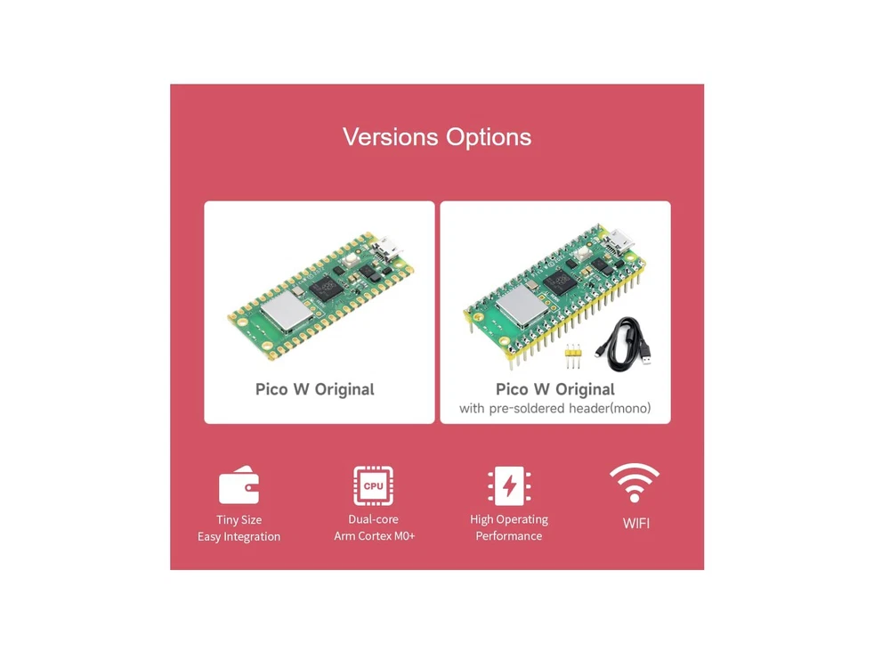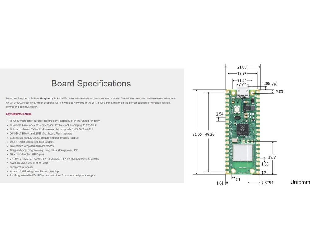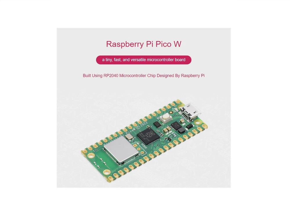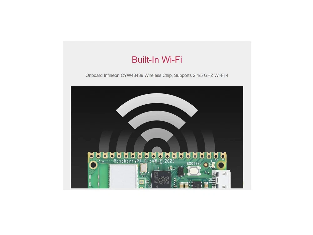 Raspberry Pi Pico W Microcontroller Board with pre-soldered headers , Built-In WiFi, Based On Official RP2040 Dual-Core Processor Board Specifications Based on Raspberry Pi Pico, Raspberry Pi Pico W comes with a wireless communication module. The wireless module hardware uses Infineon's CYW43439 wireless chip, which supports Wi-Fi 4 wireless networks in the 2.4 / 5 GHz band, making it the perfect solution for wireless network control and communication.. Key features include: RP2040 microcontroller chip designed by Raspberry Pi in the United Kingdom Dual-core Arm Cortex M0+ processor, flexible clock running up to 133 MHz Onboard Infineon CYW43439 wireless chip, supports 2.4/5 GHZ Wi-Fi 4 264KB of SRAM, and 2MB of on-board Flash memory Castellated module allows soldering direct to carrier boards USB 1.1 with device and host support Low-power sleep and dormant modes Drag-and-drop programming using mass storage over USB 26 × multi-function GPIO pins 2 × SPI, 2 × I2C, 2 × UART, 3 × 12-bit ADC, 16 × controllable PWM channels Accurate clock and timer on-chip Temperature sensor Accelerated floating-point libraries on-chip 8 × Programmable I/O (PIO) state machines for custom peripheral support Package Content Raspberry Pi Pico W with pre-soldered header x1 1*3PIN yellow pin header x1 USB-A to micro-B cable x1 FAQ What can I do if the Raspberry Pi Pico is disturbbed? 1. The pin that sets the input state must be initially pulled high or pulled low. 2. Replace the USB cable to see if there is a problem with the USB cable used. Note Online Development Resources is provided , please us if you have any problem . 【Raspberry Pi Pico W with pre-soldered header】a tiny, fast, and versatile microcontroller board.Built Using RP2040 Microcontroller Chip Designed By Raspberry Pi 【Built-In Wi-Fi】Onboard Infineon CYW43439 Wireless Chip, Supports 2.4/5 GHZ Wi-Fi 4 【Dual-Core Arm Processor】Dual-Core Arm Cortex M0+ Processor, Flexible Clock Running Up To 133 MHz 【C/C++, MicroPython Support】Comprehensive SDK, Dev Resources, Tutorials To Help You Easily Get Started 【26 × Multi-Function GPIO Pins】Configurable Pin Function, Allows Flexible Development And Integration