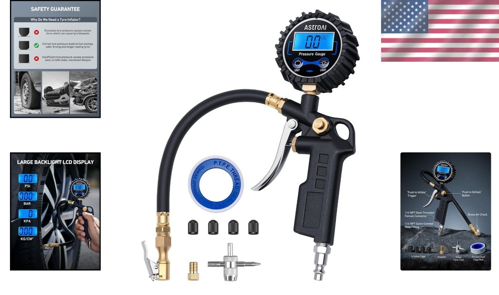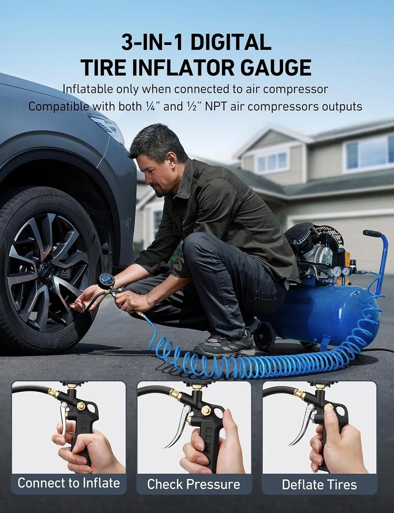 This digital tire pressure gauge is a game-changer! The 0.1 PSI resolution gives pinpoint accuracy, and the heavy-duty build feels solid in hand. Love the all-in-one design with inflator and bleed valve—no more switching tools. Works flawlessly with my air compressor, and the locking chuck makes filling tires effortless. Perfect for cars, bikes, or even heavy-duty trucks. A must-have for anyone who values precision and convenience!