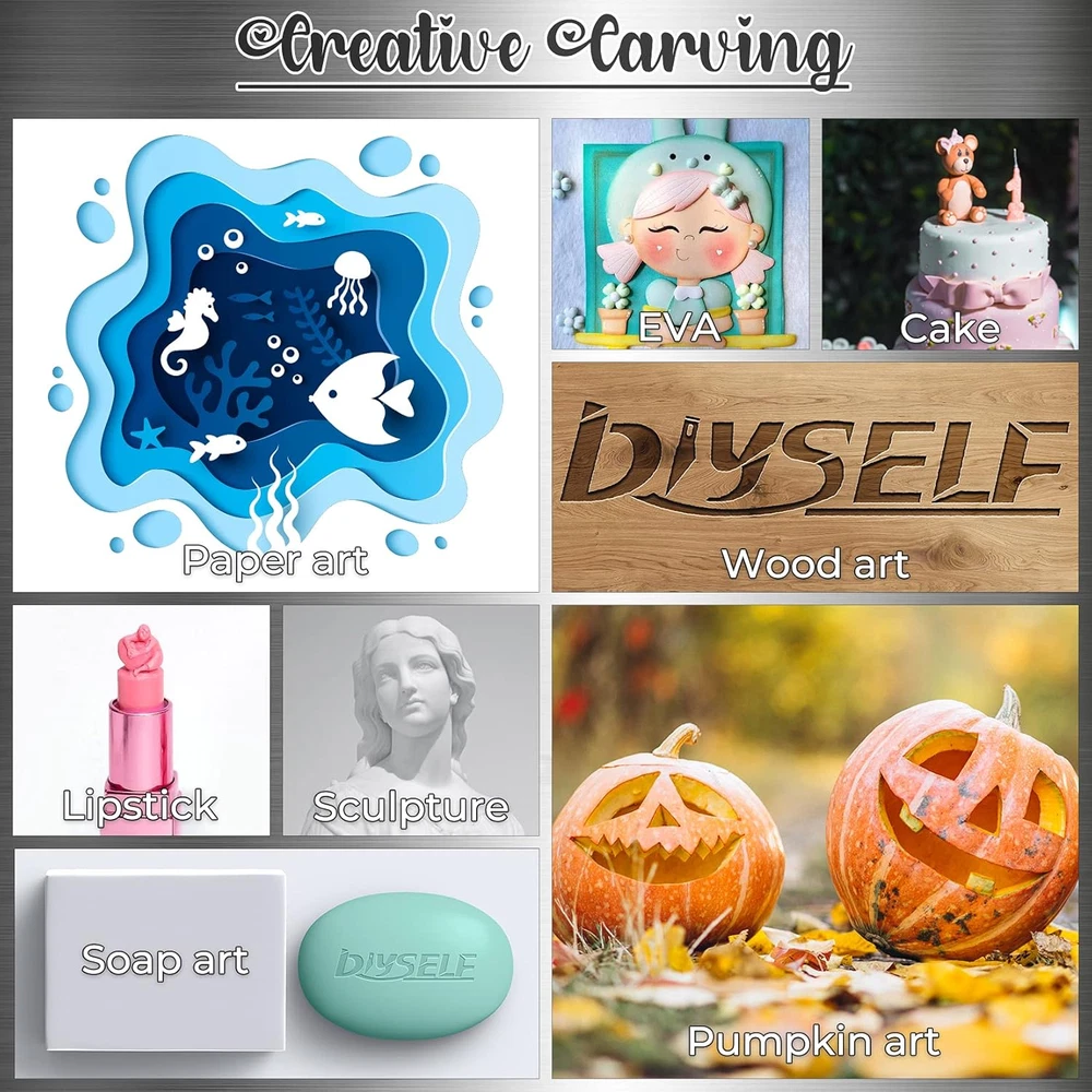 Elegant Dual-Toned Exacto Knives: This set features 2 Exacto Knives in striking gold and blue, adding a touch of sophistication to your toolkit. Crafted with precision from Aluminum, these craft knives stand out for their elegant design and cutting-edge performance. Extended Utility with 40 Spare Blades: Included in the set are 40 spare exacto blades, encompassing popular types such as #11, #16, and #17. Crafted from high-carbon steel, these exacto knife blades ensure a prolonged lifespan, allowing you to tackle diverse projects without interruption. Secure Grip and Control: The Craft Knives are designed with ergonomic handles, offering a secure grip and optimal control during use. The combination of the well-crafted handles and the sharpness of the high-carbon steel blades ensures a comfortable and precise cutting experience. Resistance to Wear and Corrosion: High-carbon steel Exacto Blades and Aluminum Exacto Knife Body provide exceptional resistance to wear and corrosion, making this art knife kit ideal for long-term use. and remain resilient in the face of frequent use and exposure to different materials. Ideal for Artistic and DIY Projects: Whether you're an artist or a DIY enthusiast, the precision and versatility of this hobby knife set make it indispensable. these exacting knives excel in intricate cuts across various materials such as paper, cardboard, and foam. Product Description GOOD GIFT CHOICE DIYSELF hobby knife kit is perfect as a birthday gift, Halloween or Christmas gift for friends, family, students, amateurs, sculptors, chefs, artists Tips: The blade is sharp, keep away from children. Please be careful when using it. DIYSELF CRAFT KNIFE SET Professional Carving Tools For You DIYSELF is a brand specializing in the production of carving knives and utility knives. Each set of carving knives is made by experienced craftsmen. Excellent workmanship and excellent quality. Widely used in paper art, wood art, fruit carving, pumpkin carving, etc. Handle Material: aluminum alloy Blade Material: high carbon steel Product Contains: 2 craft knives + 1 ruler + 20 #11 blades + 10 #16 blades + 10 #17 blades Product Packaging: sealed bag #11 Blades Fine Point Blades: It can engrave lines and patterns, especially when engraving the flat white space or cutting edges. #16 Blades 45° Art Blades: It is used to carve rubber stamps or soap flower. It can carve the line pattern in the middle or the flat blanks in the middle or around it. #17 Blades Flat-Angle Blades: the blade edge is flat and has no slope. It is usually used to shovel flat blanks and make the works smoother and more beautiful. Scrapbook Journal Students can use hobby knife to carve stickers, make scrapbooks, and make crafts. Fruit Carving Chefs can use craft knife to carve watermelons, carrots, fruits, etc. Halloween Pumpkin Carving People can use precision knife to carve pumpkins on Halloween Great blades and fantastic value! You’re getting 2pcs craft knives with safety cap, 40pcs blades in 3 shapes, 1pc steel ruler(6inch/15cm long). Excellent set of knives that will last you a lifetime! Everything I needed, good quality blades, no flex and have not broken, Metal holders are fine. Hobby knife is especially nice to work with and allows a bit more precision control. Great tool.Do exactly what you want it for... I’d highly recommended purchasing these if you do a lot of craft projects!