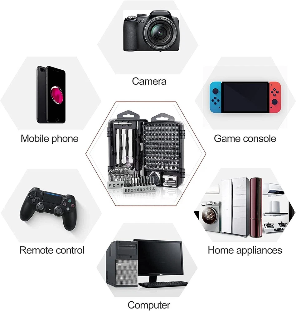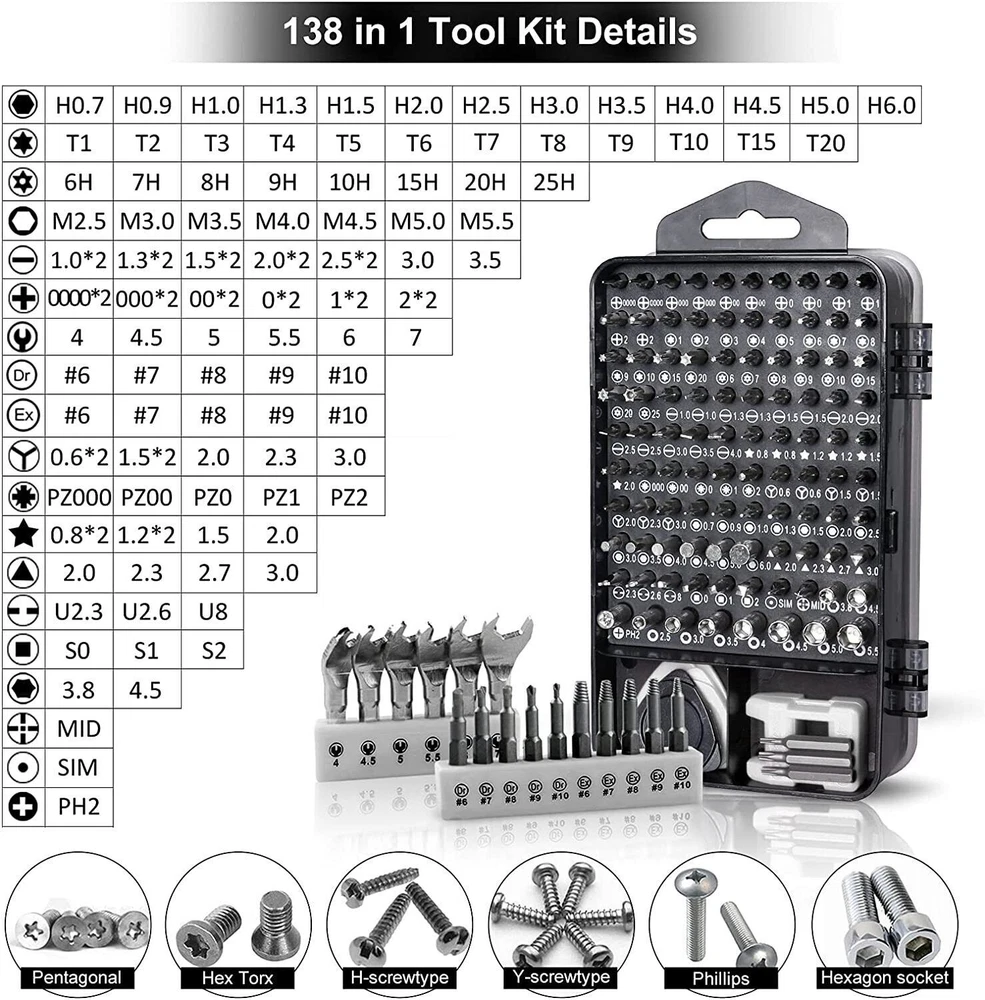 Pshcanyin DESCRIPTION PAYMENT SHIPPING RETURN POLICY CONTACT US Precision Magnetic Screwdriver Bit Set PC Phone Watch Repair TORX Tool Kit Case Magnetic precision bits and multi-functional: repair kits includes different types of screwdriver bit, and all the bits are magnetic, stably connect with the handle. Extension bar: The extra extension bar lengthens the handle, easy to reach narrow places. Handle: Ergonomically and non-slip handle for great comfort and precision. Good quality material: Made of chrome-vanadium steel, which is nontoxic, strong hardness, durable and precise. Multifunctional: Meets your different needs, such as repairing or opening your smart phone, tablet, laptops, mobile devices, wrist watches, eyeglasses and other electronic devices. Easy carry: Comes with a storage case for easy carry, you could carry to everywhere, it also helps keep the tools organized. Set 32 in 1 32 Precision Bits Included: This all-in-one set comes with 32 different bits, including Torx, Phillips, and flathead, ensuring you have the right tool for any job. Perfect for repairing smartphones, laptops, glasses, watches, and even toys. Set 115 in 1 Package includes: 98x screwdriver bits 1x handle (handle) 3x extension pieces (flexible, for bits with adjustable length, for socket wrenches) 1x tweezers 3x slot opener 1x suction cup 1x needle for Sim tray 6x triangular openers (3x large, 3x medium) 1x magnetizer/demagnetizer for tips Product Highlights Tool material: steel C45 + CRV + PP Case material: plastic 98 screwdriver bits: Phillips: 2*PH0000 2*PH000 2*PH00 2*PH0 2*PH1 2*PH2 Slot: SL1.0 SL1.3 2*SL1.5 2*SL2.0 2*SL2.5 2*SL3.0 2*SL3.5 2*SL4.0 Trox: T1 2*T2 2*T3 2*T4 2*T5 2*T6 2*T7 2*T8 2*T9 2*T10 2*T15 2*T20 Pentagonal: 2*P2【☆0.8】 2*P5【☆1.2】 P6【☆1.5】 P8【☆2.0】 Hex:H0.7 H0.9 H1.3 H1.5 H2.0 H2.5 H3.0 H3.5 H4.0 POZI: PZ000 PZ00 PZ0 PZ1 PZ2 Three-point: 2*Y0.6 Y2.0 Y2.5 Y3.0 Triangle: 2*△2.0 △2.3 △2.6 △3.0 U-Shape: 2*U2.6 2*U3.0 Square:S0 S1 S2 MID:W2.0 W2.0 SIM:0.8 1.0 4MM Socket:M2.5 M3.0 M3.5 M4.0 M4.5 M5.0 M5.5 ICS:PH2 Set 138 in 1 The screwdriver set has 138 sets,117 precision screwdriver bits, including 10 Damaged Screw Extractor Set,6 mini wrenches,and 21 practical accessories in the repair box.For example, suction cups, magnetizers,magnetic pads,ESD tweezers,crowbars, memory mat, etc.Whether you are a professional or an amateur,you can use this electronic equipment repair kit to meet all your needs.This repair kit is suitable for repairing iphone,computers,PCs,tablets,Xbox,PS4,Nintendo,watches,glasses, cameras etc. Item Specifics Brand : Unbranded Type : Watch Band Tool Color : silver Custom Bundle : No Material : Metal Model : no Suitable For : watch strap replacement Country/Region of Manufacture : China Seller Warranty : Yes Type of Tool : Link/Pin Remover Payment Shipping Returns Contact Us 1.We only accept PayPal. 2.Please double check your shiping address before payment,thank you. 1.We ship to your eBay or Paypal address. Please make sure your eBay and Paypal address is correct before you pay. 2.Item will be dispatched within 1-2 business days after receipt of full payment. 3.Items located in AU,Delivery time depends on destination and other factors 1.If the item you received is faulty, damaged or incorrect, or any further problems, you can return it for replacement or refund, please contact our customer service on eBay within 30 days from item received. 2.For damaged items on arrival, please contact us immediately, sending us an email with a photo is preferred. We will offer solutions to such cases. Full refund or replacement will be guaranteed. If you have any questions,please feel free to contact us,thank you. All rights reserved. Shop Category Store Home Fairy Lights Kitchen Supply ◈ Cake Decorations ◈ Food Storage Door Knobs Beauty Other Hot Item 200 Quart Size Vacuum Seal Bags 8x12 Embossed Food Saver Sealer Storage Bag 4Mil USD 32.80 10x T Bar Knob Stainless Steel Kitchen Cabinet Pulls Cupboard Door Handle Drawer USD 6.99 500 4x6 Fanfold Direct Thermal Shipping Labels Blank for Zebra and Rollo Printer USD 15.49 10Pcs Crystal Glass Clear Door Knob Drawer Cabinet Furniture Kitchen Handle Pull USD 9.91 4 Pack Vacuum Seal Bags Roll 8”x50’ Embossed Food Saver Sealer Storage Bag 4 Mil USD 33.86 Delivery New List Item 100x Clear Packing List Pouches 7.5 x 5.5 Shipping Label Envelopes Self Adhesive USD 8.99 2"x1" Direct Thermal Labels Barcode FNSKU / UPC/ FBA 1300/Roll for Zebra & Rollo USD 7.98 7in1 External CD DVD Drive Type C USB3.0 Disc Player Burner Writer For Laptop PC USD 19.90 999000LM LED Headlamp Headlight Zoomable Head Torch Lamp Flashlight Rechargeable USD 11.88 9-Eye Projector Laser Light RGB DMX Strobe Beam Stage Lighting Party Club Lights USD 49.79 Help & Info Payment Policy Shipping Policy Return Policy FAQ About Us