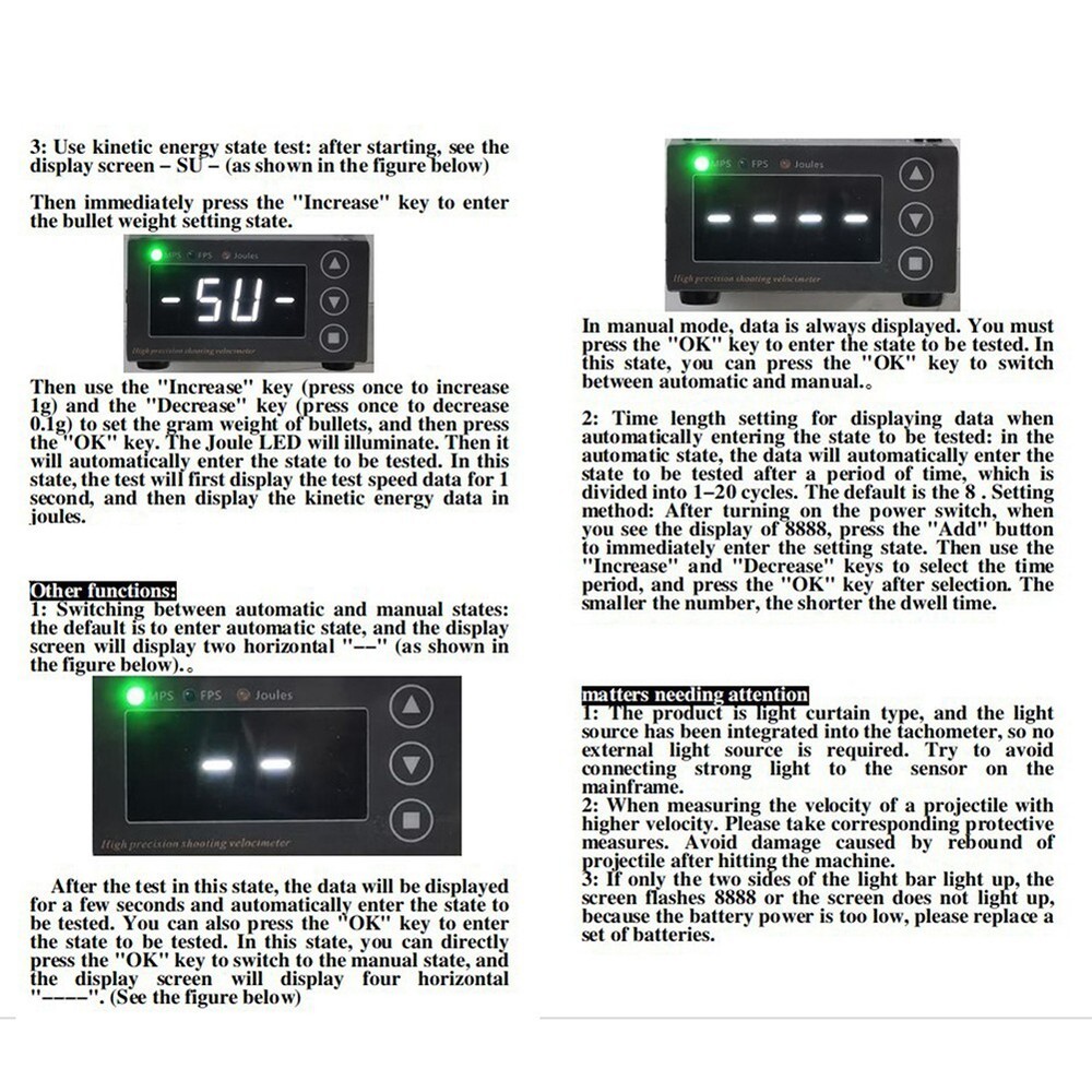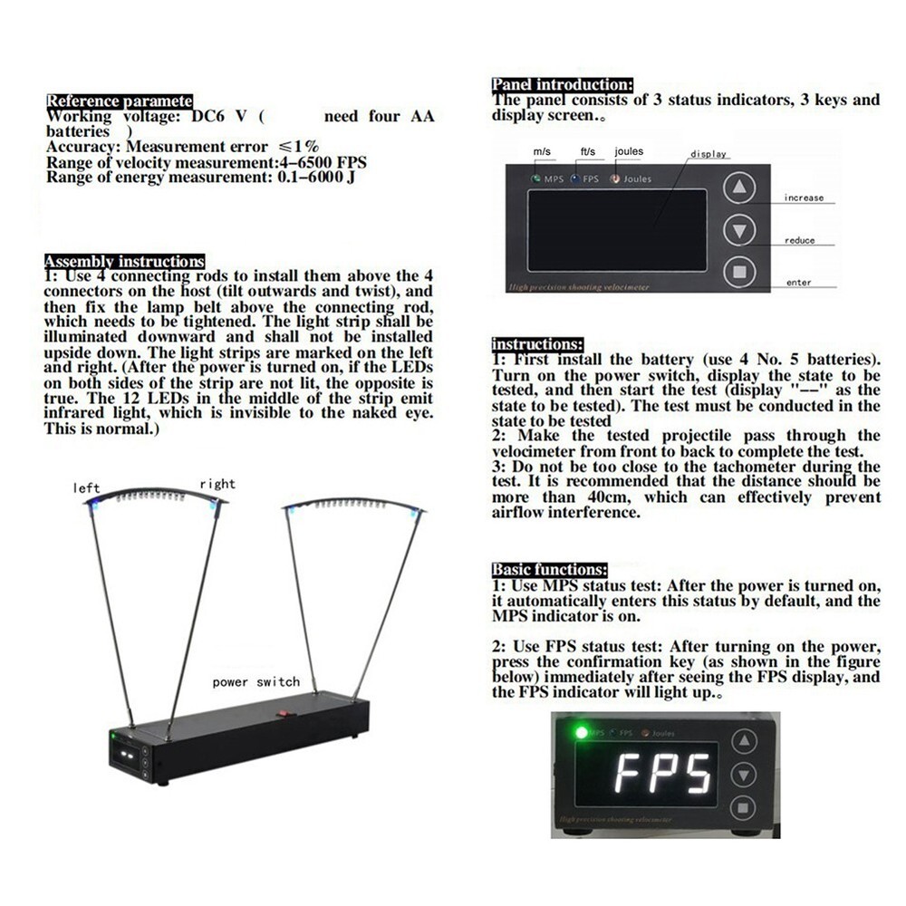 Product Description Features: * Accurately measure the speed. * Perfect for enthusiasts. Use it to measure the speed of table tennis balls, badminton shuttlecocks, and even children's soft toys. * With an accuracy of +/-1% of measured velocity or better, you can trust reliable results every time. * The device is easy to use and portable, making it perfect for use outdoor. It can be mounted on a tripod (not included) or placed on a table or bench top. Specification: Voltage: DC 6V Powered by: 4 * AA battery (not included) Working Temperature: -30℃ - 60℃ Accuracy: test error ≤ 0.5% Measuring Range: 0-3000M/S (FPS range 30-9999) Item Size: 330 * 80 * 44mm / 12.99 * 3.15 * 1.73in Package Size: 350 * 110 * 110mm / 13.78 * 4.33 * 4.33in Item Weight: 436g / 0.96lb Package Weight: 681g / 1.5lb Package Includes: 1 * Speed Meter Note: 1. The real color of the item may be slightly different from the pictures shown on website caused by many factors such as brightness of your monitor and light brightness. 2. Please allow slight manual measurement deviation for the data. Payment Payment must be completed within 5 days. If you have any problems about payment, please contact us via ebay message. Delivery details We only ship to confirmed ebay Order addresses. Please comfirm that your Order address is in line with your shipping address. Please kindly note that the c ombined shipping is not provided because the shipping fee is calculated by weight. Also, the each additional item means exactly the the same color and size. It takes about 7 -15 working days to US; about 10-30 working days to other countries. Transit time may be a little delayed because of the bad weather and customs inspection . If you do not receive your item within 30 working days since payment finished, please contact us immediately for further assistance. Contact us We strive for 100% customer satisfaction! Positive Feedback is very important to us. If you have any questions, p lease feel free to contact us via "Ask seller a question" . We will reply your email within 24 working hours.