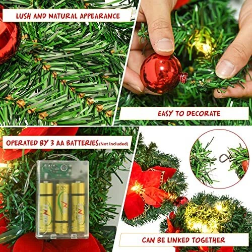 30 Days Return Policy Fast Delivery Trusted seller Prelit Artificial Christmas Garland,9FT Christmas Wreath for Christmas Decorations,Christmas Garlands with Lights,Rattan Decorations Xmas for Fireplaces Stairs,Holiday,Wedding Party,Evergreen Product Description ??【Beautiful and Generous】The beautiful garlands decorations xmas approx length: 9 feet/2.7M . Enough large can be used in a variety of places around your home such as the stairs, the firplaces or even on door and window frames.Fully fluffed branches include 200 tips that provide a healthy, natural appearance, so your holiday decor resembles the pine tree leaves you see outdoors.The individual garlands can be connected to each other, which can meet your different size requirements! ??【Premium Material】 Christmas garlands made from PVC environmental protection and fire prevention material, fluffy effect to decorate your home, courtyard and garden at Christmas. Include variety gadget such as red flower and red ball etc,handcrafted vine for realistic visuals and feel, add a gentle festive atmosp to your furniture. If you want to be longer or pine leaves to look more fluffy, it is recommended to buy 2 packs. ??【Battery Powered LED Lights】Xmas Garland Decor Pre-strung with 30 LED lights. Two gear adjustment modes: one always bright, one flashing. The LED Lights of Garland Operated by 3 AA batteries (not included). They will not limited by the power cords. You can hang it anyw you want. Pre-lit garland will light up the night and makes it more eye-catching and striking, look beautiful and elegant. ??【Christmas Atmosp】Perfect for Christmas party, weddings, festivals. Ideal for over the fireplace, up the stairs, along the window, around the door... just about anyw this Christmas,This Full of life decoration garland is an ideal way of decorating your home this Christmas. Enough to decorate your Christmas tree from tip to toe. Use your imagination, our artificial garland is the perfect basec to add your creative. ??【Please Notice】Christmas garlands with lights in the transport process may be flattened . CORDLESS: Free of the need for plug-in, this garland strip is ready right out of the box, all you have to do is shape it and fluff the needles to give it the width and look you desire.Before use, you need to buy 3 AA batteries. Shipping Returns Payment Shipping Shipping is FREE to all addresses other than APO/PO boxes in the lower 48 states. All our stock ships from US-based warehouses. Shipped via USPS or UPS (depending on location and package weight) Unless stated otherwise, all orders will ship within 24-72 hours of your payment being processed. Check our feedback to see the great reviews of FAST shipping we offer. Returns As our valued customer, we will do our best to make sure the product you receive arrives to you on time and as expected. If you are not satisfied with your purchase, please contact us within 30 days of receiving your order to process a return. Payment We currently accept payment via eBay managed payments only. Once payment is cleared, we will dispatch your shipment within 1-3 business days. Please refer to the "Shipping" tab for more information regarding shipping speed to your destination.