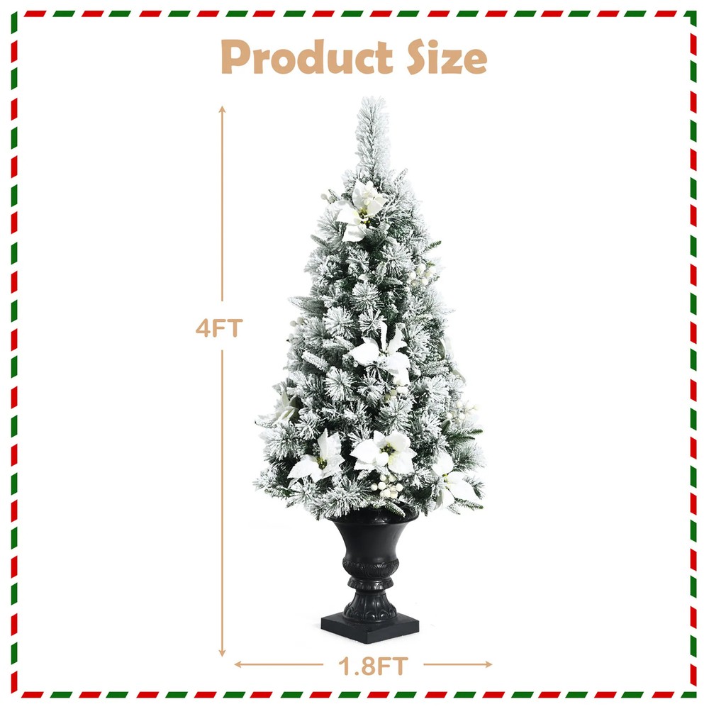 Our gorgeous entrance tree can not only refresh your room decor, but also leave a good impression for your guests. Made of premium materials, this tree is odorless, non-toxic and nonflammable in daily use. Thanks for 100 LED lights which will create warm and romantic party atmosphere. Come and buy it and using it to make a warm welcoming place or increase festive atmosphere!Features: Premium new material for safe and long-term use Stable base allows the tree can stand firmly anywhere Equipped with 100 LED lights and you can enjoy a brilliant lighting show Trimmed with classic Xmas elements such as holy white flowers and berries 3 different types of branch tips make the tree ultra-realistic Totally a gorgeous entrance tree that can refresh your room decorSpecification Color: Green Free Shipping Over $49.99* Details Prelit Flocked Christmas Entrance Tree Pack Artificial Christmas Tree Product Description: Our gorgeous entrance tree can not only refresh your room decor, but also leave a good impression for your guests. Made of premium materials, this tree is odorless, non-toxic and nonflammable in daily use. Thanks for 100 LED lights which will create warm and romantic party atmosphere. Come and buy it and using it to make a warm welcoming place or increase festive atmosphere! Features: Premium new material for safe and long-term use Stable base allows the tree can stand firmly anywhere Equipped with 100 LED lights and you can enjoy a brilliant lighting show Trimmed with classic Xmas elements such as holy white flowers and berries 3 different types of branch tips make the tree ultra-realistic Totally a gorgeous entrance tree that can refresh your room decor Specification ColorGreen MaterialNew PVC, New PE, Plastic Overall Dimensions4' x 1.8'(H x D) Net Weight10 lbs Number of Tips223(156 PVC Tips, 33 Pine Needles, 34 PE Tips) Number of Lights100 Package includes: 1 x Pre-lit Snow Flocked Entrance Tree