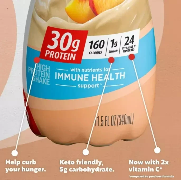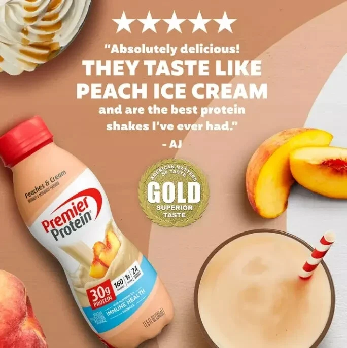bout this item Brand Premier Protein Flavor Peaches & Cream Number of Items 12 Allergen Information Milk, Soy Package Information Bottle Get ready for sweet, luscious peach flavor that will make you wonder if you even need ice cream and cobbler; Winner of American Masters of Taste Gold Medal for SUPERIOR TASTING ready-to-drink protein beverages 30g of protein to help curb your hunger, as a mid-day snack or for post workout recovery; includes all essential amino acids 24 Vitamins and Minerals: Support a healthy immune system as part of a healthy diet and lifestyle (Antioxidants Vitamins C and E plus Zinc), 50 percent daily value of calcium and 30 percent daily value of Vitamin D to help maintain healthy bones Guilt free indulgence: Satisfying low fat shake with 1g sugar, 3g carbs, 160 calories and Keto friendly Try all eleven (11) delicious smooth and creamy flavors: Chocolate, Vanilla, Caramel, Cookies & Cream, Cafe Latte, Strawberries & Cream, Peaches & Cream, Bananas & Cream, Cinnamon Roll, Chocolate Peanut Butter and Cake Batter Delight Skip the hassle of protein powder with the convenience of this ready to drink protein shake; great on the go nourishment that also pairs well with coffee, cereal, a pancake recipe, or in your favorite smoothie NOTICE: Use this product as a food supplement only. Do not use for weight reduction Contains: Milk and Soy. Ingredients Water, Milk Protein Concentrate†, Calcium Caseinate†, Contains less than 1% of High Oleic Sunflower Oil or Soybean Oil, Natural and Artificial flavors, Inulin, Cellulose Gel and Cellulose Gum, Salt, Sucralose, Acesulfame Potassium, Carrageenan, Tripotassium Phosphate, Dipotassium Phosphate, Sodium Hexametaphosphate, Vitamin and Mineral Blend (Dl-alpha-tocopheryl Acetate [Vitamin E], Zinc Glycinate Chelate, Ferric Orthophosphate, Vitamin A Palmitate, Niacinamide, Phytonadione [Vitamin K1], Potassium Iodide, Cholecalciferol [Vitamin D3], Copper Gluconate, Calcium D-Pantothenate, Manganese Sulfate, Sodium Selenite, Biotin, Sodium Molybdate, Folic Acid, Thiamine Mononitrate [Vitamin B1], Cyanocobalamin [Vitamin B12], Pyridoxine Hydrochloride [Vitamin B6], Riboflavin [Vitamin B2], Chromium Polynicotinate), Magnesium Phosphate, Sodium Ascorbate. CONTAINS: MILK AND SOY.