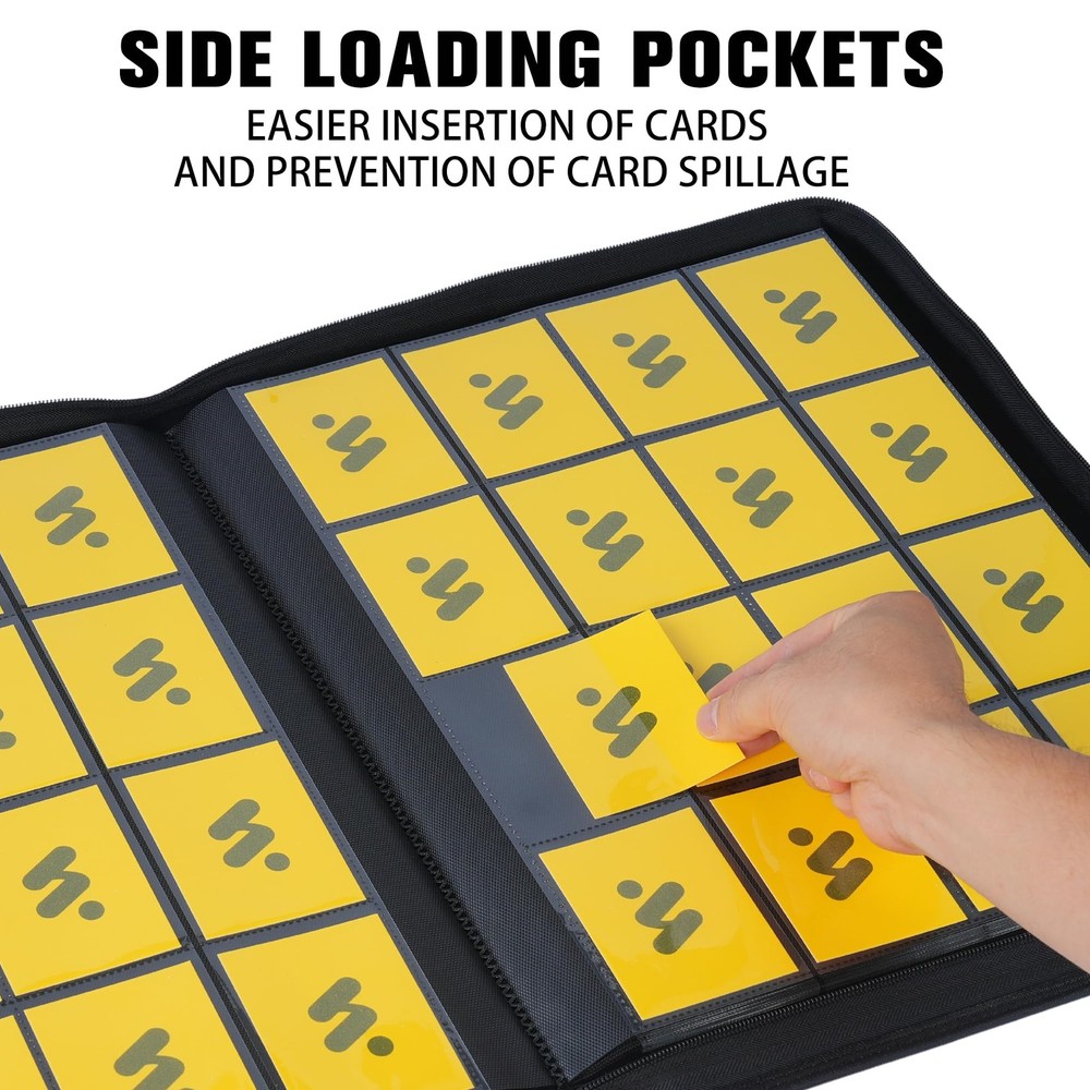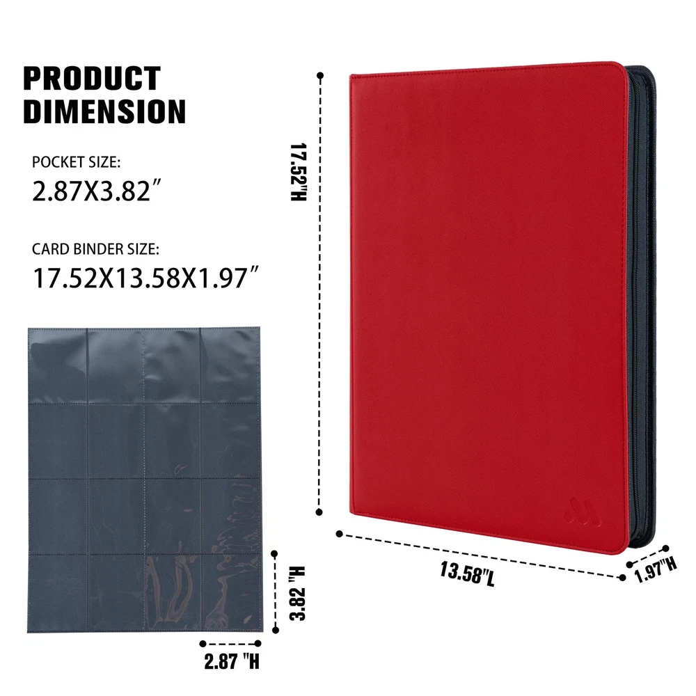 Why choose our card collector's album? 1.The 1000 card binder has a large number of pockets, capable of holding 1000+ trading cards. 2.The portable card binders keeps all cards organized in one place, instead of scattered everywhere. 3.The card holder binder is compatible with standard-sized trading cards, game cards, sports cards, and more. 4.You can take your collection with you anywhere. Features How many cards can it hold? Holds up to 1000+ trading cards 16 pocket per page 32 Double Sided Pages Fit multiple standard size cards Specification Pocket size:2.87X3.82" Card binder size:17.52X13.58X1.97" Weight: 4.63lb What is included? 1x 16 Pockets Card Binder Large Capacity-This Trading Card Binder with 32 Double Sided Pages,16 pocket per page,holds up to 1024 cards.Provides plenty of space to keep all your cards organized,not disorganized. Wide Application-The 1000+ card binder is compatible with multiple standard size cards,compatible with TCG cards/baseball cards/basketball cards/football cards/sports cards and more.(NOT INCLUDED trading card) Waterproof Matter-Made of Waterproof PU-leather,our 4x4 card binder is long-lasting,waterproof,dust-proof,and moisture resistance.Smooth and waterproof surface is easy to clean,you can easily wipe away stains or water stains,which makes your card binder look like as always new. Multiple Protections-The closed zipper design ensures that the cards will not fall outside,and the card sleeves are made of high-quality-matter to protect your cards from fading and staining. DESIGN - Each 16 pocket card binder is custom-designed by and holds a trademark, focusing on its own brand design to ensure the quality of the brand. If you are not satisfied with the card binder for any reason, please contact us as soon as possible, and we will provide you with a satisfactory solution.