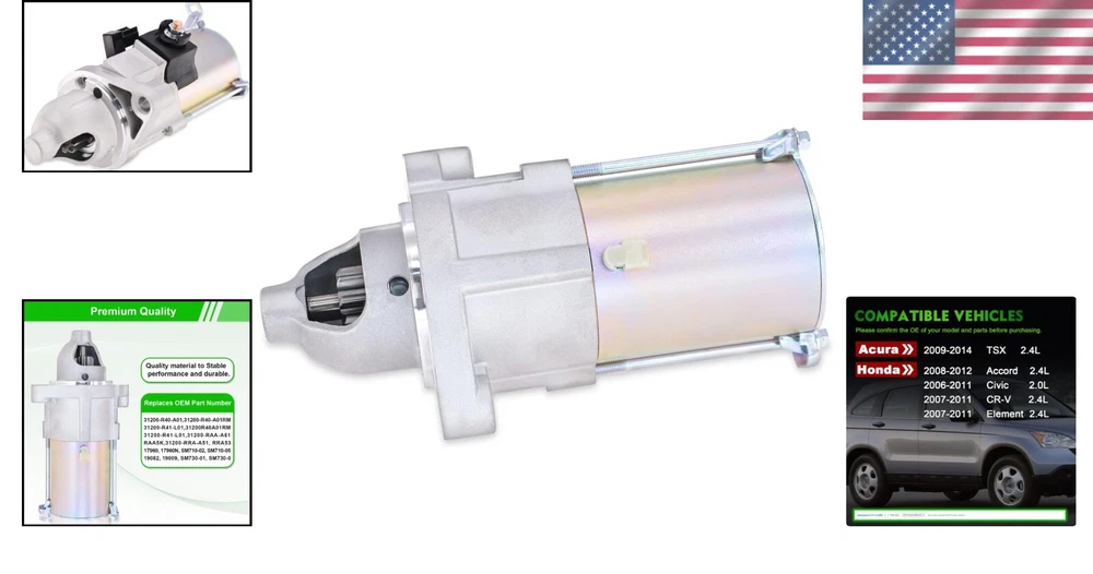 Premium 12V Starter Motor for Honda Accord, Civic, CR-V and Acura Models ‹ › ‹ › ‹ › ‹ › ‹ › ‹ › ‹ › ‹ › Premium 12V Starter Motor Designed for Honda Accord, Civic, CR-V and Acura Models Features: Upgrade Planetary Shaft and Starter Drive: Engineered for maximum durability and longevity. High-Quality Materials: Drive End Housing made of Aluminum-Alloy Die-Castings for strong corrosion protection. Precision Engineering: Plunger crafted via CNC machining ensures accurate and precise sizing. High Temperature Resistance: Utilizes 200°C high temperature resistant copper wire for solenoids and armatures. Perfect Fitment: Compatible with: 2006-2012 Honda Accord 2006-2011 Honda Civic 2007-2011 Honda CR-V 2007-2011 Honda Element 2006-2008 Acura CSX 2006-2014 Acura TSX Replace part numbers: , 17960N, 17960, 31200R40A01, 31200RAAA61, 31200RRAA51, 31200R41L01, SM710-05, SM710-02 Premium Quality Assurance: Consistent starting power with a reliable solenoid that engages effortlessly. High standards for components such as wiring, brushes, insulation, and bearings. High-performance machining ensures ease of installation. Manufacturing Excellence: Brand new starters are manufactured under OE specifications and ISO Quality Standards. Each unit is subjected to 100% computerized load and power testing ensuring reliability, durability, and performance. A professional test report is included with each shipment, confirming that all units meet original vehicle requirements. After Sales Care: Your purchase includes a 1-Year Warranty, offering peace of mind and assurance of quality. Elevate Your Driving Experience: Revitalize your vehicle's performance with our Premium 12V Starter Motor. Trust in high-quality engineering and premium materials to ensure your Honda or Acura starts reliably, regardless of conditions. Invest in the reliability and longevity of your vehicle today! Shipping Free & Fast Shipping - We offer free shipping to most of the USA with a normal delivery time of 3-7 days. However, due to the current situation, additional delivery time (up to 3 weeks) may be required for some items. Alternative Carriers - We may use alternative carriers (e.g. USPS, FedEx, UPS, etc.) to ensure your package arrives safely and on time. Due to the use of multiple carriers, we are unable to provide a tracking number automatically. Handling Time - Orders are processed and shipped within 1-2 business days of receiving cleared payment. Shipping Restrictions - Shipping to Alaska, Hawaii, Puerto Rico, Guam, and other US territories may incur shipping charges or delivery restrictions. Please contact us before ordering, or your order can be refunded/cancelled. State Restrictions - There may be restrictions based on your state of purchase. For example, certain items may not be shipped to California due to state regulations. Contact for Tracking Updates - If you require tracking updates or have any concerns about the delivery of your order, please feel free to contact us, and we will be happy to assist you. Return 30-Day Hassle-Free Returns - We want you to be completely satisfied with your purchase. If you are not, you can return the item within 30 days of receiving it for a full refund or exchange. Easy Return Process - To start a return, simply contact us and we will provide you with a prepaid return shipping label and detailed instructions. Restocking Fee - There are no restocking fees for returns. However, the buyer is responsible for return shipping costs if the return is not due to a seller's error. Refund Processing Time - Refunds will be processed within 5 business days of receiving the returned item in its original condition. Payment We accept all major credit cards, PayPal, and Apple Pay for your convenience. Your payment information is secure and encrypted to ensure a safe and seamless transaction. Please complete your payment within 3 days of purchase to avoid any delays in shipping. Feedback Your feedback is extremely important to us. We strive to provide the best products and customer service possible. If you are satisfied with your purchase, please take a moment to leave us a positive review. If you have any concerns or issues with your order, please contact us before leaving negative feedback. We are committed to resolving any problems and ensuring your satisfaction. Contact Us If you have any questions or concerns, please feel free to reach out to our customer support team. You can contact us through the eBay messaging system. We are available Monday to Friday, 9:00 am to 5:00 pm EST, and we will do our best to respond to your inquiry within 24 hours. Buy it now and enjoy a pleasant shopping experience! UPC: Not Set Features: Clockwise Rotation,Upgrade Planetary Shaft,Starter Drive,Corrosion Protection,Accurate Plunger Size,Engineered for Maximum Durability Finish: Unfinished,Aluminum-Alloy Die-Castings Brand: Unbranded Number of Holes: 2 Number of Teeth: 1 Type: Starter Motor Voltage: 12 V Power Rating: 1.6 kW Manufacturer Part Number: Not Set OE/OEM Part Number: Not Set Manufacturer Warranty: Not Set Country/Region of Manufacture: Not Set Interchange Part Number: Not Set Mileage: Less Than 10 Superseded Part Number: Not Set Performance Part: Not Set Vintage Part: Not Set Universal Fitment: Not Set