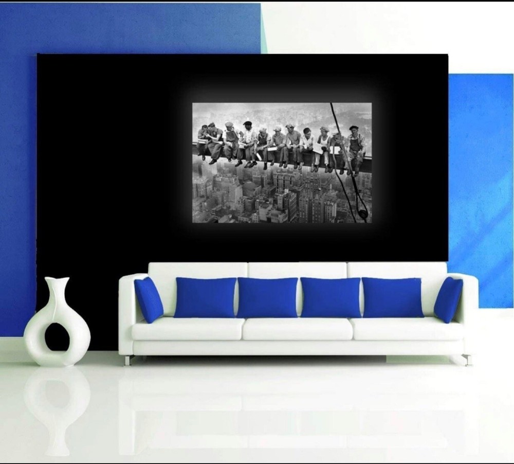This premium canvas print features a stunning image of lunch being served at the top of a skyscraper, with a backdrop of the iconic RCA building. Measuring 48 x 32 x 1.5 inches, this piece is a high-resolution Giclee print that is handmade in the USA. The print is stretched onto a pinewood frame and canvas wrapped, creating a beautiful and unique look. The artwork showcases the American culture and the ironworkers who built the RCA building in 1932. The contemporary art and vintage modern style of the piece make it a great addition to any art collection. This single piece unit is framed and ready to hang, adding a touch of sophistication to any room.
