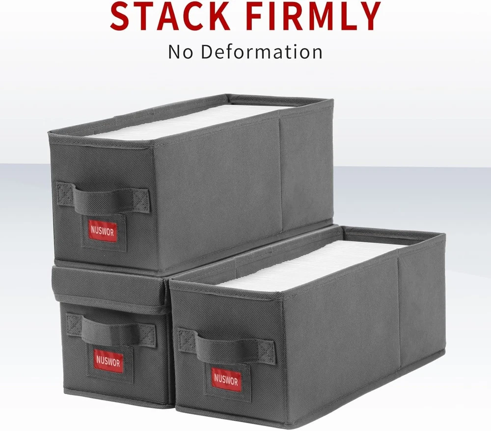 Premium CD Storage Box - Stackable CD Organizer Box with Lid - Holds 70 Jewel Cases - 14.37 x 5.5 x 6.3 inches - 4 Pack - Grey 【Versatile CD Storage】Unclutter your scattered CD collections and keep your space tidy with our smart CD storage boxes. Designed to hold up to 35 jewel-case, 70 slim-case, or 200 CDs in sleeves, it's a real lifesaver for CD enthusiasts! 【Stackable and Space-Saving Design】Our CD storage boxes have a dimension of 14.37x5.7x6.3 inches, perfect for stacking and maximizing your storage space. Say goodbye to messy spaces and hello to an organized lifestyle! 【Stackable and Space-Saving Design】Our CD storage boxes have a dimension of 14.37x5.7x6.3 inches, perfect for stacking and maximizing your storage space. Say goodbye to messy spaces and hello to an organized lifestyle! 【Protective CD Storage】Features lids to keep dust and scratches away. Our CD box storage has been meticulously designed to keep your CDs, DVDs, and tapes in mint condition. 【Convenient CD Storage Shelves Alternative】Fed up with bulky CD shelves? Try our compact and lightweight CD case organizer. It's a perfect combination of convenience, space-efficiency, and visual appeal!