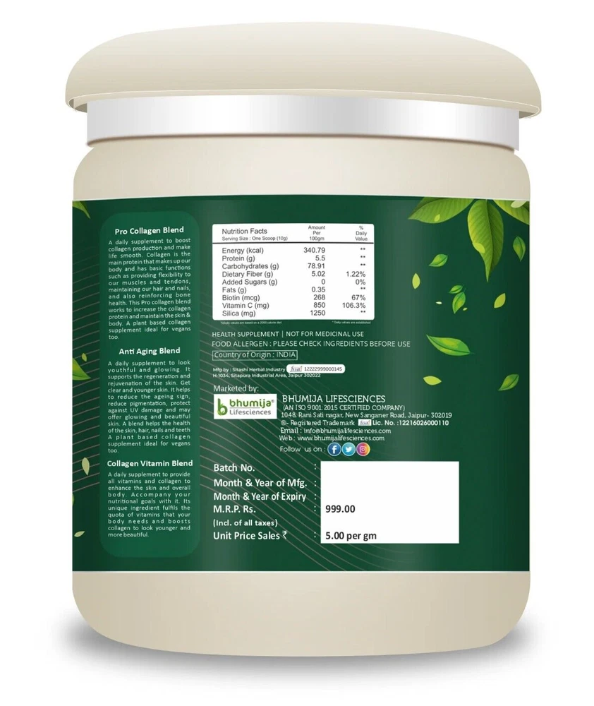 Bhumija Himalayan Shilajit Resin Back to 20's-Plant Based Collagen Powder is 100% natural with more than 20 ingredients. Collagen is an essential protein to restore lost skin elasticity and rejuvenate the skin cells. BHhumija Back to 20's-Plant Based Collagen Powder is enriched in 3 types of advanced collagen blends. Pro collagen Blend : 3 gm || Guava Powder, Sea Buckthorn, Lemon Powder, Rose P, Spinach Powder, Pink Salt, Spirulina Powder, Barley Grass, Amla Powder, Holy Basil. Anti Aging Blend: 2 gm || Pomegranate Powder, Evening Primrose Extract, Turmeric Extract, Acai Berry, Ginger Powder, Pink Salt, Tulsi Extract Collagen Vitamin Blend: 1 gm || Watermelon Powder, Acerola Cherry, Sesbania Agati, Bamboo Shoot Extract, Stevia. All ingredients together deliver a lot of vitamins and minerals to the body and support collagen production. It helps to make the skin look younger and glowing as well as support bone, gut and muscle health too. Well, collage production is natural in the human body. But we start losing it after 25. To stop the collagen loss, we bring Back to 20's-Plant Based Collagen Powder. It helps you to feel like you're in your 20s again with regular use. Make your skin healthy and radiant. Benefits of Collagen Powder · Youthful & Glowing Skin: When skin loses collagen, it starts looking old and dull. Our supplement powder increases the collagen, restores the lost collagen and acts as anti-ageing. Its natural ingredients also provide vitamins and minerals which make the skin healthier and glowing. · Hair Health: Collagen is also good for hair health because it is linked to keratin protein. An ingredient like amla, spinach, etc is great for hair and helps to strengthen the hair roots, nourish the hair roots and support hair growth. · Strong Bones: Collagen is important for tissues that are part of bones, joints and muscles. It also helps in strong bone formation, reduces injuries and smoothes the joint's movements. It maintains strength and flexibility in each part. · Strong Muscles: Synthesis of collagen becomes active as the damaged muscle tissue recovers, so using our collagen at that time may help to form new, strong and hard-to-break muscle tissues. It helps to make muscles stronger. Note : It is a herbal dietary supplement. For better and more effective results, it is recommended to use it for 3-4 months or you can consult your healthcare professional. Results may vary from person to person. Directions For Use: 1. Mix 1 Scoop of Powder in a glass of water 2. Mix well 3. Consume daily twice a day after a meal Note: It is recommended to suggest it to a healthcare professional before starting to use the Bhumija Shilajit Resin. Remember, shilajit can lower blood pressure, so it is not recommended for people who already have low blood pressure. Moreover, shilajit is not suggested for adults. Keep it away from the kids and children Safety Information: · Store in a cool dry place · Keep out of reach of children · If you are pregnant or lactating or prone to any food allergy or under any medical condition consult your healthcare practitioner before use Disclaimer The above description is for information and knowledge purpose, not a healthcare professional advice. Please consult your doctor and/or pharmacist before you take this vitamin. Pregnant or lactating women, diabetics, hypoglycemics, and people with known medical conditions and/or taking drugs, should consult with a licensed physician and/or pharmacist prior to starting any supplementation program. The above statements have not been evaluated by the Food & Drug Administration. Shipping and Handling 1. Shipping time will be 1 business day after the cleared payment 2. We will ship by Indian Post service 3. Shipment will take 15-30 days. Few more days for your local customs delay and formalities. 4. For Express service additional charges will be applied. For any reason you wish to leave Negative or neutral feedback, Please contact us first and let us mutually resolve it. We care for your satisfaction and will make sure that you are happy with the transaction to post us 5**** ratings in all areas. ***Customs Information*** Heroot will not be liable for packages refused or held by customs for delivery. We request that you contact customs office and ask about import regulations and restrictions before placing your order. It is importsnt for you to become familiar with customs policies for your specific country before ordering. Customs regulations differ by country and not knowing their regulations can result in your order incurring high import duties, the delivery being delayed or even returned. Please check with your customs office to see if your country permits the shipment of the products you are planning to order from us and if any additional licenses or permits are needed. Please note: if your order is returned to us due to banned/ restricted products policy, a wrong address, refusal to pay customs fees, refusal to accept the order or because no one was there to accept the delivery of your order, we will refund your order as follow: you will be refunded the total amount of the order, minus the original shipping charge .