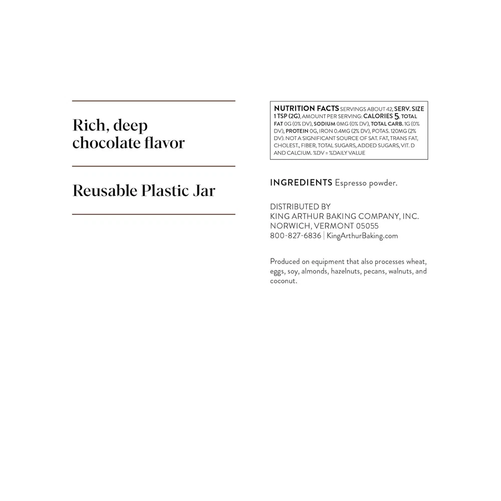 Store New Arrivals Add to Favorite View Feedback Espresso Powder: Premium Baking Extract for Rich Chocolate Flavoring, 3 Oz Reusable Jar, Kosher Certified - Enhance Your Desserts with Instant Coffee Intensity Description Item model number 4447C Unit Count 3.0 Ounce Number of Items 1 Product Dimensions 2.5 x 2.5 x 3 inches; 3 ounces Country of Origin USA Specialty Kosher Certified Flavor Name Espresso Powder Units 3.0 Ounce Flavor Espresso Powder Is Discontinued By Manufacturer No Size 3 Ounce (Pack of 1) Flavor Enhancer: Intensify your chocolate recipes with this premium espresso powder, adding depth and richness to brownies, cookies, and cakes without imparting a coffee taste. Perfect for elevating your baking extracts and flavorings collection Versatile Usage: Ideal for various baking applications, including frostings and sauces. Add 1/2 to 2 teaspoons to chocolate baked goods or frosting. Add to your collection of flavor extracts and flavorings for baking. Premium Quality: Made by King Arthur, a trusted name in baking since 1790. This instant espresso powder for baking is carefully crafted to enhance your culinary creations with superior flavors and aroma Convenient Packaging: Comes in a 3 oz reusable plastic jar, perfect for keeping your espresso powder flavor extract and easily accessible. The compact size is ideal for home bakers and professional kitchens alike Trusted Brand: King Arthur Baking Company, founded in 1790, is America's oldest flour company. As a 100% Employee-Owned business, we're committed to providing the highest quality baking products and inspiring recipes for our customers Elevate your baking with King Arthur Espresso Powder, a premium baking extract that transforms chocolate creations into culinary masterpieces. This versatile instant espresso powder enhances the rich, deep flavors of your favorite chocolate recipes without adding a distinct coffee taste. Perfect for home bakers and professional chefs, this 3 oz reusable plastic jar is an essential addition to your collection of extracts and flavorings for baking. Use it to amplify the taste of brownies, chocolate chip cookies, devil's cake, and other chocolate-based desserts. The recommended usage is 1/2 to 2 teaspoons per recipe, allowing you to control the intensity of the flavor. For smooth, fleck-free buttercream or frostings, simply dissolve 1 tablespoon of espresso powder with 1 tablespoon of heavy cream or water before adding it to your mixture. This instant espresso powder for baking acts as a natural flavor enhancer, bringing out the nuances of chocolate and other complementary ingredients. The result is a more complex, satisfying taste that will have your friends and family raving about your baked goods. King Arthur, a trusted name in baking since 1790, has carefully crafted this espresso powder to meet the highest standards of quality. As a 100% Employee-Owned Company, King Arthur is committed to providing top-notch baking products that inspire both novice and experienced bakers. The convenient 3 oz size is perfect for home use, while still providing enough product for multiple recipes. The reusable plastic jar ensures that your espresso powder stays and easily accessible whenever inspiration strikes. Certified kosher, this espresso powder is suitable for those following kosher dietary guidelines. It's a versatile flavoring that can be incorporated into a wide range of recipes, from traditional chocolate desserts to innovative culinary creations. ABOUT US We offer the best prices around on high quality products. Our E-store includes media such as books, movies, music and games while offering electronics, toys, sporting apparel, clothing, tools, general home, garden items and more. SHIPPING We are always working hard to ensure your package arrives as soon as possible. Please understand that some factors like weather, high postal traffic, and the performance of shipping companies are outside of our control. We offer free shipping to the lower 48 states and ship within 2 business days of payment, usually sooner. We do not accept P.O. Boxes. Please provide a physical address. RETURNS We offer a 30-Day Return Policy on items which you are not completely satisfied with. You have the option for a full-refund or an exchange of the item. No returns are available on items shipped outside of the USA. PAYMENT We accept PayPal. CONTACT US This page content is yet to come Please ad us to your favorite seller and visit again later Thank You