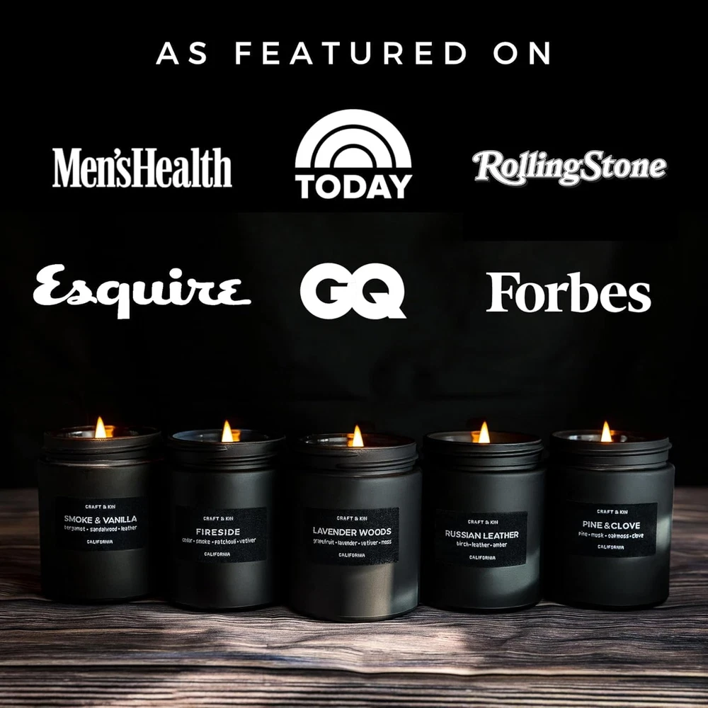 MASCULINE ELEGANCE: Immerse yourself in the magical allure of our fall scented candles crafted specifically for men. Designed to capture the essence of the season and the cozy warmth of masculine charm, these candles are an irresistible delight. Perfect for those who savor luxury and the comforting scents of the season, each gift comes in captivating, ready-to-give packaging. Elevate your gift-giving experience with this thoughtful and unforgettable present for any man deserving of a touch of elegance. PREMIUM SOY CANDLE: These 100% natural soy wax, wood wick fall candles are safe to use and long-burning. This Fireside aromatherapy candle for home is made with essential oils that bring you a strong masculine fragrance to your home. CANDLE FOR MEN: Have you looked for a candle for men for a long time? We’ve designed the perfect one for you and your loved ones. It comes with a strong masculine scent and a stylish black design. LONG LASTING SCENT: This 7.6 oz scented candle will bring in the masculine notes of cedar, smoke, patchouli, and vetiver to your home. Enjoy this luxury candle made with the finest essential oils to bring you a lasting and strong scent. OUR MISSION: The Craft & Kin Collection is carefully designed and crafted with your home and family in mind. We believe that your home should be a collection of people and things you love. Our mission is to help you craft a little more of that love with your kin. Product Description Aromatherapy candle These soy candles are made with strong essential oils that will create an enjoyable ambiance in your home. 100% Natural Soy Wax Each candle is made with 100% premium soy wax. Strong Essential Oils A highly scented candle made with a blend of essential oil mixtures. Wood Wick Featuring a wood wick for the ultimate "fireplace"-like atmosphere. Elegant Packaging Our scented candles come in a giftable black box for the ultimate experience. 1 100% Natural Soy Wax 2 Strong Essential Oils 3 Wood Wick 4 Elegant Packaging Fireside Featuring the masculine notes of cedar, smoke, patchouli, and vetiver. Lavender Woods The mystical notes of grapefruit, lavender, vetiver, and moss. Pine & Clove Woodsy pine, musk, oakmoss, and clove mix together in this earthy scent. Smoke & Vanilla Bergamot, sandalwood, leather, and vanilla meet to form this unique blend. Vintage Leather A blend of birch, amber, Vintage leather, and cedarwood. 1 Fireside 2 Lavender Woods 3 Pine & Clove 4 Smoke & Vanilla 5 Vintage Leather