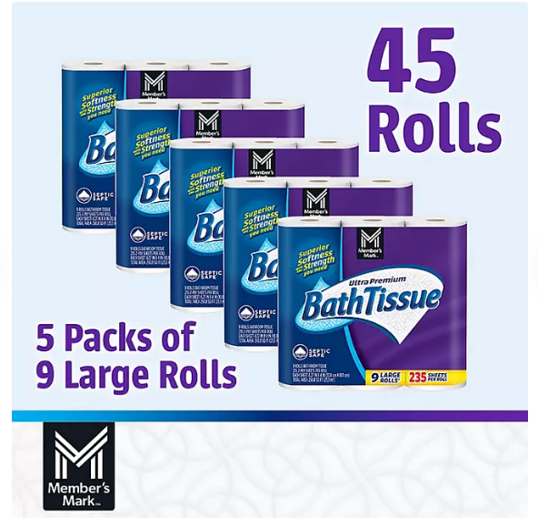 Dominate Deals Welcome to Dominant Deals! Explore amazing products at unbeatable prices. If you need any help, we're here for you. Happy shopping! HIGHLIGHTS Package contains 45 rolls, 235 sheets/roll Total sheets 10,575 Superior softness with the strength you need 2-ply sheets produce less lint and are tested septic safe 45 large rolls = 1,254 sq. ft. total PRODUCT OVERVIEW Get a comfortable, confident clean with Member's Mark Ultra Premium Bath Tissue, 2-Ply Large Roll (235 sheets, 45 rolls). Member's Mark bath tissue is soft, strong and incredibly absorbent, with more sheets per roll than other leading brands. How Does Member's Mark Ultra Premium Bath Tissue Compare to Leading Brands? Member's Mark Ultra Premium bath tissue is crafted with superior softness, comparable to other leading brands, with the strength you need for a confident clean. Unlike the leading brands, Member's Mark bath tissue produces less lint and gives you substantially more sheets per roll. With 235 sheets per roll, you can use fewer sheets. The soft bath tissue is also backed by Member's Mark 100% satisfaction guarantee; if for any reason you're unsatisfied, we'll refund or replace your purchase. Is the Ultra Premium Bath Tissue Safe for Older Septic Systems? Member's Mark bath tissue is rigorously tested to ensure that it's safe for all septic systems. Each roll has more sheets, so you use less product, helping septic systems break down the bath tissue more efficiently. Soft Bath Tissue That Lasts Member's Mark bath tissue doesn't just give you more per roll. The premium bath tissue comes in a large, 45-roll count for 1,254 square feet of bath tissue, even more value than the leading brands.3 SHIPPING GUIDELINES We offer FREE shipping on all orders! Items are usually dispatched within 3-4 business days of payment, with delivery typically taking 3-5 business days after shipment. If your item is lost or there's an unexpected shipping delay, please reach out to us and we?ll assist you with a refund. RETURN GUIDELINES Customers can return the product within 30 days of purchase if they?re not fully satisfied. The item must be returned in its original packaging, and the customer is responsible for return shipping costs. THANK YOU H