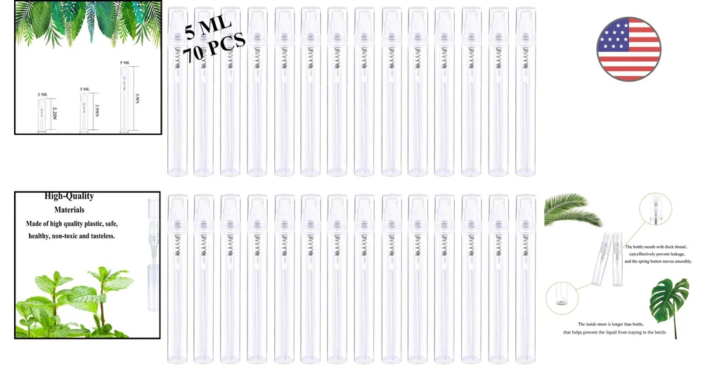 Premium Spray Bottles - 70PCS 5ML - Clear Plastic - Perfume Mouthwash Atomizer ‹ › ‹ › ‹ › ‹ › ‹ › ‹ › ‹ › ‹ › ‹ › Premium Spray Bottles -70PCS 5ML - Clear Plastic - Perfume Mouthwash Atomizer Features: Comes with 70 PCS of mini spray bottles, each with a capacity of 5ml. Made of high-quality plastic, BPA free, durable, odorless, non-toxic, and environment-friendly. Compact and portable, suitable for travel, vacation, gym, etc. Good leak-proof function. TSA carry-on approved size. Widely applicable for perfume, essential oil, makeup remover, air freshener, toiletry, and more. Benefits: Convenient and practical with 70 mini spray bottles. High-quality material ensures safety and durability. Compact and portable for easy carrying. Leak-proof design prevents spills and waste. TSA approved size for hassle-free travel. Wide range of applications for various liquids. Why choose our Premium Spray Bottles? Looking for a reliable and convenient way to carry your perfume or essential oils? Our Premium Spray Bottles are the perfect solution. With 70 mini spray bottles, each with a capacity of 5ml, you'll have enough to meet your daily usage needs. Made of high-quality plastic, these bottles are durable, odorless, and non-toxic, ensuring your safety. The compact and portable design makes them ideal for travel, vacation, or the gym. Plus, the leak-proof function and TSA approved size make them hassle-free to carry on the airline. Whether you need them for perfume, essential oils, makeup remover, or any other mixture, our Premium Spray Bottles are versatile and reliable. Don't settle for inferior alternatives - choose our Premium Spray Bottles for quality and convenience. Order your set of Premium Spray Bottles today and experience the difference! Shipping Free & Fast Shipping - We offer free shipping to most of the USA with a normal delivery time of 3-7 days. However, due to the current situation, additional delivery time (up to 3 weeks) may be required for some items. Alternative Carriers - We may use alternative carriers (e.g. USPS, FedEx, UPS, etc.) to ensure your package arrives safely and on time. Due to the use of multiple carriers, we are unable to provide a tracking number automatically. Handling Time - Orders are processed and shipped within 1-2 business days of receiving cleared payment. Shipping Restrictions - Shipping to Alaska, Hawaii, Puerto Rico, Guam, and other US territories may incur shipping charges or delivery restrictions. Please contact us before ordering, or your order can be refunded/cancelled. State Restrictions - There may be restrictions based on your state of purchase. For example, certain items may not be shipped to California due to state regulations. Contact for Tracking Updates - If you require tracking updates or have any concerns about the delivery of your order, please feel free to contact us, and we will be happy to assist you. Return 30-Day Hassle-Free Returns - We want you to be completely satisfied with your purchase. If you are not, you can return the item within 30 days of receiving it for a full refund or exchange. Easy Return Process - To start a return, simply contact us and we will provide you with a prepaid return shipping label and detailed instructions. Restocking Fee - There are no restocking fees for returns. However, the buyer is responsible for return shipping costs if the return is not due to a seller's error. Refund Processing Time - Refunds will be processed within 5 business days of receiving the returned item in its original condition. Payment We accept all major credit cards, PayPal, and Apple Pay for your convenience. Your payment information is secure and encrypted to ensure a safe and seamless transaction. Please complete your payment within 3 days of purchase to avoid any delays in shipping. Feedback Your feedback is extremely important to us. We strive to provide the best products and customer service possible. If you are satisfied with your purchase, please take a moment to leave us a positive review. If you have any concerns or issues with your order, please contact us before leaving negative feedback. We are committed to resolving any problems and ensuring your satisfaction. Contact Us If you have any questions or concerns, please feel free to reach out to our customer support team. You can contact us through the eBay messaging system. We are available Monday to Friday, 9:00 am to 5:00 pm EST, and we will do our best to respond to your inquiry within 24 hours. Thank you for supporting our small family business!