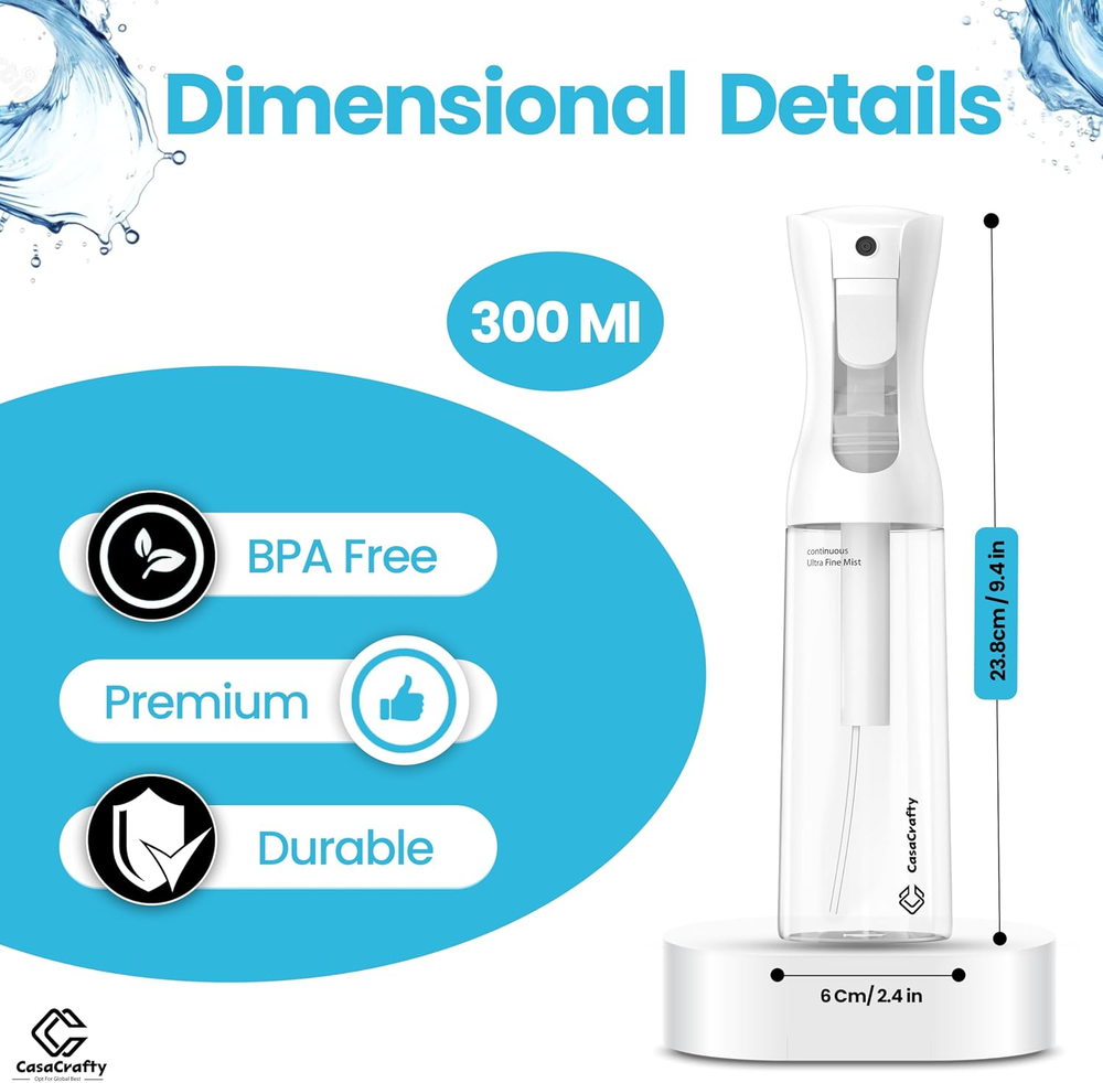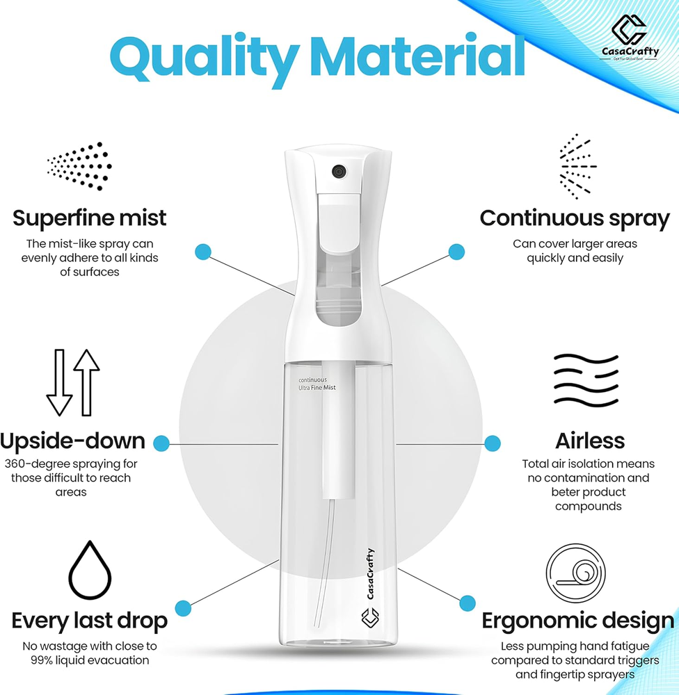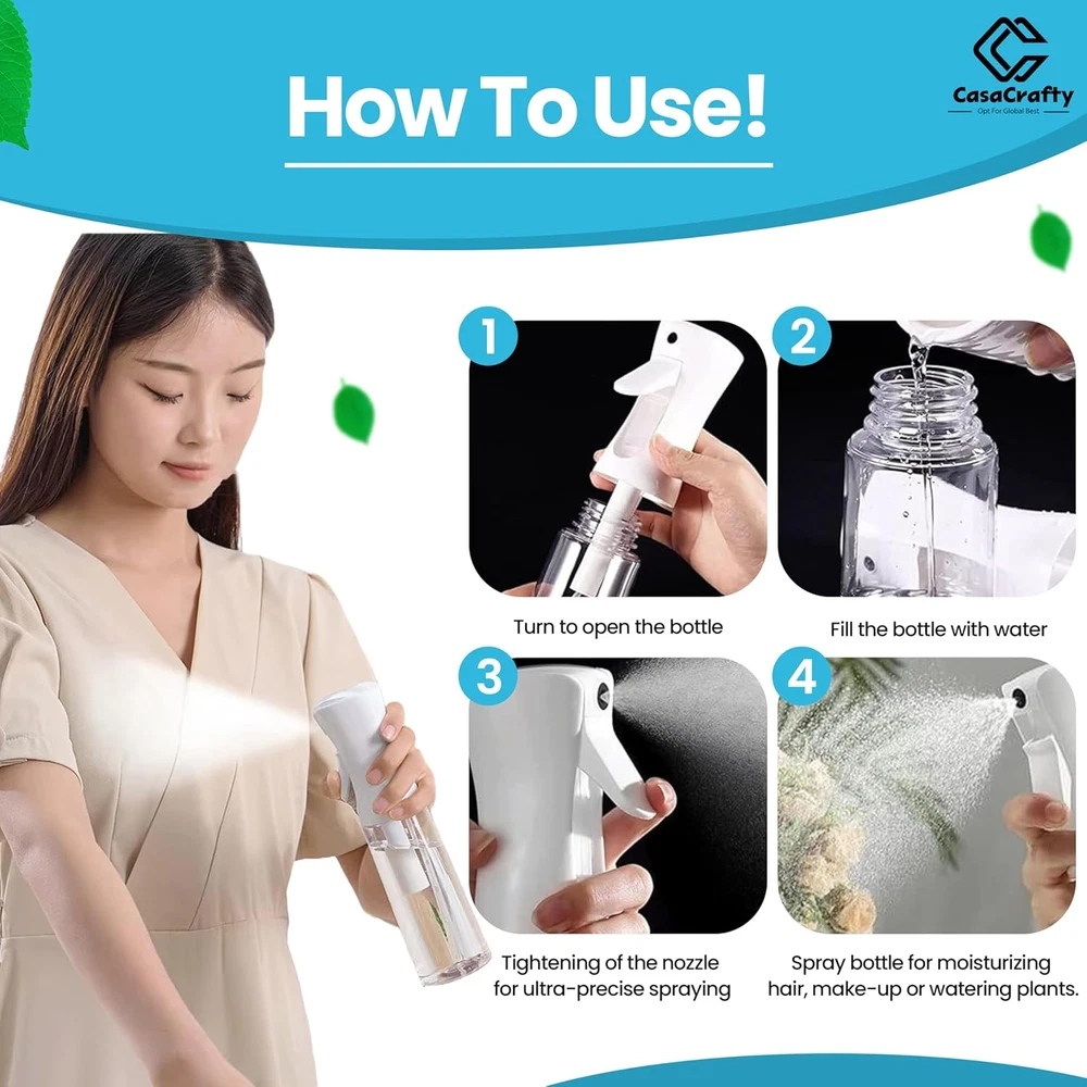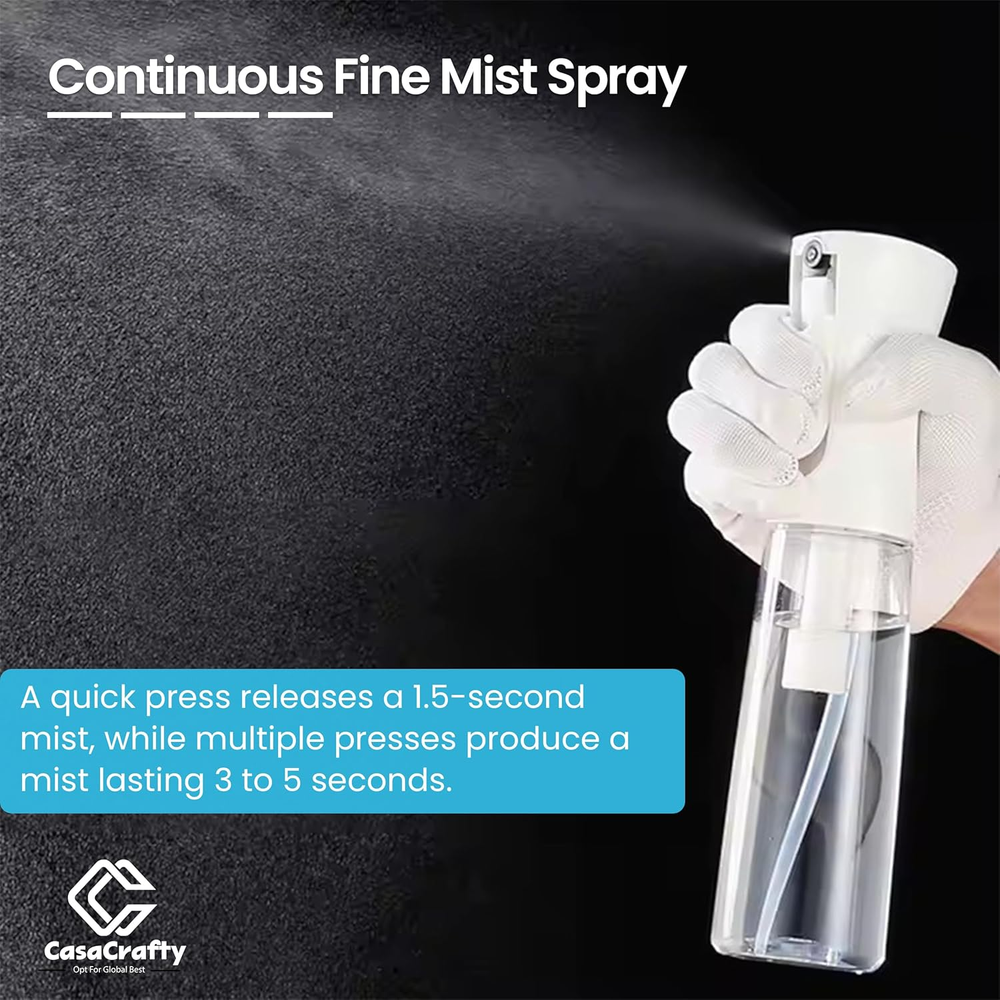 PRO-DESIGN: The expertly crafted Casacrafty spray bottle continues to redefine excellence in the spray industry. Featuring an elegant design and advanced engineering, it uses robust pre-compression technology to deliver a continuous, 0.3mm ultra-fine mist that lasts up to 1 second. With multiple full-trigger strokes, it ensures smooth, consistent, and effortless spraying every time. LEAK-PROOF & 360° SPRAY FUNCTIONALITY: Designed with a secure threaded mouth and a reliable leak-proof seal, our innovative spray bottle keeps liquids contained without any mess. Enjoy effortless 360-degree spraying, perfect for reaching tricky spots and evenly covering large surfaces with ease. MULTI-PURPOSE WONDER: Versatile and practical, this ultra-fine mist spray bottle is perfect for countless tasks at home or on the go. Ideal for professional salon use or your daily hair and body care routine, it also excels in self-tanning, home cleaning, disinfecting, pet grooming, plant care, car detailing, arts and crafts, and so much more! SPRAY BOTTLE FOR HAIR: This fine mist spray bottle is perfect for styling, refreshing curls, or dampening hair evenly. With a continuous spray function and ergonomic design, it’s ideal for salons or daily use. Lightweight, leak-proof, and BPA-free, it’s a must-have for effortless hair care at home or on the go! SUSTAINABLE & REUSABLE: Made from durable PET materials, this mist spray bottle is designed for long-lasting use. It’s easy to refill and reuse, making it perfect for creating your own custom liquid blends at home. NOTE: Before first use, press the trigger 10 times to prime the system and begin spraying. For best performance, do not fill the bottle with thick or viscous liquids, as this may affect atomization quality. Product Description Easy Fill Press Mechanism Continuous Spray