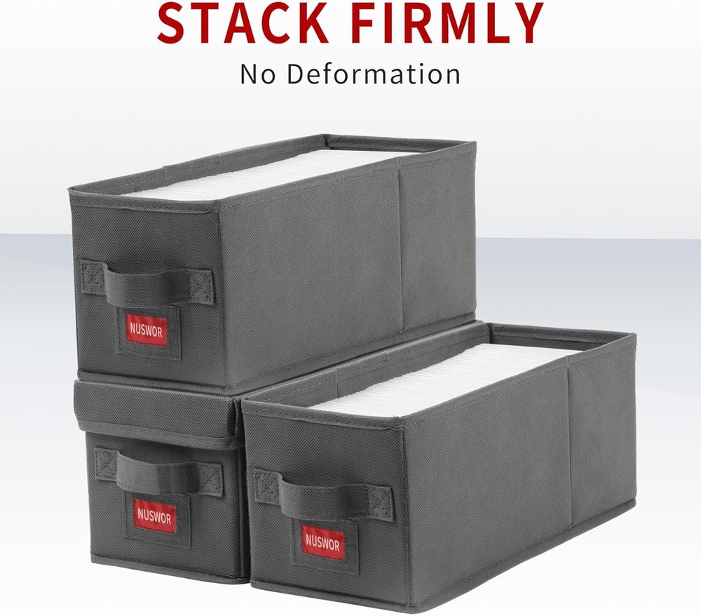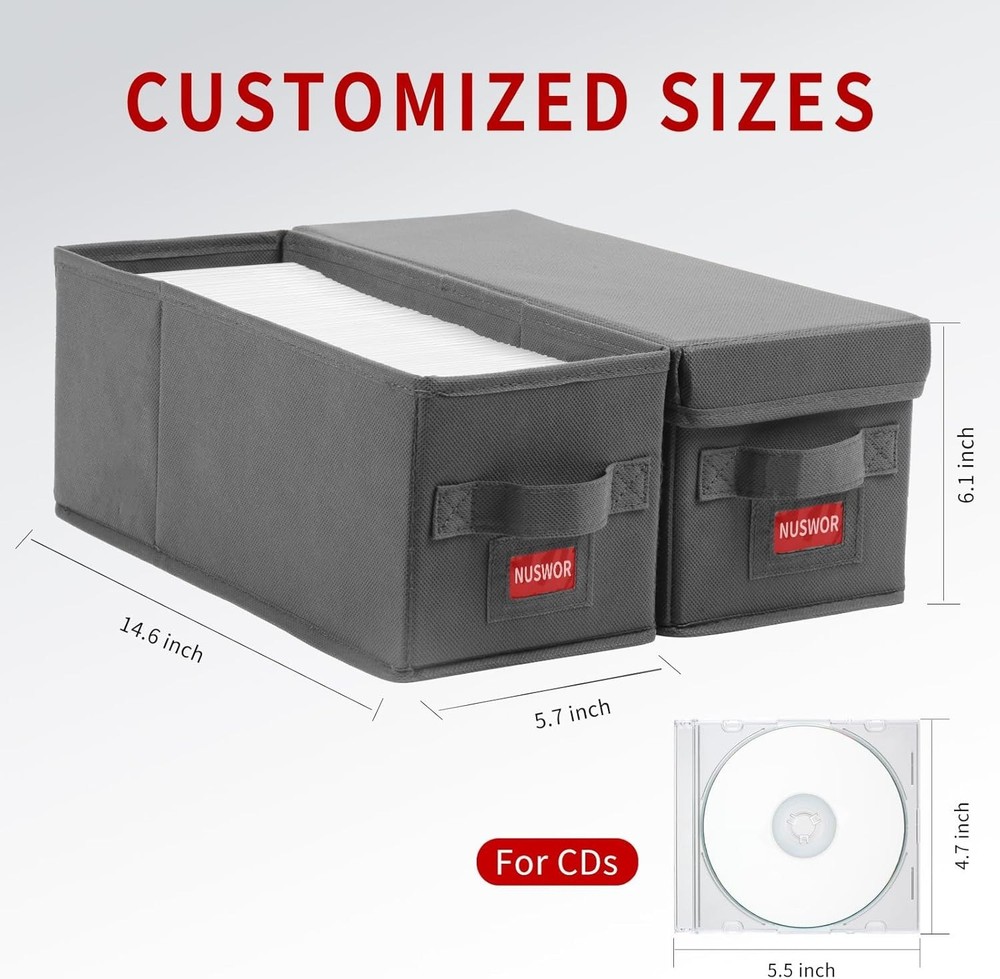 Premium CD Storage Box - Stackable CD Organizer Box with Lid - Holds 70 Jewel Cases - 14.37 x 5.5 x 6.3 inches - 3 Pack - Grey 【Versatile CD Storage】Unclutter your scattered CD collections and keep your space tidy with our smart CD storage boxes. Designed to hold up to 35 jewel-case, 70 slim-case, or 200 CDs in sleeves, it's a real lifesaver for CD enthusiasts! 【Stackable and Space-Saving Design】Our CD storage boxes have a dimension of 14.37x5.7x6.3 inches, perfect for stacking and maximizing your storage space. Say goodbye to messy spaces and hello to an organized lifestyle! 【Stackable and Space-Saving Design】Our CD storage boxes have a dimension of 14.37x5.7x6.3 inches, perfect for stacking and maximizing your storage space. Say goodbye to messy spaces and hello to an organized lifestyle! 【Protective CD Storage】Features lids to keep dust and scratches away. Our CD box storage has been meticulously designed to keep your CDs, DVDs, and tapes in mint condition. 【Convenient CD Storage Shelves Alternative】Fed up with bulky CD shelves? Try our compact and lightweight CD case organizer. It's a perfect combination of convenience, space-efficiency, and visual appeal!