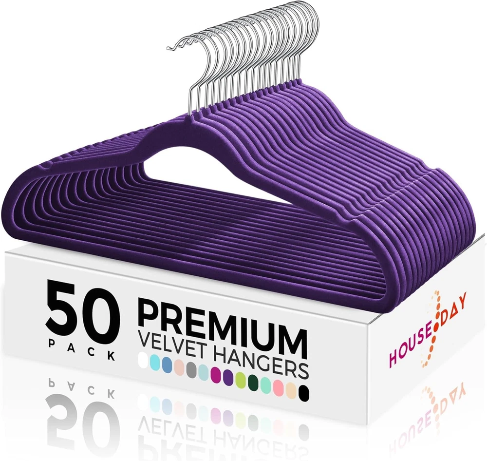 About this item Non-Slip Design - The specially developed shoulder line is added to promise worry-free preservation of the clothing's shape. There are grooves on each shoulder that can be used to hang clothes with thin shoulder straps, great without slipping off tightly for your tank tops, dresses, bras, ties, belts, nightgowns, shawls, and skirts Space Saving Design - The ultra-thin design with an optimal size of 17.5"L x 1/4"W x 9"H each hanger maximizes the storage space and makes full use of your wardrobe and room to make it clutter-free. Increases closet space by up to 75 percent. A galvanized metal hook with a 360-degree swivel meets your different hanging angle needs, good for easy clothing sorting, a perfect combination Durable & Sturdy - Crafted from high standard grade ABS Plastic that has been enhanced over time. Rest assured it will steadily hold heavy clothing of up to 11lbs. A durable black velvet hanger that is sturdy and durable enough to fully meet your daily needs of hanging coats, suits, long skirts, shirts, T-shirts, etc Protecting Your Clothes - Soft and luxurious velvet, unlike plastic or metal hangers, is innocuous to both skin and garments. To keep the fuzz from shedding off and stain your clothing, we used the finest velvet material for all our velvet hangers; while also protecting your clothes from deformation or wrinkles 360 Degree Swivel Hook - Revolutionize closet accessibility with a 360° swivel hook. Effortlessly reach clothes from any angle, making selecting and hanging garments a seamless experience with these versatile hangers Packaging Instructions - 15 pieces * 2 packs + 10 pieces * 2 packs , total 50 pieces. The Velvet-Hanger-50-Pack is an appropriate packaging setup suitable for daily use in households. The advanced technology we used is able to provide you the most premium product quality. If for any reason you are unhappy with our velvet hangers, please get in touch so we can make it right. Color: Black/ Silver Brand: Material: Velvet Product Dimensions: 17.5"W x 9"H Special Feature: Anti-Slip, Flexible, Lightweight, New Home Dorm Essentials, Space Saving